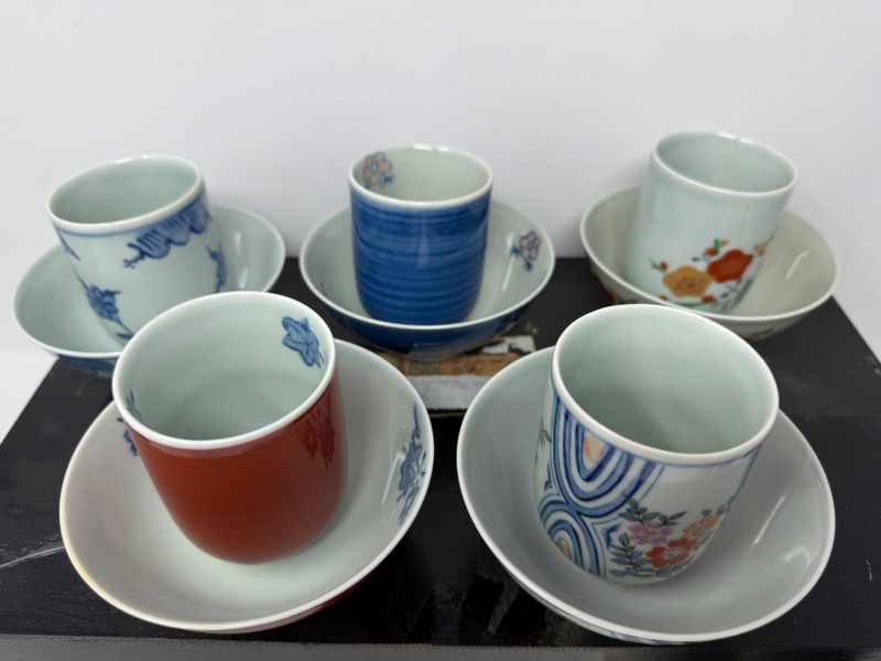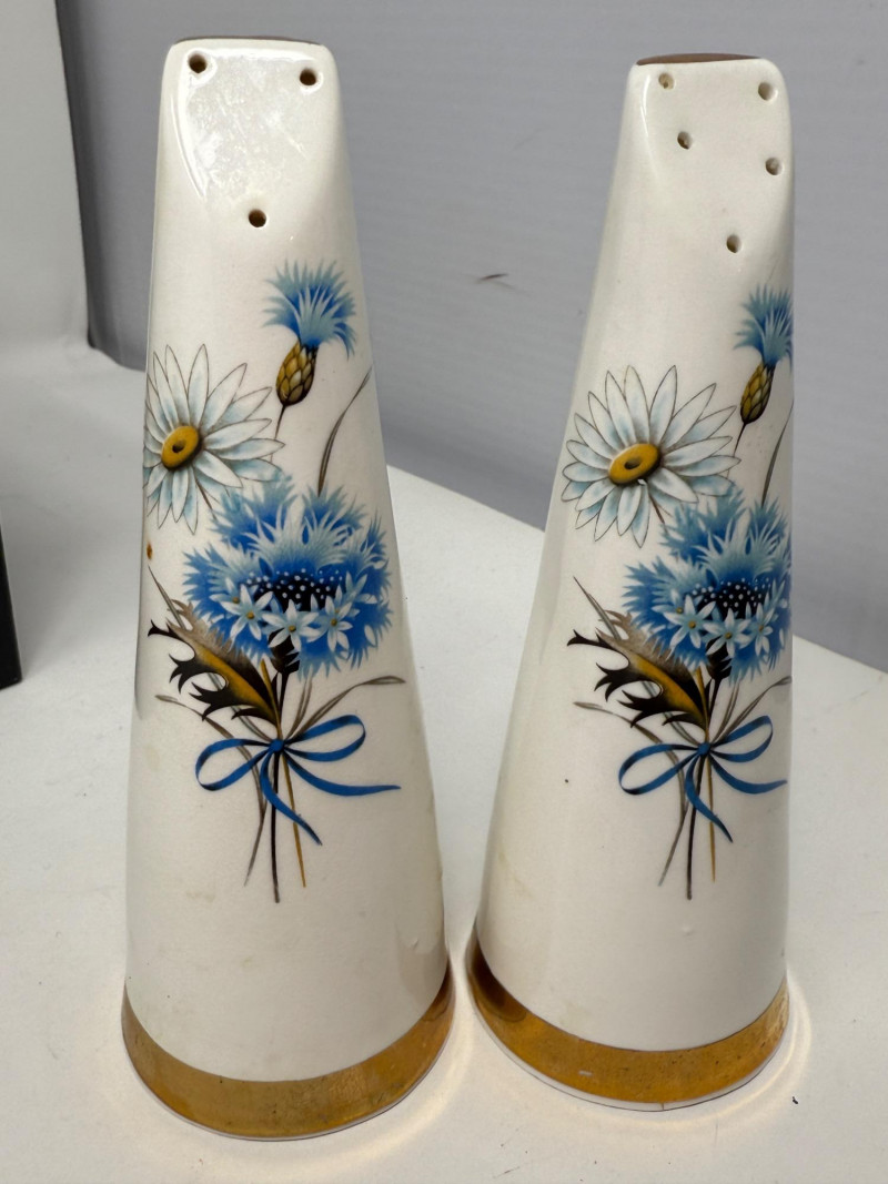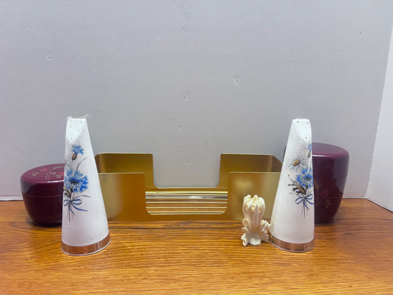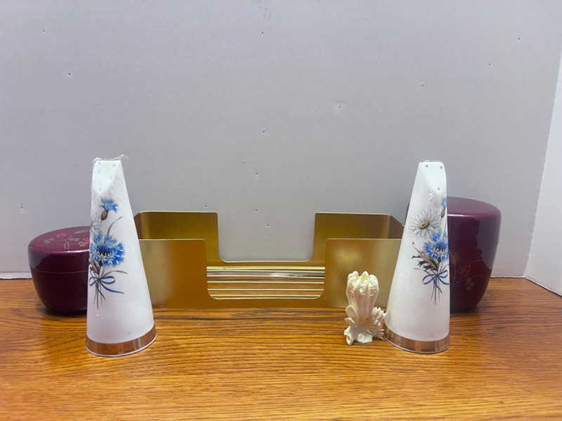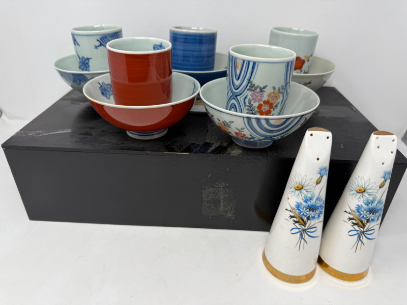 Royal Stuart 6” bone china salt and pepper shaker set 5 Colorful Cup and Bowl Sets in Storage Box carved coral toothpick holder (2) tea caddies.