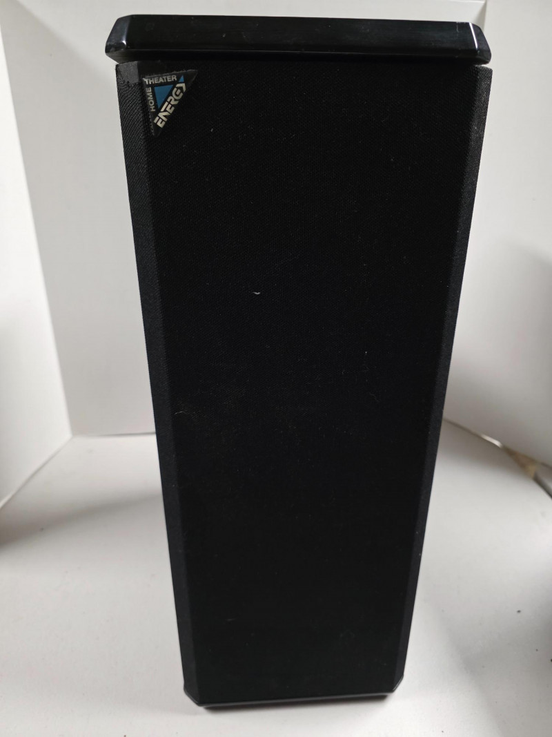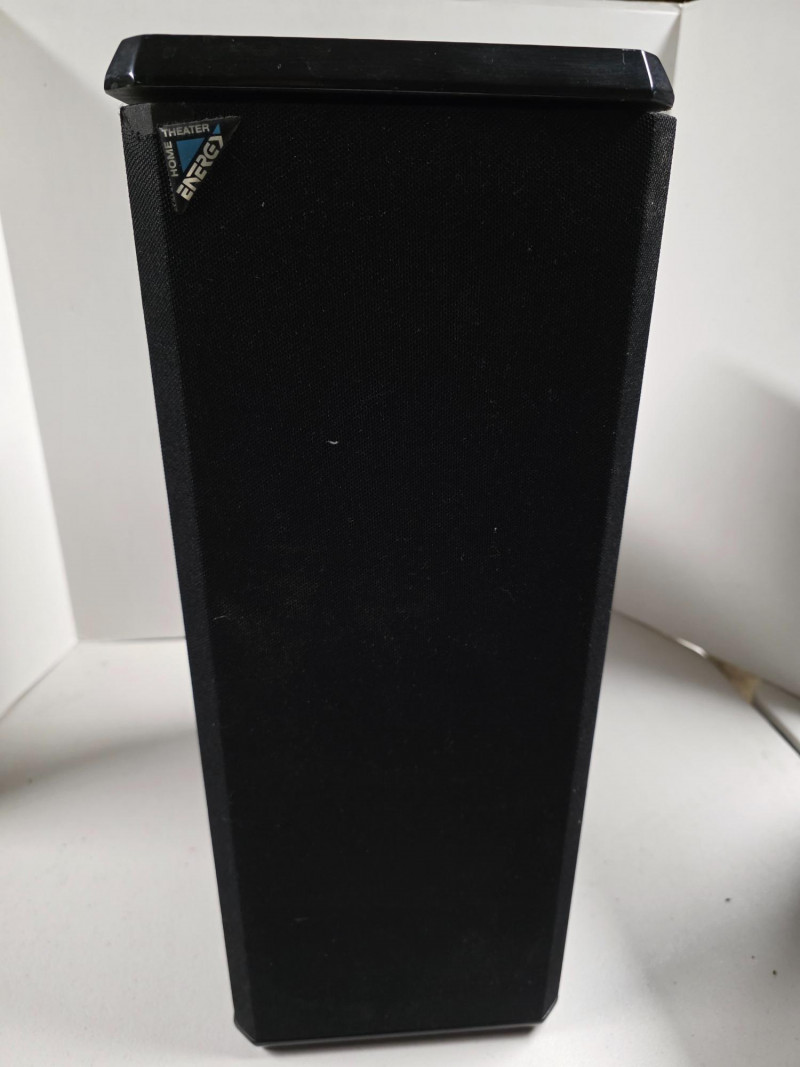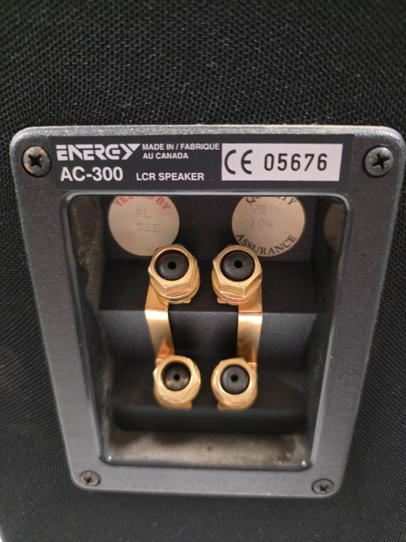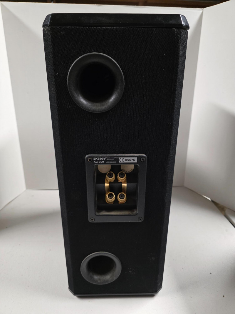 The Energy AC-300 LCR speaker was a Canadian-made, late 1990s or early 2000s speaker from Energy's Connoisseur series. It is a passive, two-way, left/center/right (LCR) channel speaker that was used for home theater applications Driver: One 1-inch aluminum dome tweeter and two 5.5-inch Injection Molded (I.M.) carbon/mica polypropylene woofers. Power handling: The speaker can handle up to 175 watts RMS. Nominal impedance: 8 Ohms. Connectivity: Wired connection with banana jack or raw cable jack audio inputs. Finish: The speaker was available in a piano black vinyl finish and features a wood cabinet. Weight: Approximately 20 lbs Removed from a working home theater system 19.5"T x 7.5"W x 13"D