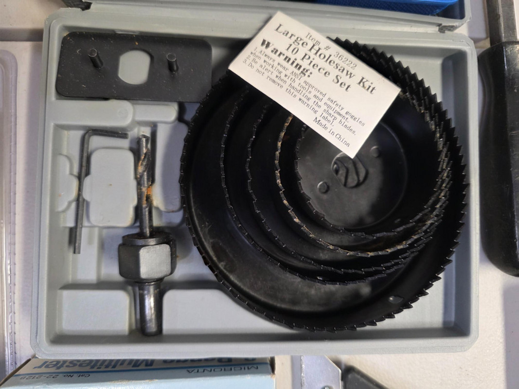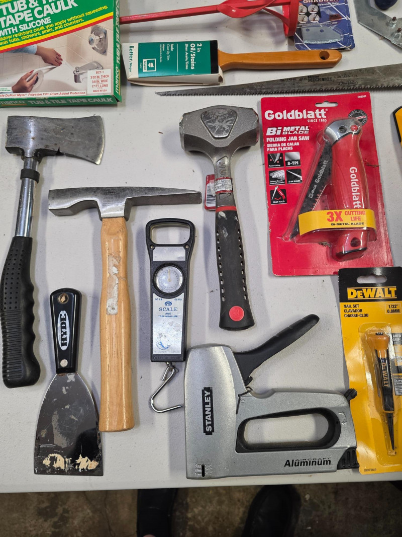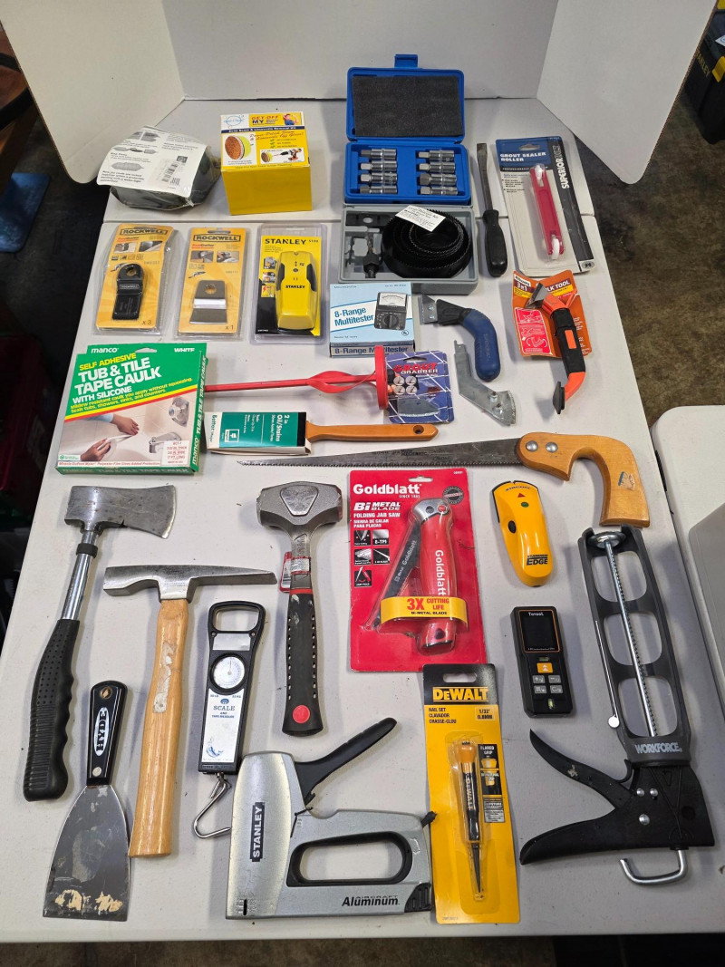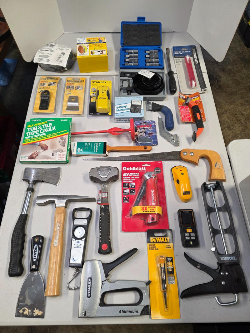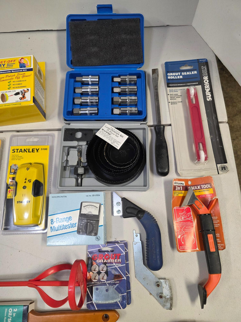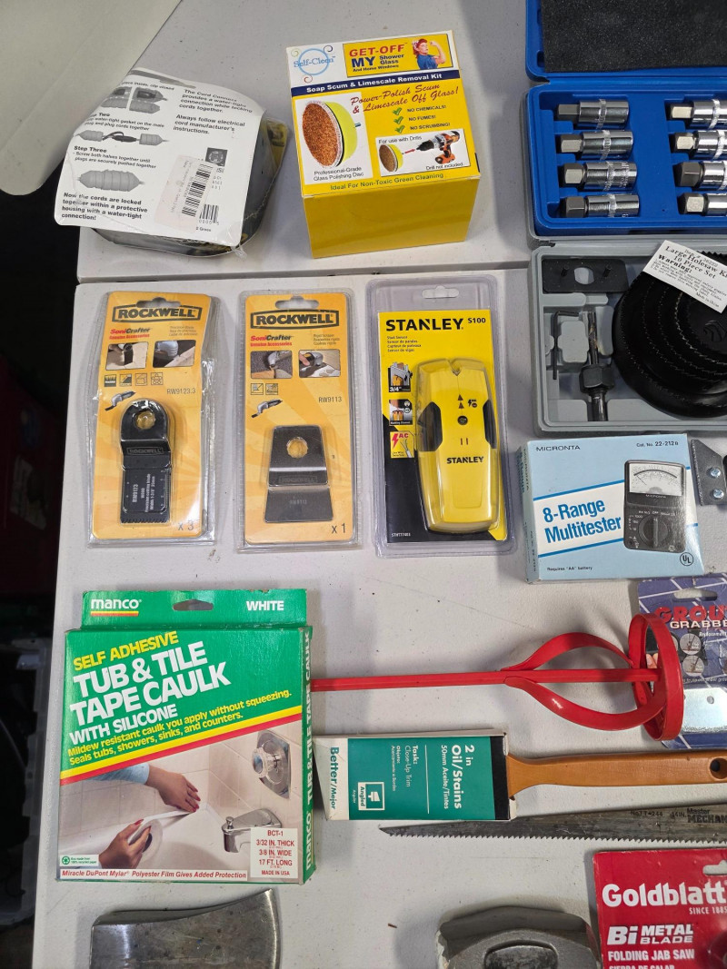 Miscellaneous Tools & Accessories (Some New In Box) 3lb drilling hammer, small hatchet, brick hammer, nail set, stapler, bi-metal blade saw, laser measuring device, stud finder, caulk gun, pait brush, pruning saw, mixer drill bit, grout tool with extra blades, multitester, oscillating tool blades large 10-piece holesaw kit, 8-piece 1/2" hex bit socket set, sanding blocks, screening spline, soldering pencils, shims and more! 70 pieces in all!
