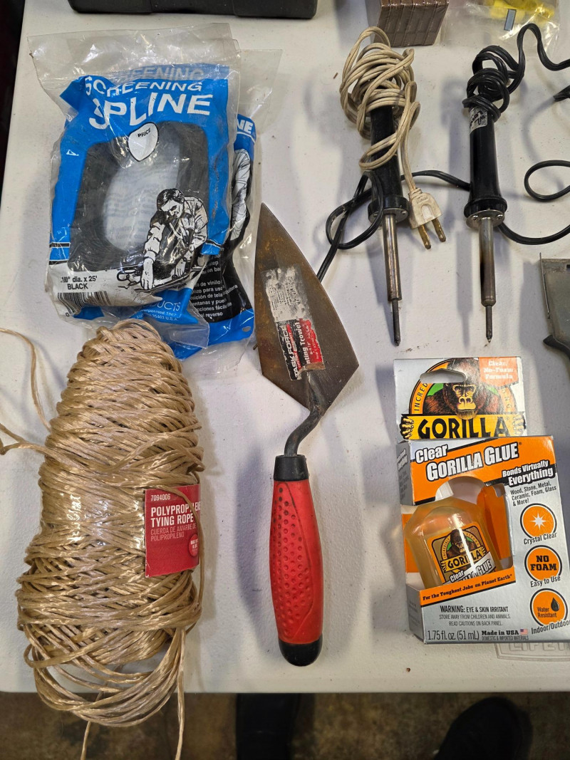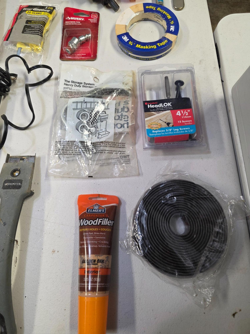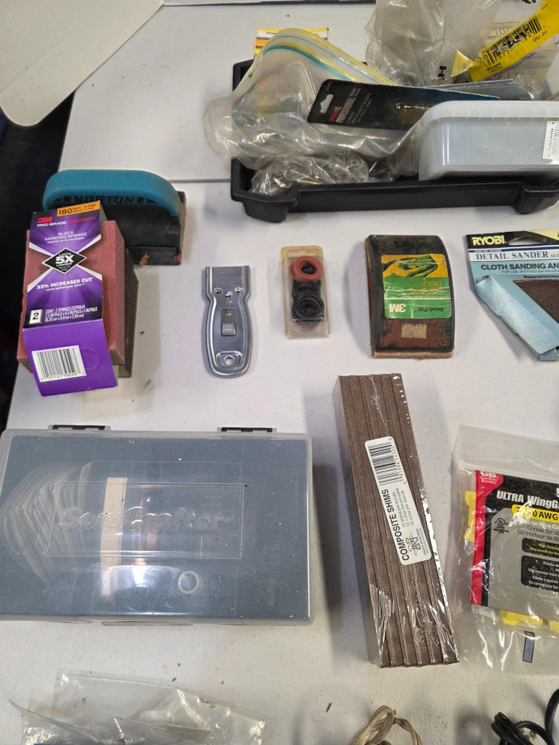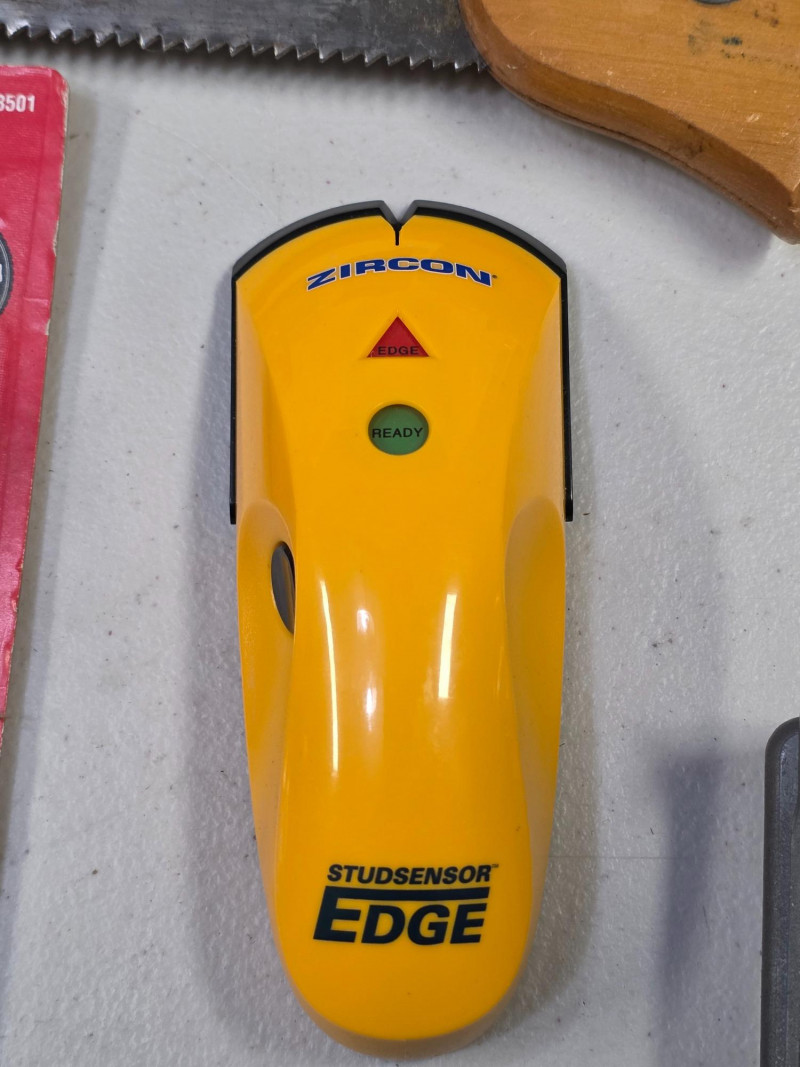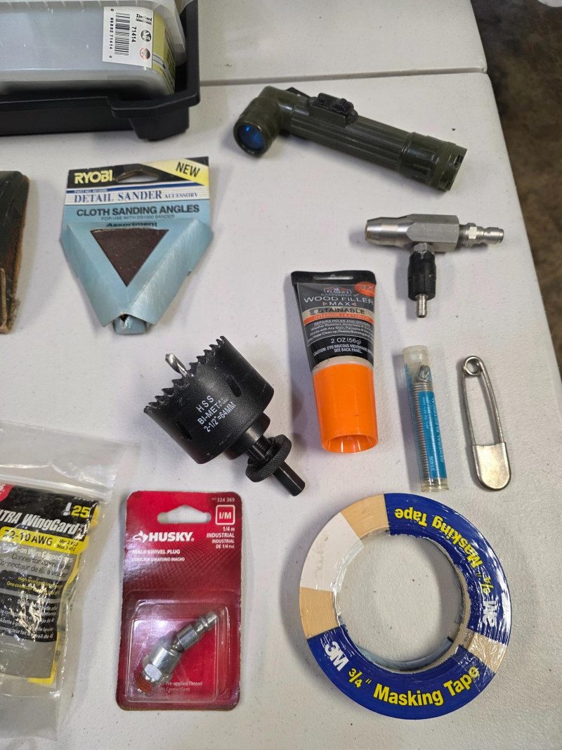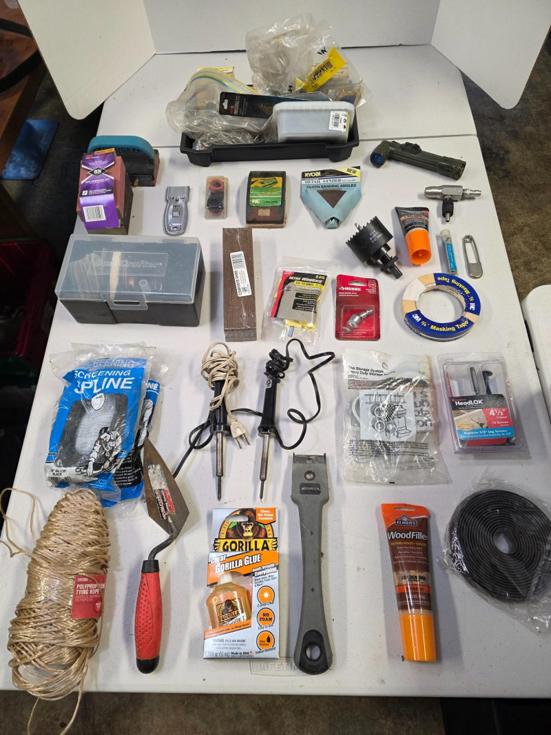 Miscellaneous Tools & Accessories (Some New In Box) 3lb drilling hammer, small hatchet, brick hammer, nail set, stapler, bi-metal blade saw, laser measuring device, stud finder, caulk gun, pait brush, pruning saw, mixer drill bit, grout tool with extra blades, multitester, oscillating tool blades large 10-piece holesaw kit, 8-piece 1/2" hex bit socket set, sanding blocks, screening spline, soldering pencils, shims and more! 70 pieces in all!