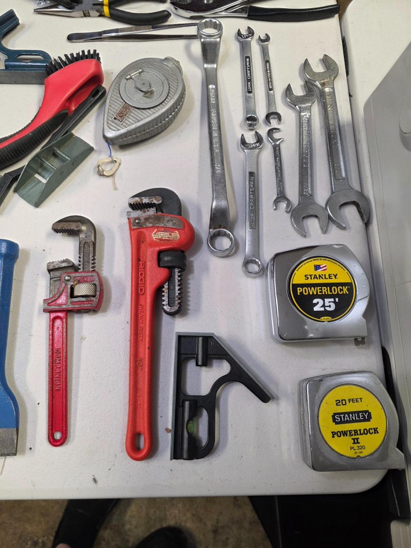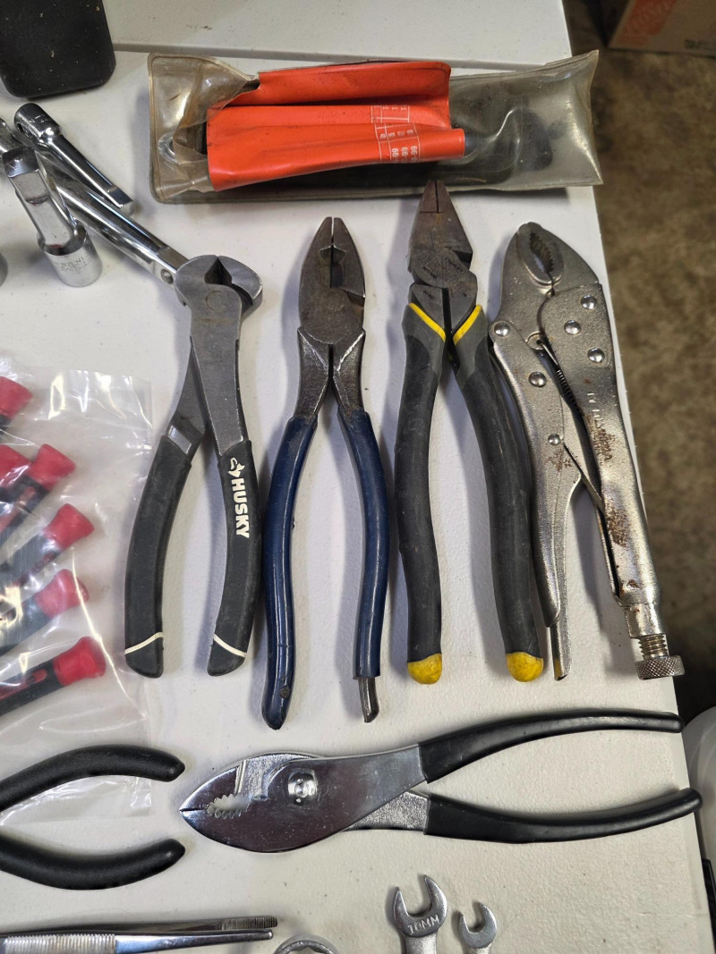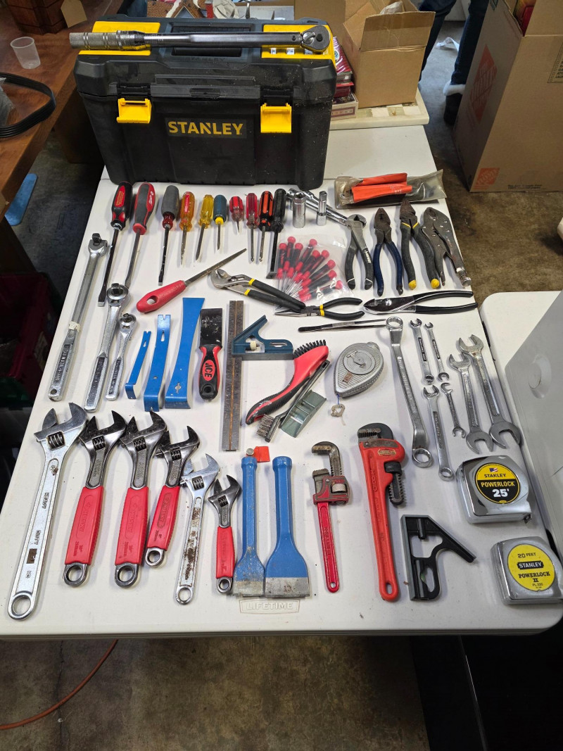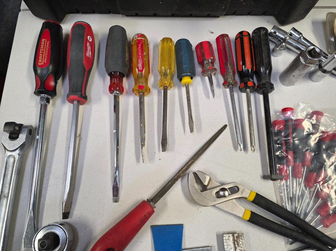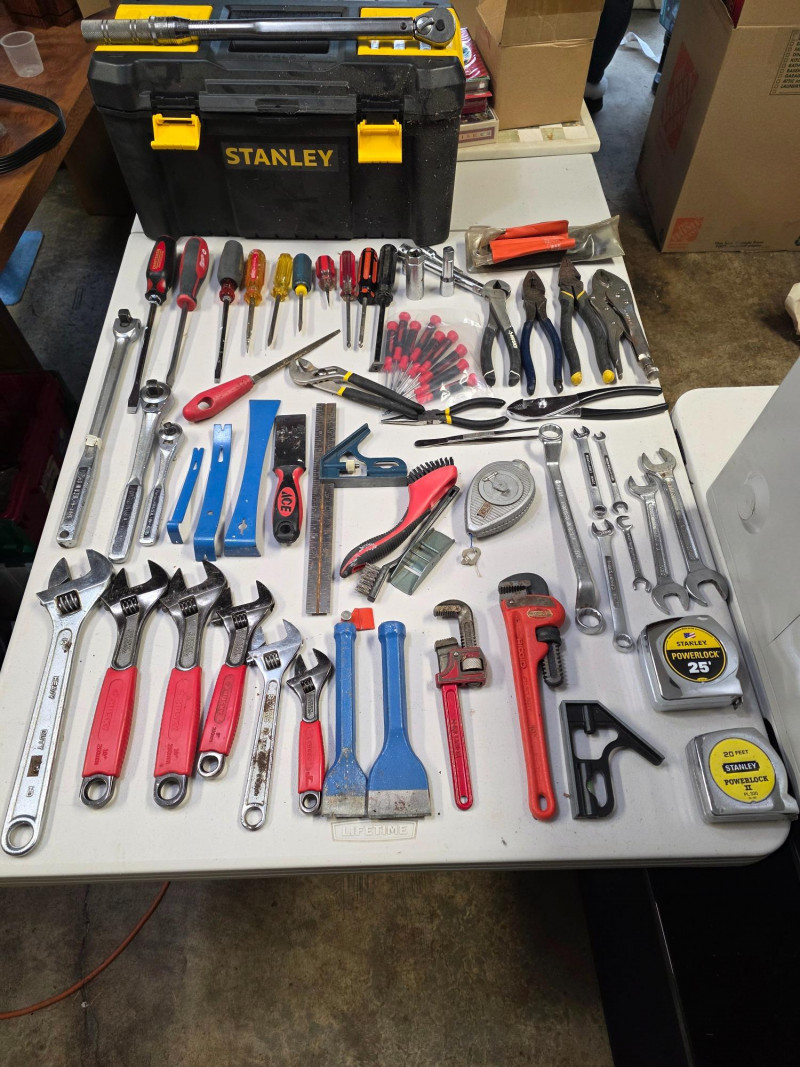 Toolbox Full Of Tools #2 Craftsman, Stanley, Husky, and much more! Screwdrivers, pliers, wrenches, torque wrench, adjustable wrenches, tape measures, ultra bars, brushes, chalk line, saws and more in a Stanley plastic toolbox About 90 tools in all!