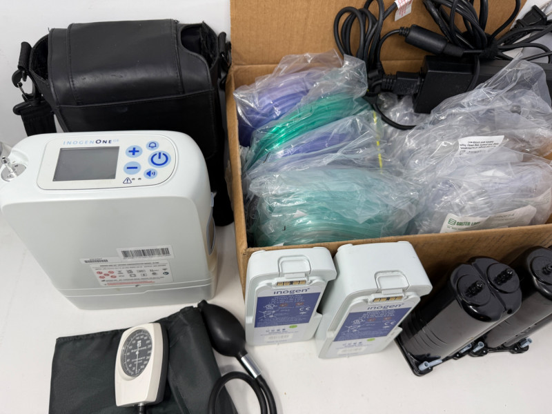 Portable Oxygen Concentrator - Tubing - Cannulas - Extras - BP Monitor Carry bag Power supply and car charger 4 Oxygen supply tubing 16 Cannulas 2 filters 3 batteries Bergen Brunswig BP Monitor