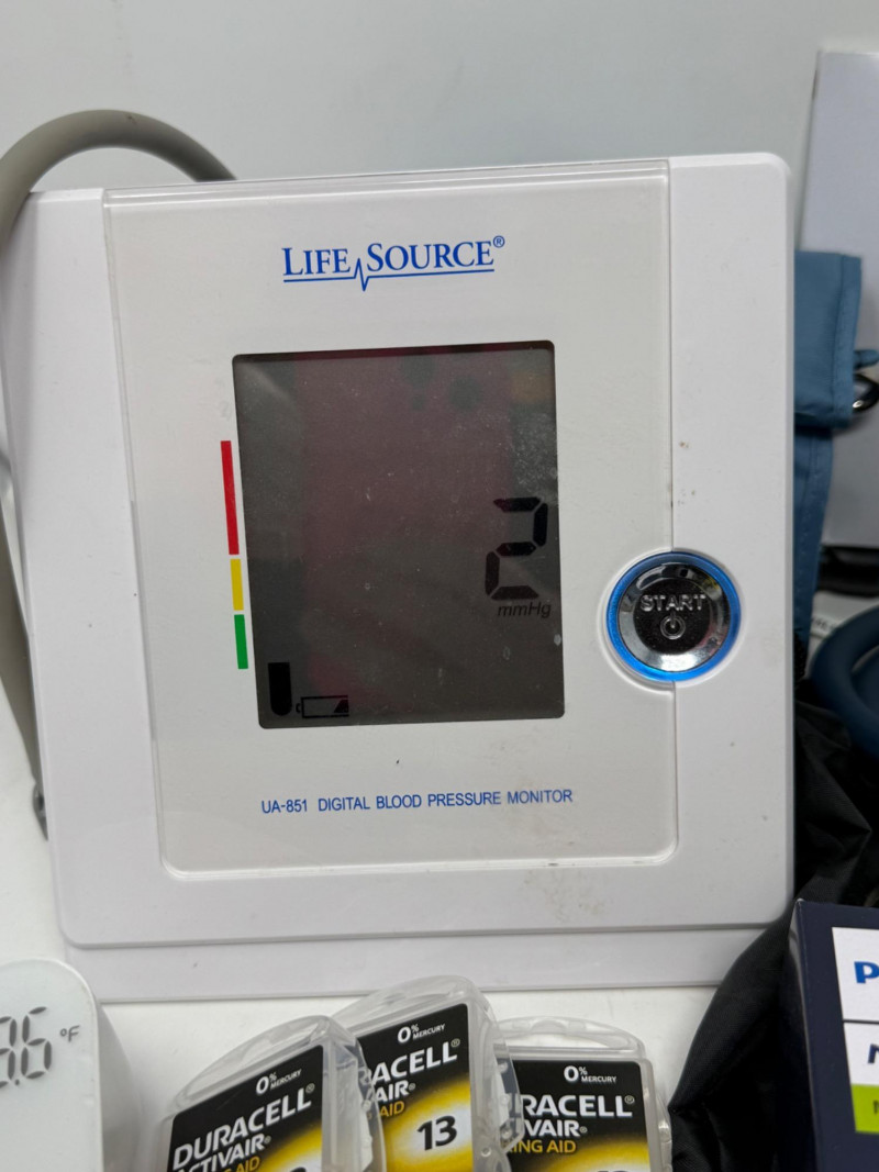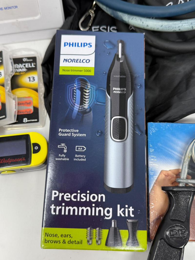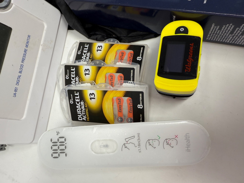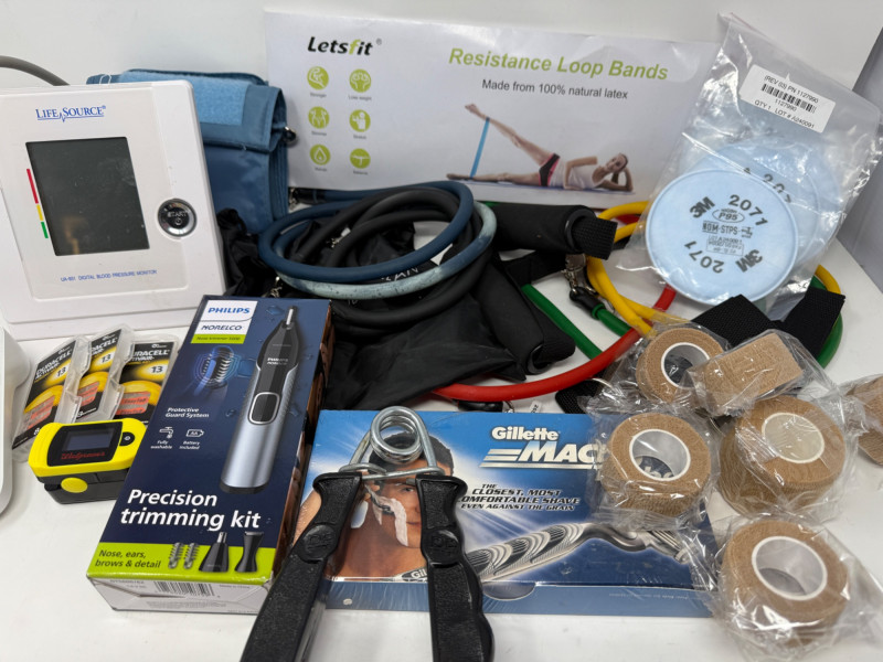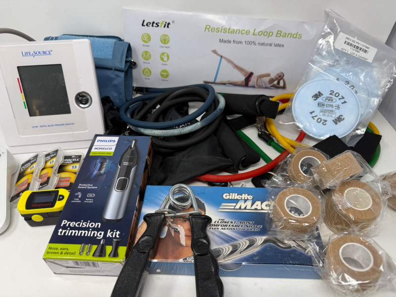 Home Health Care BP Monitor 2 Resistance band sets Blood oxygen monitor Forehead thermometer Cohesive bandaging razors personal groomer 5 P95 3M respirator filters 3 packages of 13 hearing aid batteries grip strength exerciser