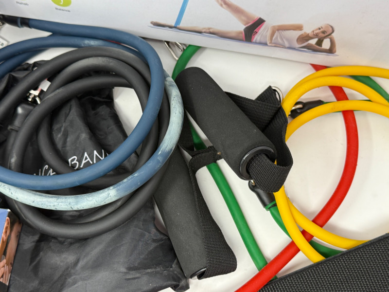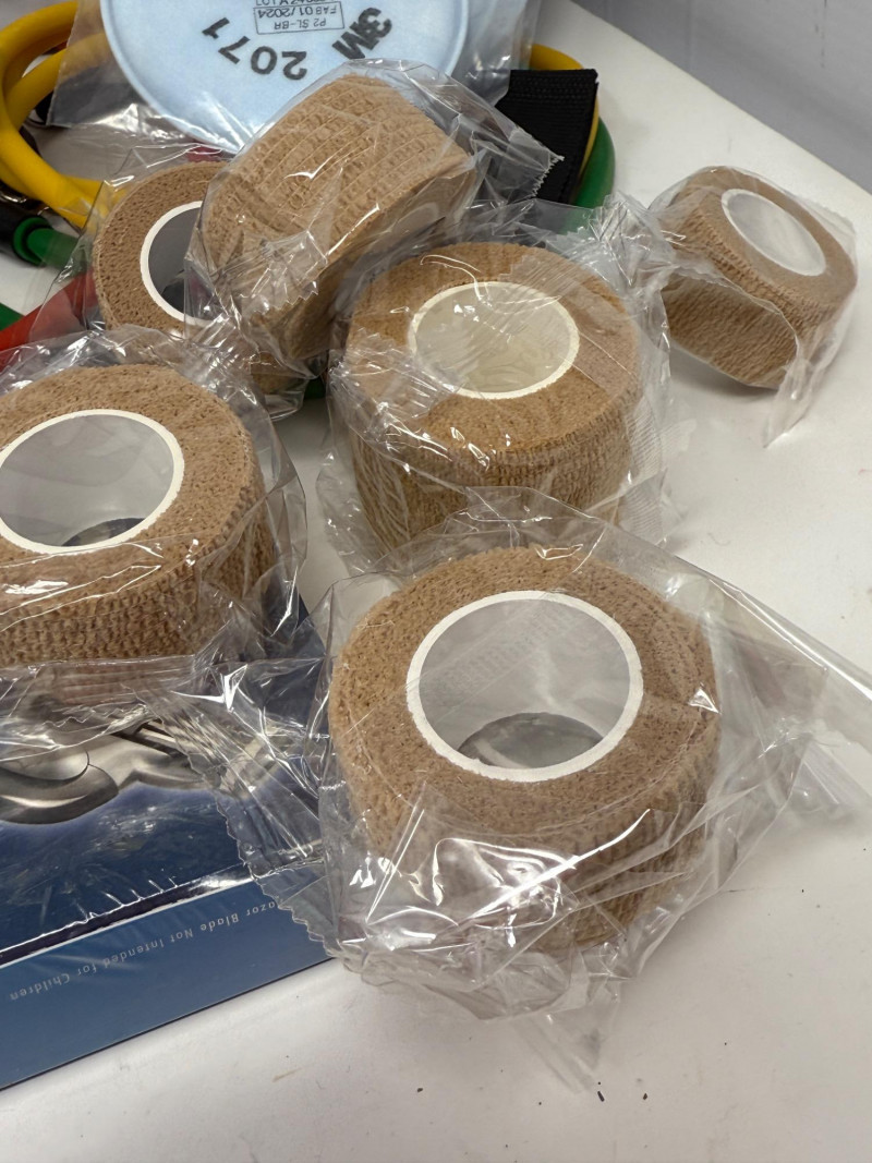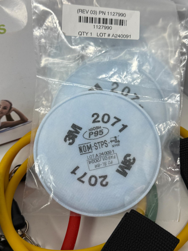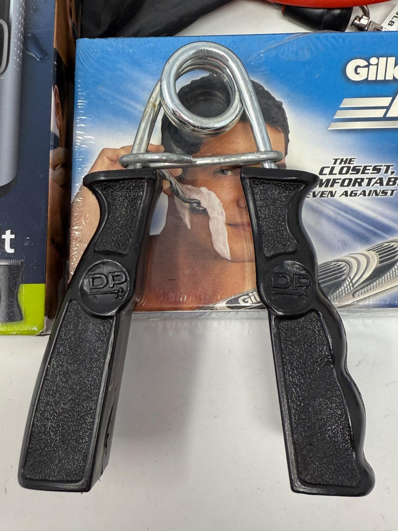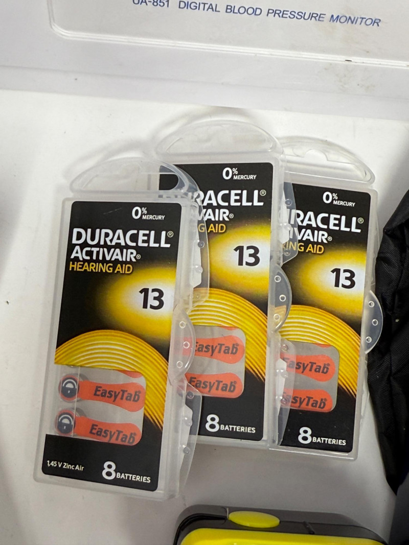Home Health Care BP Monitor 2 Resistance band sets Blood oxygen monitor Forehead thermometer Cohesive bandaging razors personal groomer 5 P95 3M respirator filters 3 packages of 13 hearing aid batteries grip strength exerciser