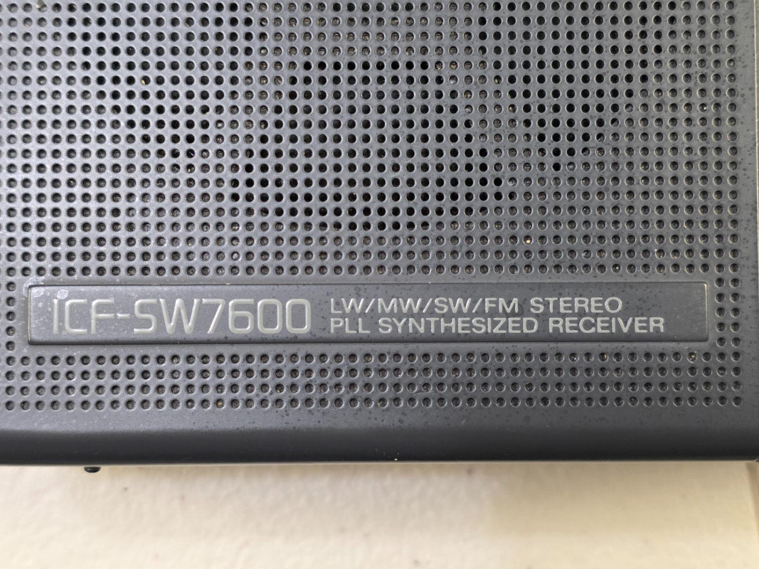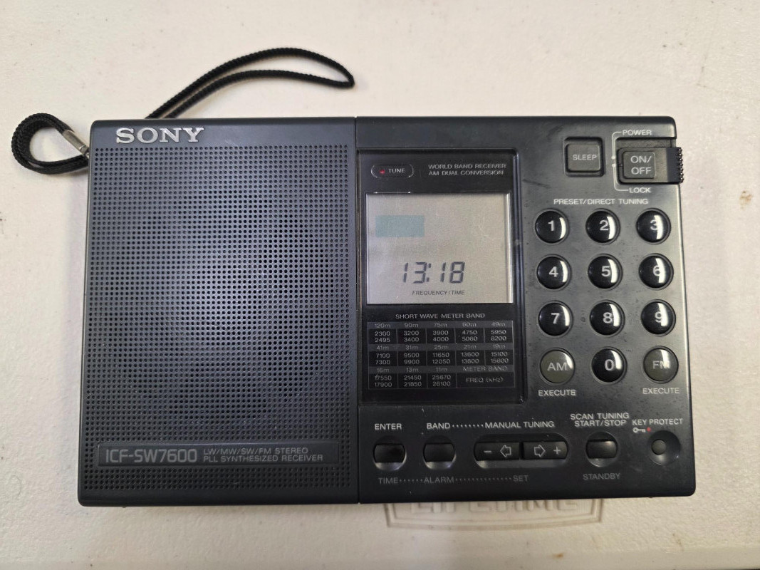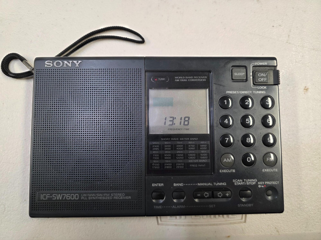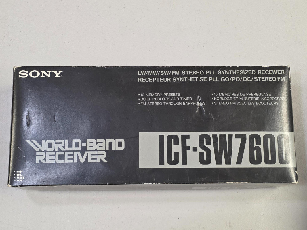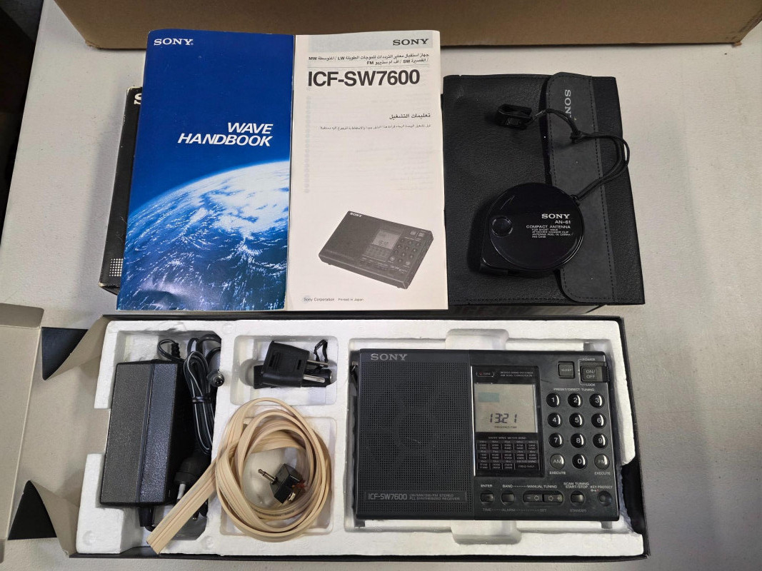 Sony ICF-SW7600 World-Band Receiver Appears nearly new in original box! Tuning: Offers PLL quartz-synthesized tuning for high accuracy and minimal drift. You can tune using a 10-key direct access keypad or with up/down buttons in 1 kHz steps. Synchronous detection: This circuitry reduces fading and "beat" frequency interference from adjacent stations, improving reception quality. Single Sideband (SSB) reception: Enables you to tune into amateur radio and other utility communications with dedicated USB/LSB selectors and a fine-tuning thumbwheel. World clock and timers: Features a dual world time clock and dual timers for setting alarms. Connectors: Includes a headphone jack for FM stereo audio and a DC-in jack for an optional AC adapter. Physical design: Comes with a built-in tilt stand and telescoping whip antenna for SW and FM, plus an internal ferrite bar antenna for AM and LW Includes all accessories pictured: carry case, AC adapter, world plug adapter, compact antenna, carry case, manuals Tested - Powers On!