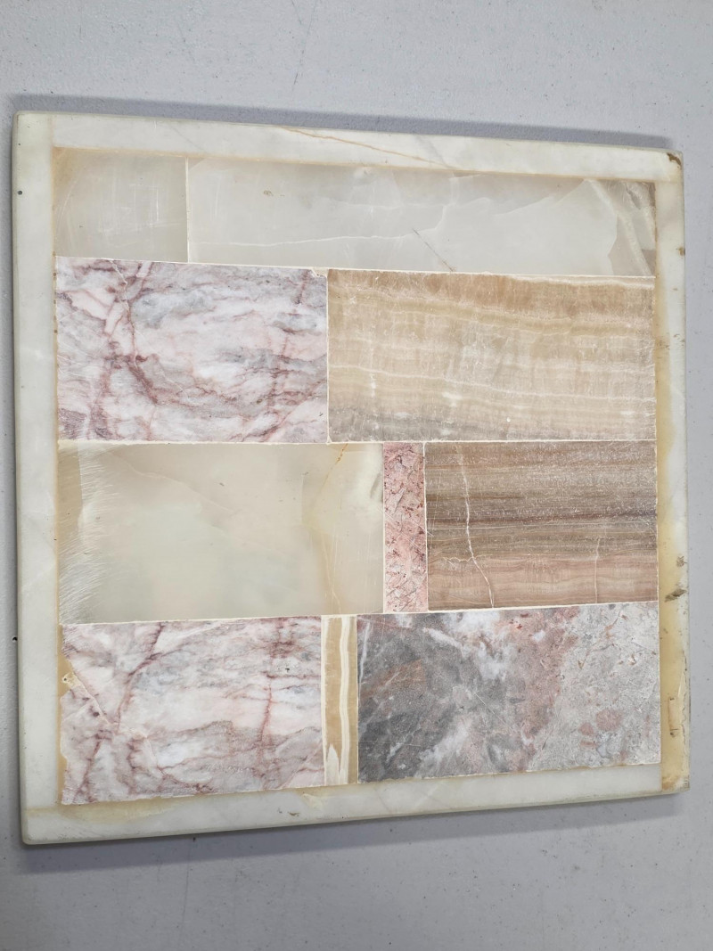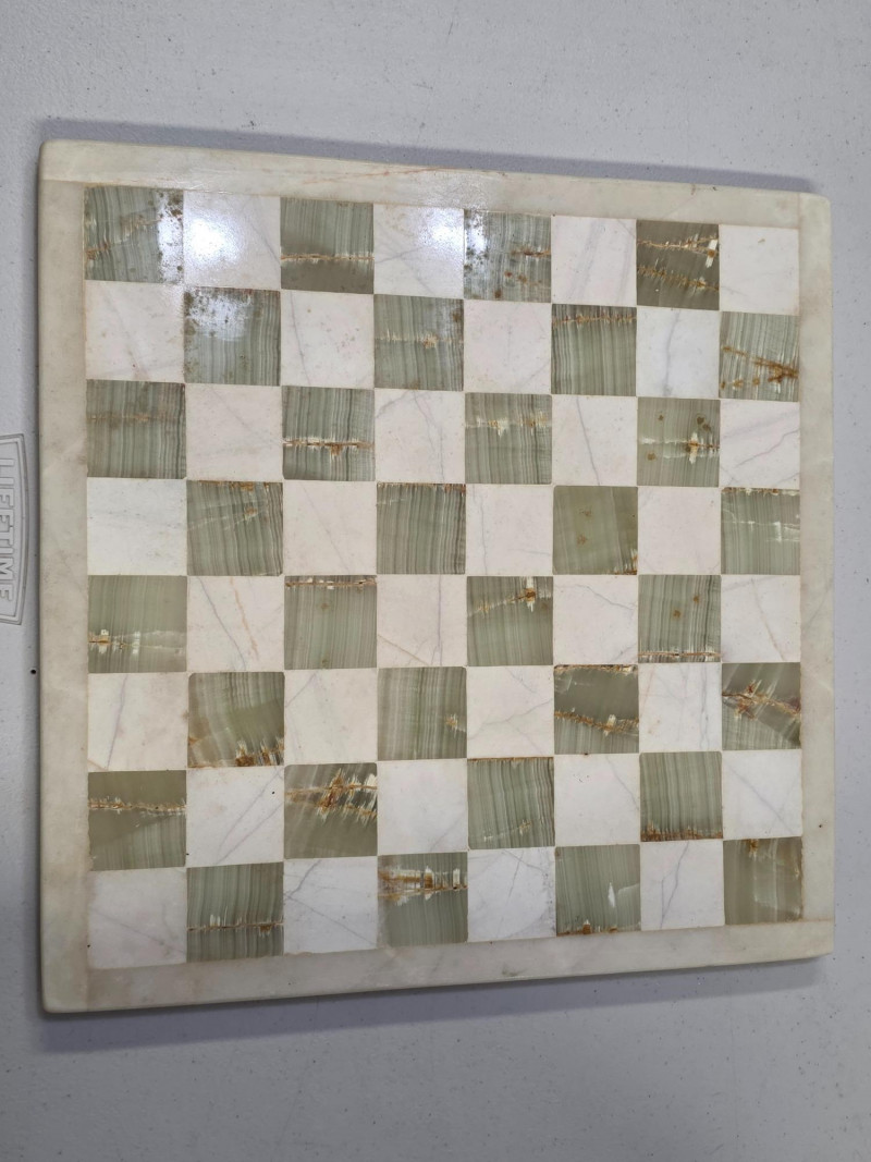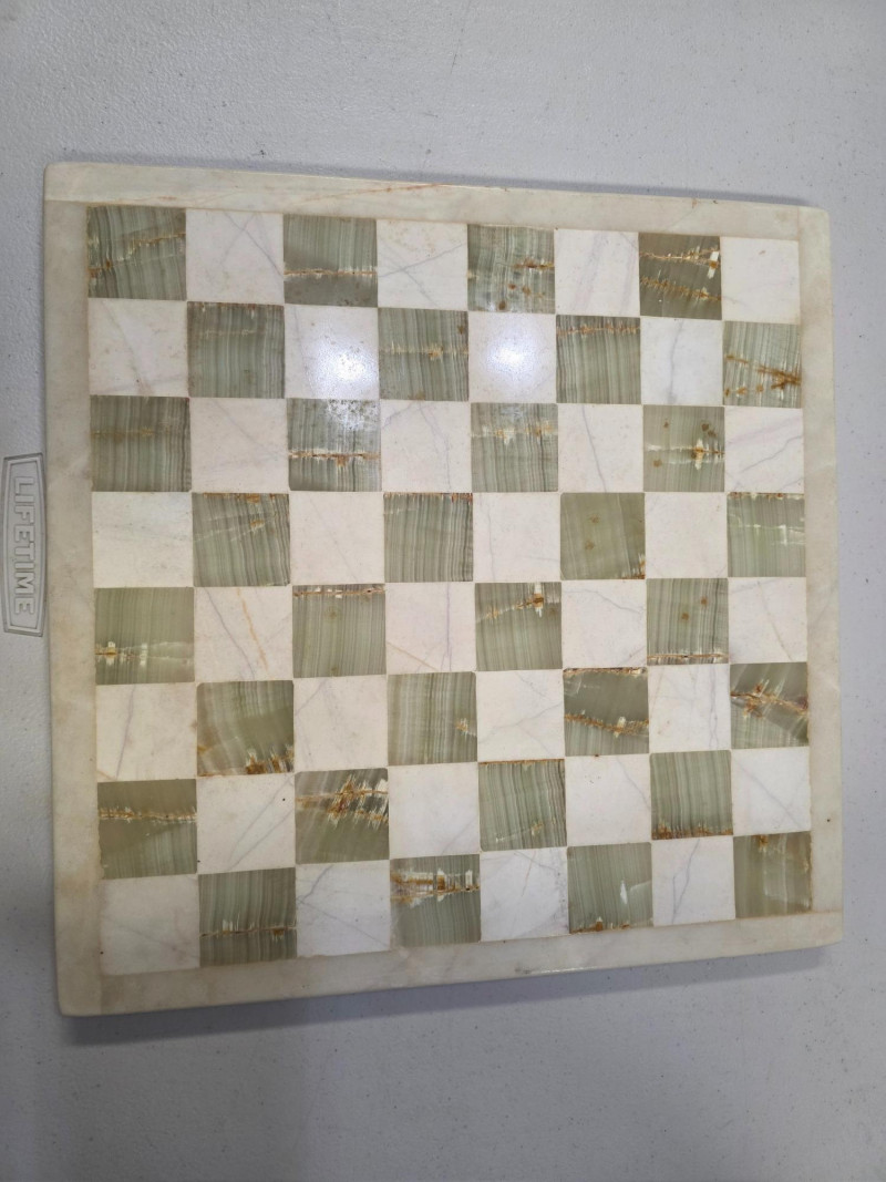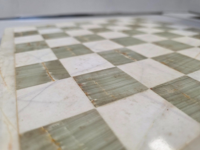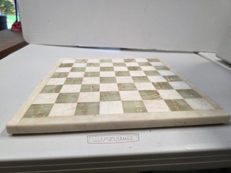 Handcrafted Marble & Onyx Chessboard Chessboards crafted from natural stone, such as marble and onyx, have been produced for centuries, often as decorative pieces or for high-end game sets. These materials lend a sense of luxury and permanence to the game, making them prized possessions for collectors and enthusiasts alike. The craftsmanship involved in cutting, polishing, and assembling these stone pieces requires significant skill 5/8"T x 13.75"W Beautiful chessboard !