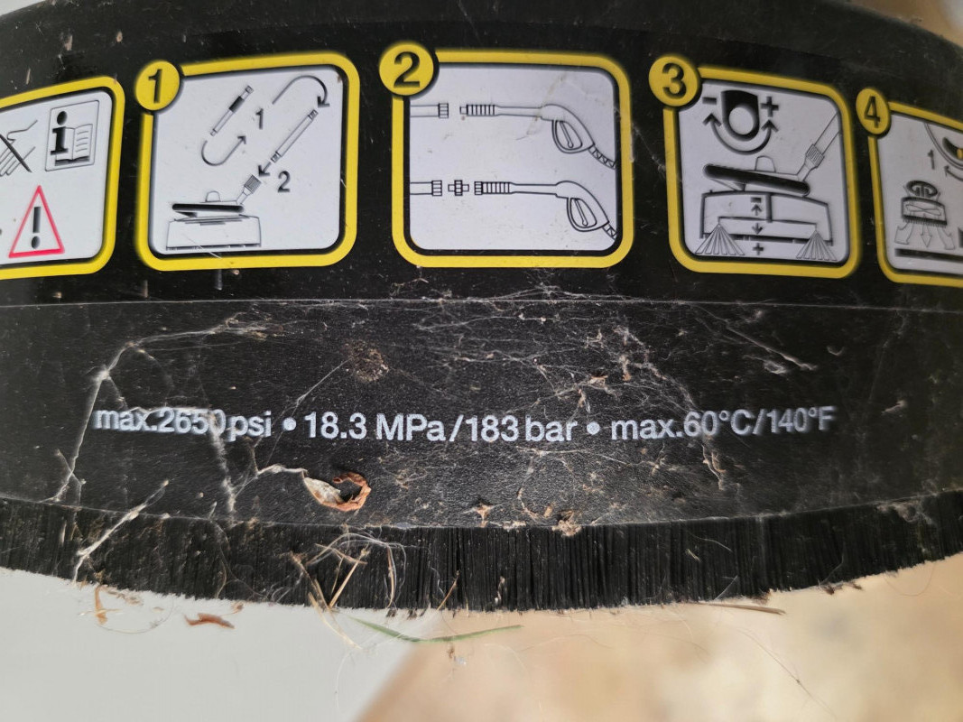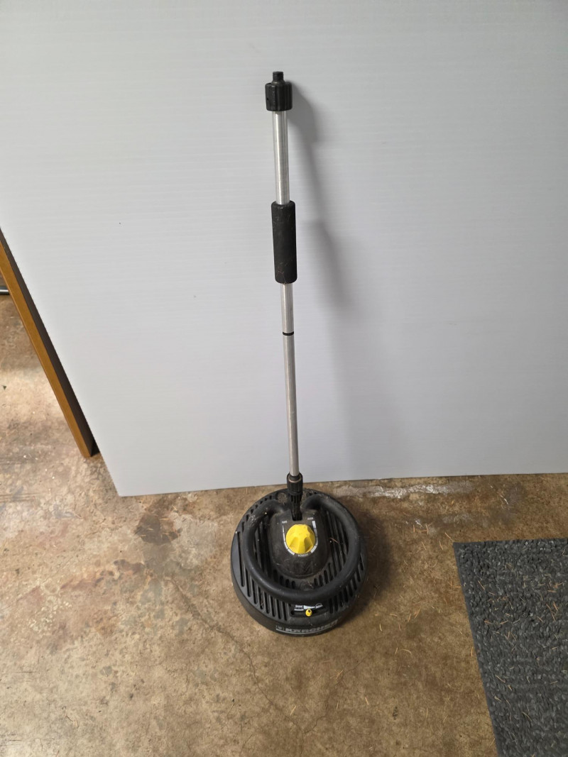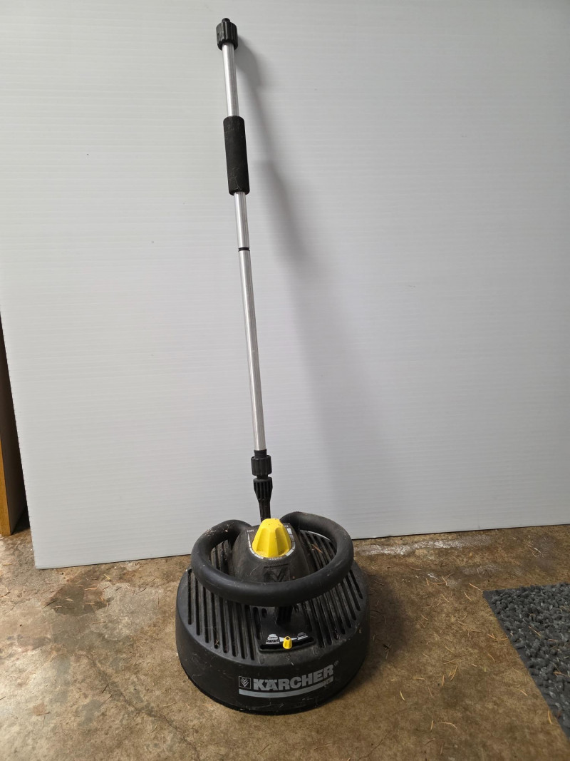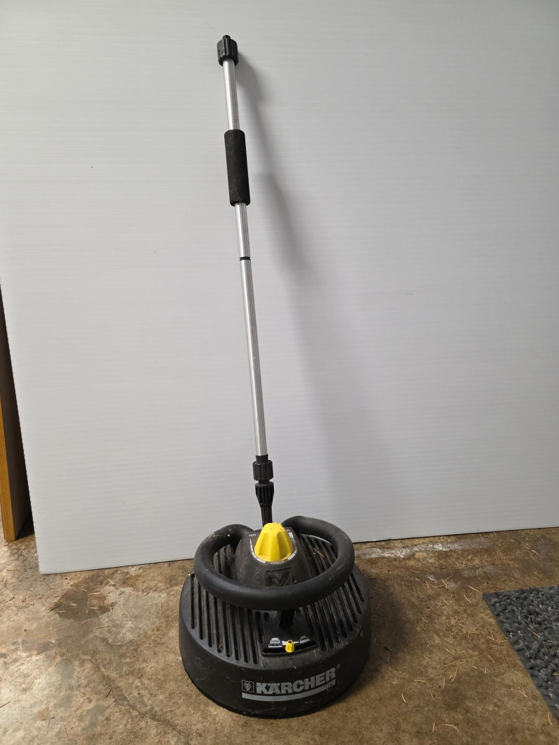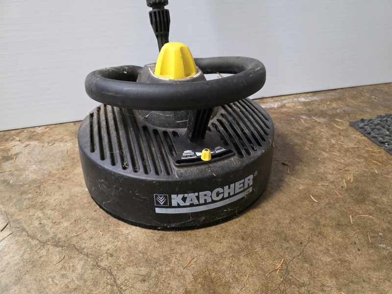 Karcher T-Racer Surface Cleaner (Pressure Washer Attachment) Kärcher T-Racer Surface Cleaner is a pressure washer attachment designed for cleaning large, flat surfaces such as decks, driveways, patios, and sidewalks. T-Racer models are available for pressure washers, with ratings typically up to 2600 PSI. The T-Racer features a twin-jet rotating arm that cleans a wide path, which helps to significantly reduce cleaning time compared to using a standard spray lance. A shroud and splash-free skirt help to protect the user and surrounding areas from overspray. The attachment can also be used to clean vertical surfaces, like garage doors and fences, by removing the extension poles and using the handles on the shroud. Untested!