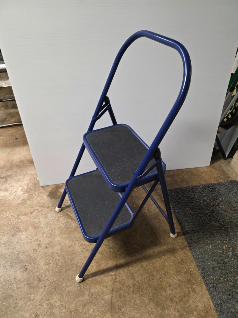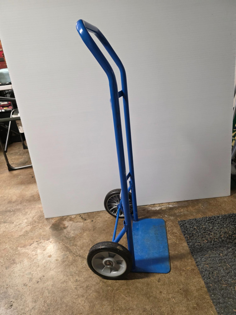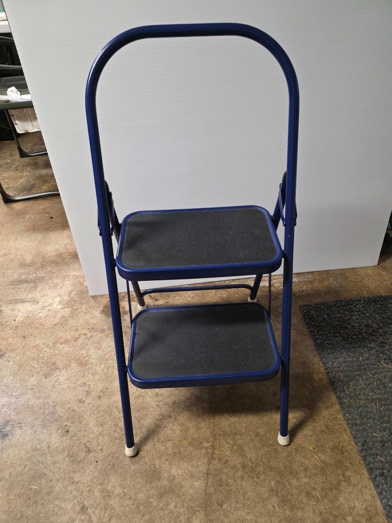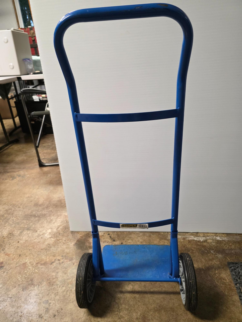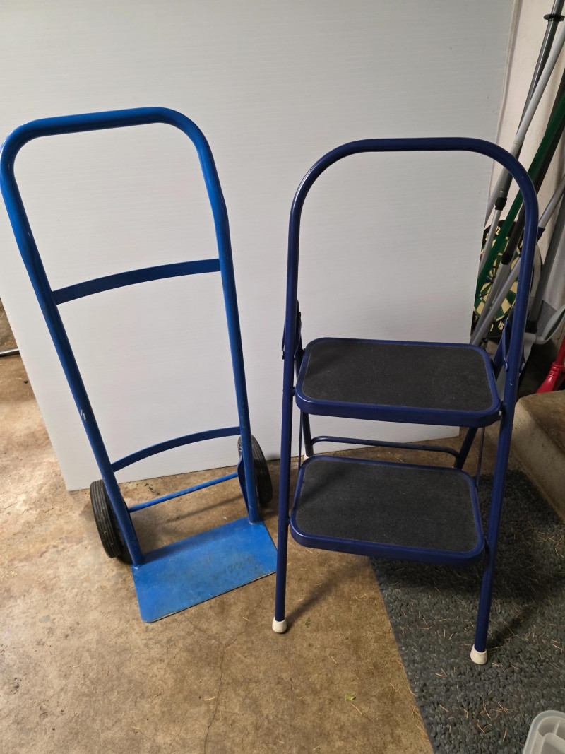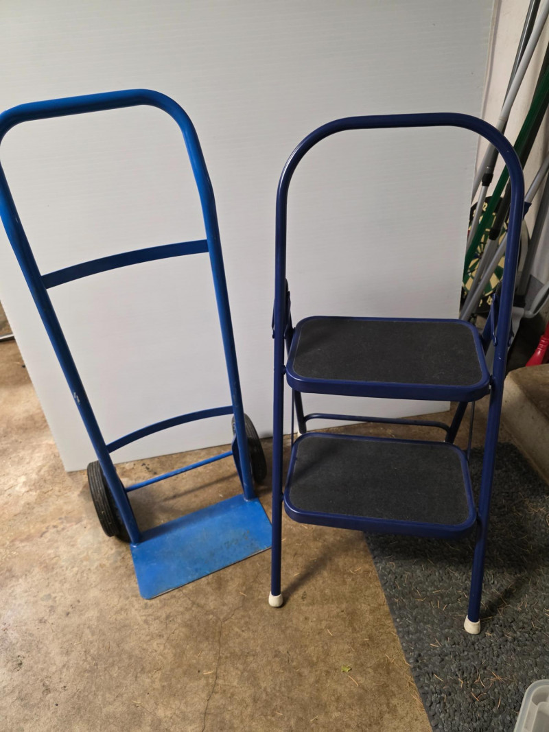 Harper Hand Cart & Blue 2-Step Ladder Harper Hand Cart has a 300lb capacity & solid rubber tires 2-Step Ladder has been rarely used, nice tread material for sure footing. Folds up for easy storage