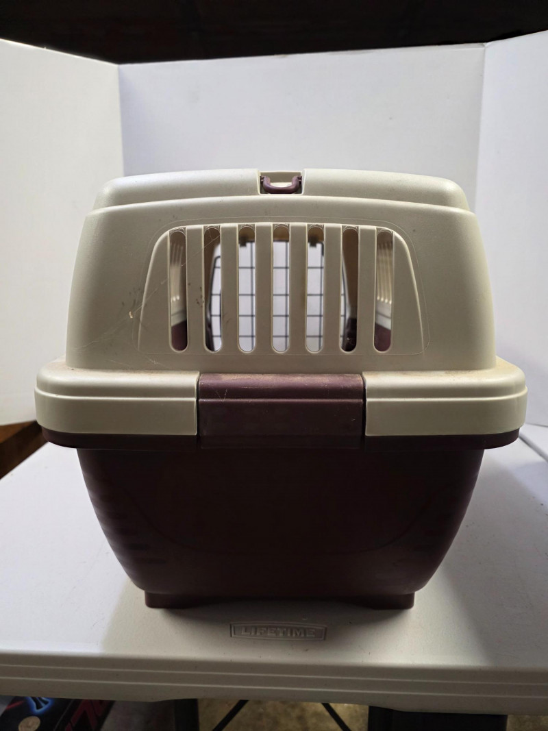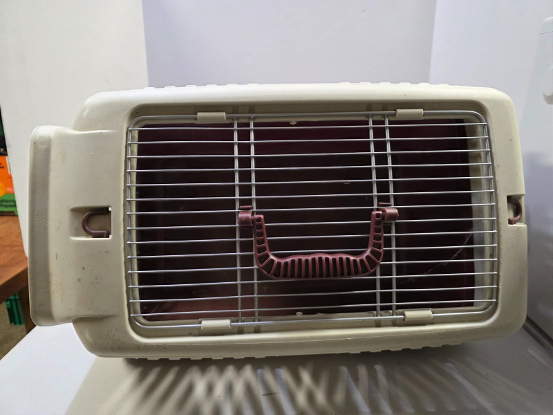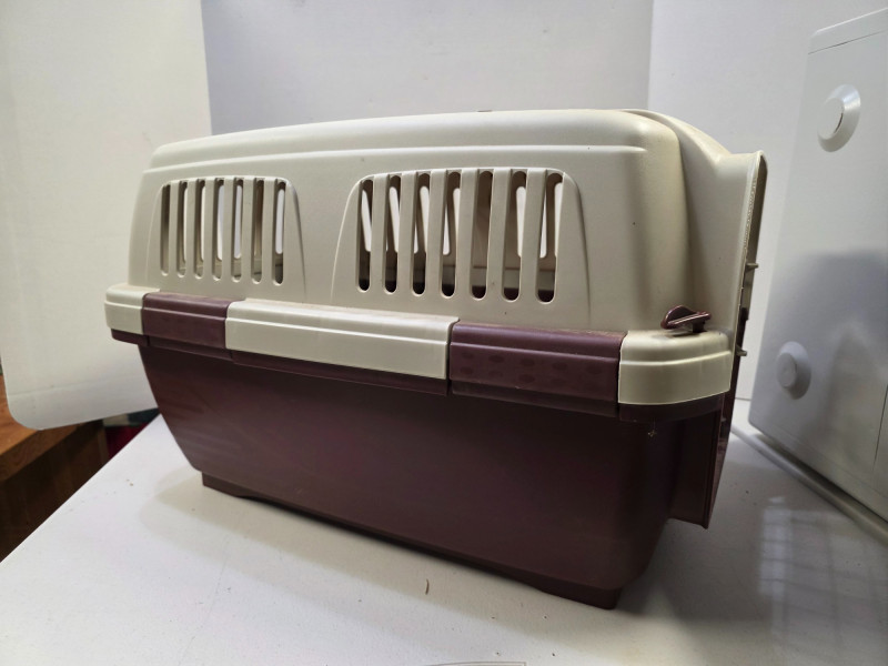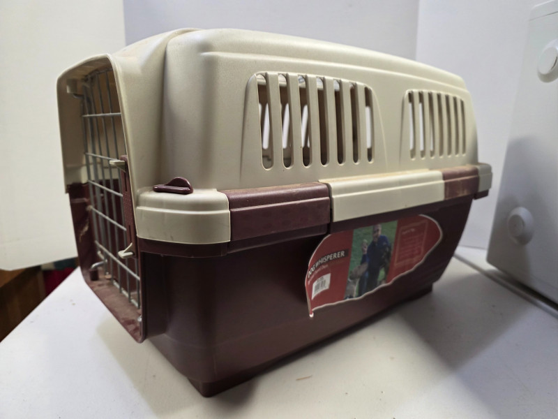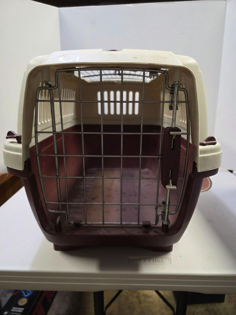 Cesar Milan's 200 Series Top-Load Travel Den Petco #1195239 Traveling animal carrier for small pet Has front-locking door and top-locking door Handle on top, could use a cleaning (dusty) 15"T x 13.5"W x 22"L