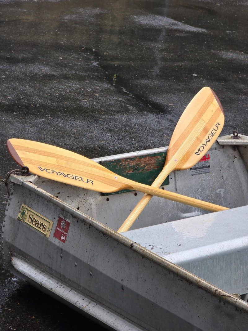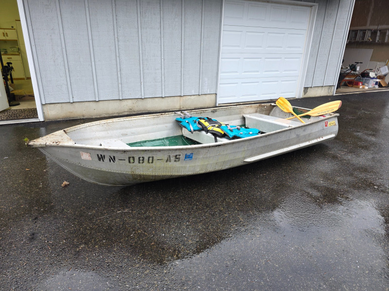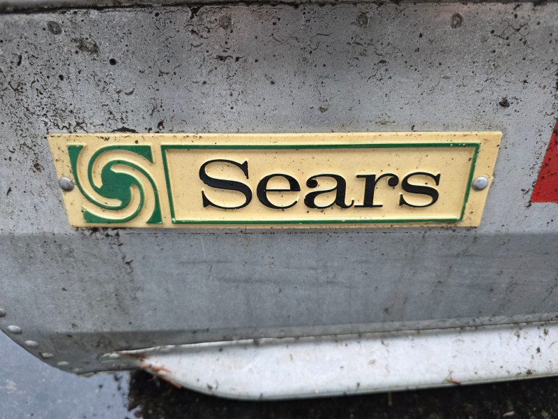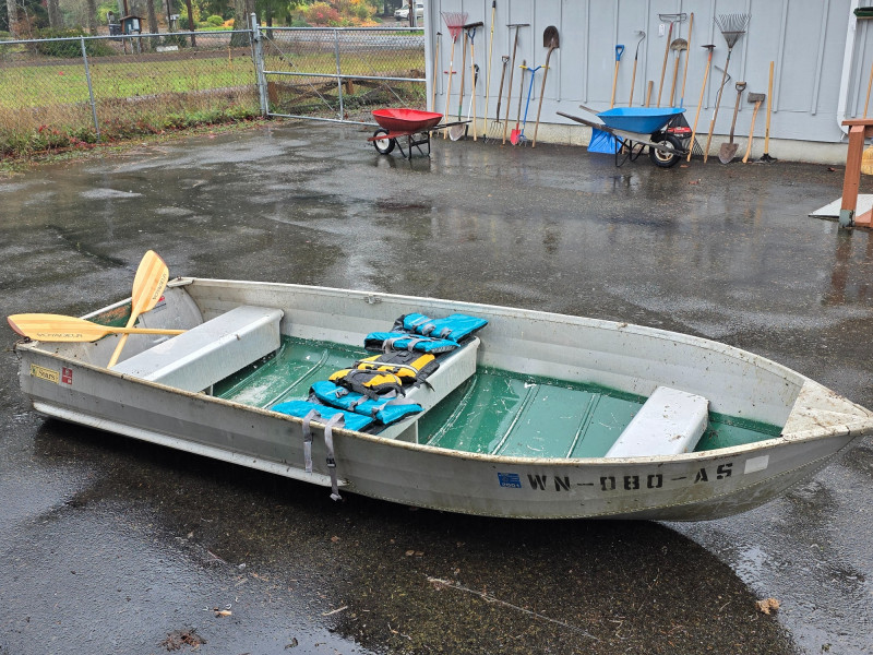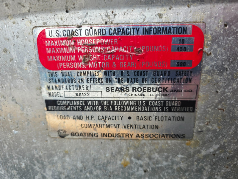 Vintage 1974 Sears 12' Aluminum Jon Boat Sears Model #60122 Hull #SEA44713 M74L-2B The flat bottom design allows it to navigate shallow areas easily and provides stability for occupants to stand up, making this boat popular for activities like duck hunting and float fishing. Features bench seats and a transom for an outboard motor, offering a cost-effective way to get on the water Includes (2) new Voyager 47" wooden oars & (3) lifejackets 144"L x 52.5"W 20"D
