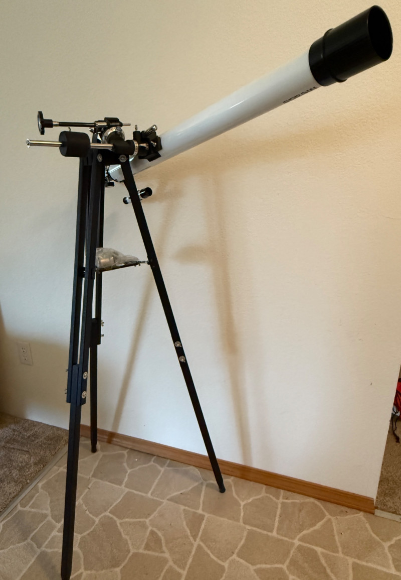 Mead Telescope Model #289M on Tri-Pod D =60mm F=900mm Coated optics Made in Taiwan Scope is 37.5” Tri-pod is 50” tall.