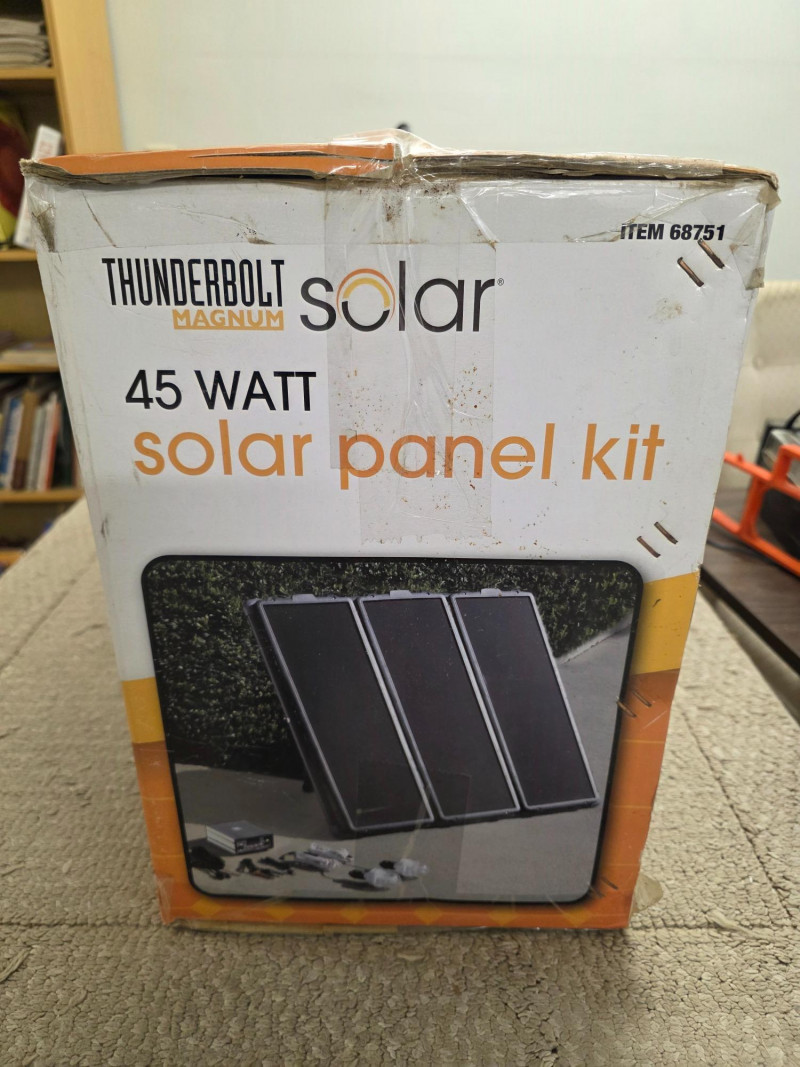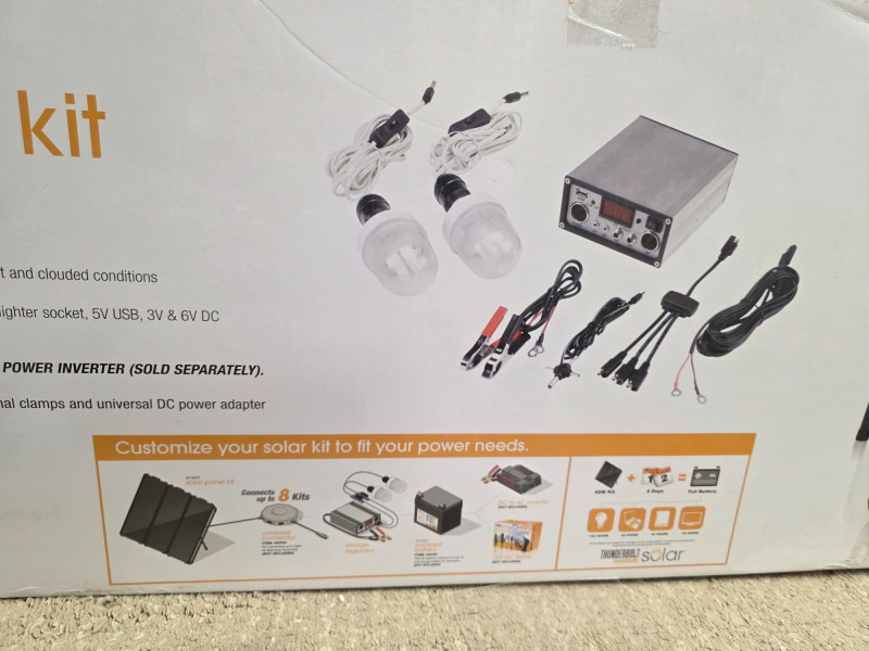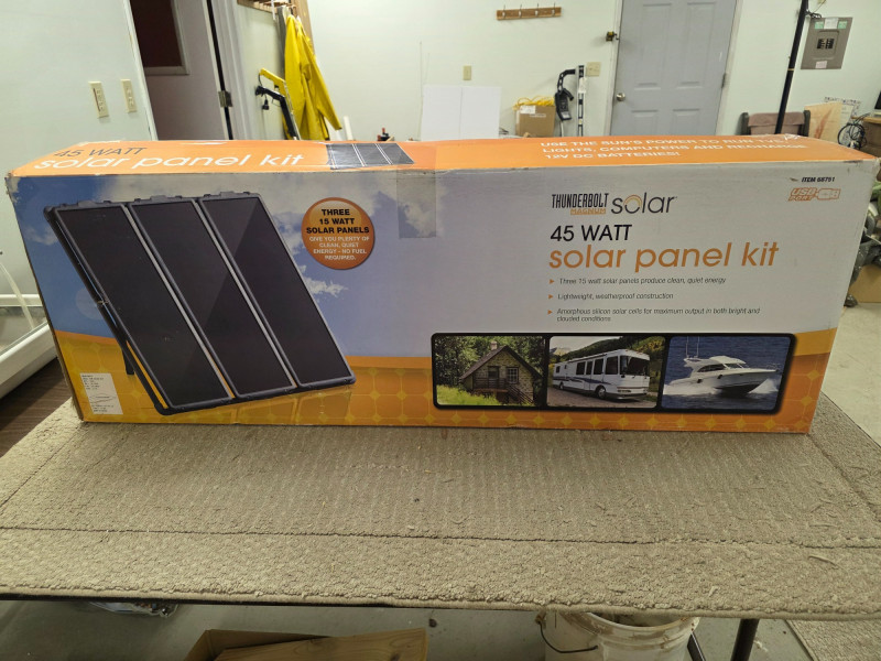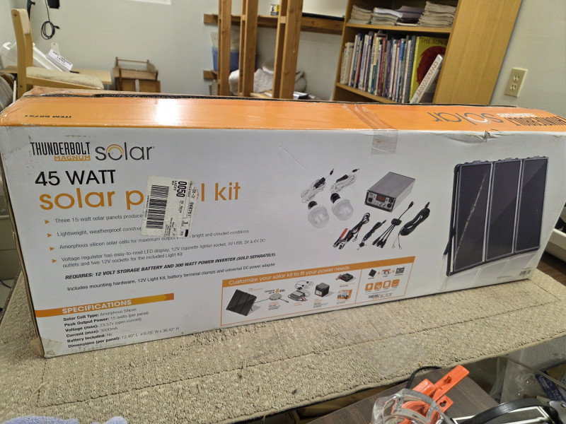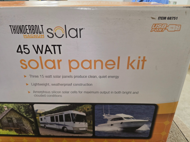 Thunderbolt Magnum Solar 45 Watt Solar Panel Kit Item #68571 New In Box! Total Output: 45 watts Panel Configuration: The kit includes three separate 15-watt amorphous silicon solar panels. Amorphous panels are designed to provide maximum output in both bright and cloudy conditions. Applications: The kit is intended to run small 12V DC devices and recharge 12V batteries, suitable for running items like TVs, lights, and computers (with an appropriate inverter). Portability: The panels feature lightweight, weatherproof construction for outdoor use, such as camping or RV power. Model/Item Number: Model 68751. Components: The kit typically includes the solar panels, a charge controller/regulator, necessary wiring, and sometimes basic DC lights. Kit contains (3) 15 watt solar panels, voltage regulator, 12V cigarette lighter socket, 5V USB, 3V & 6V DC outlets and (2) 12V sockets for the included light kit Untested - New In Box! 16"T x 44"Lx 11"D