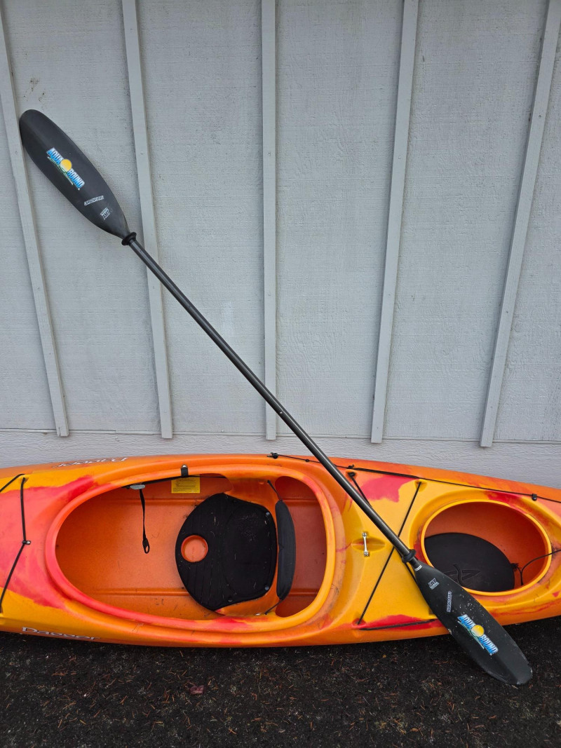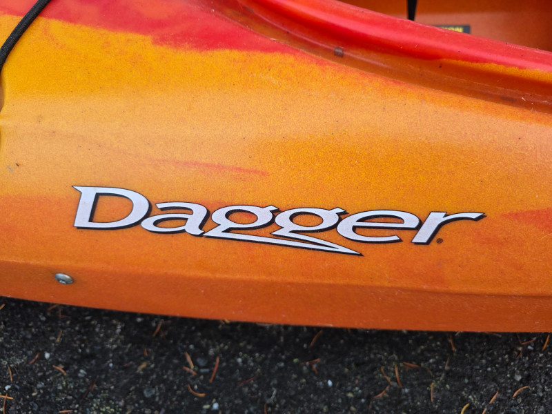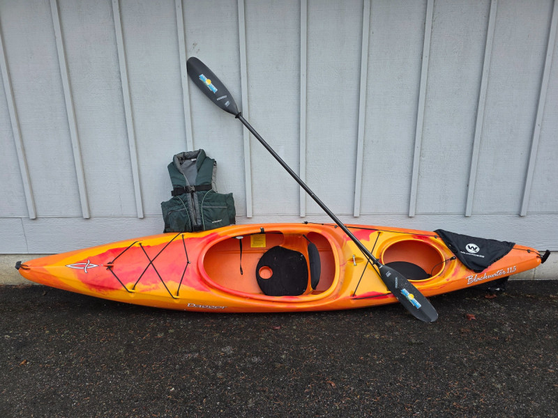 Dagger Blackwater 11.5" Kayak With Retractable Skeg The Dagger Blackwater 11.5 is a versatile crossover kayak, praised for its stability and maneuverability on various water types, from flat lakes to light Class II whitewater Features a retractable skeg that improves its tracking in windy conditions and over long distances by helping it move in a straight line The large cockpit makes entry and exit easy, and there is ample storage in the rear hatch for overnight trips Prices for used models can vary depending on condition and location, with some examples seen listed for $300-$450 Weight: 45lbs In good condition! Includes: Stearns Adult XXL Life Jacket, Wilderness Systems Spray Skirt (New With Tags) & Aqua Bond 94" "Carbonfibre" Tripper AMT Paddle 13"T x 139"L x 22"W Get ready for summer on the lake!