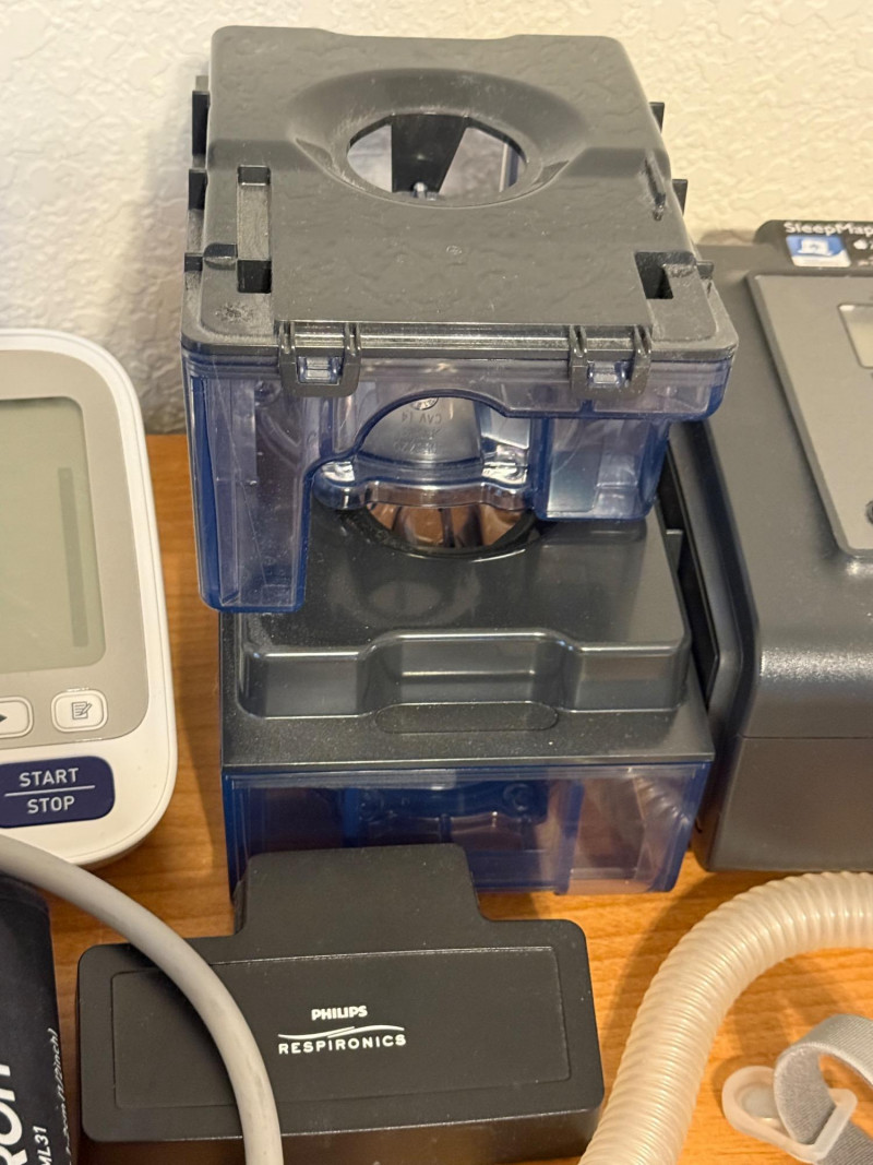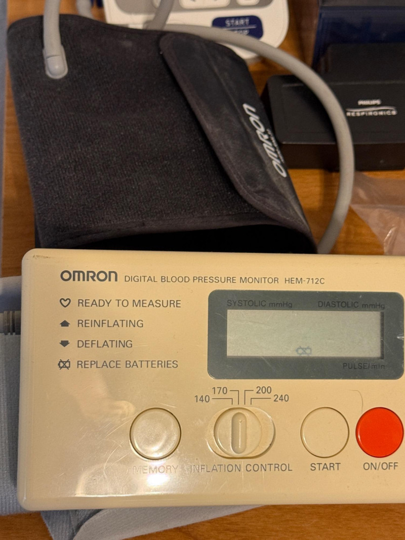 Philips Respironics BiPAP System One & Tubing & 2 Omron BP Monitors BiPAP tested and blows. 2 water reservoirs 2 Omron Blood Pressure monitors, each need batteries but powered on briefly.