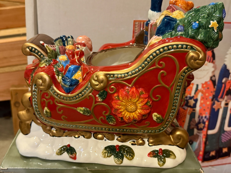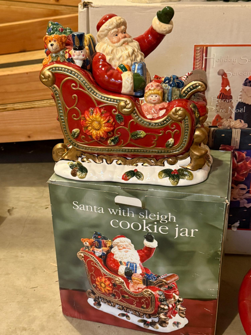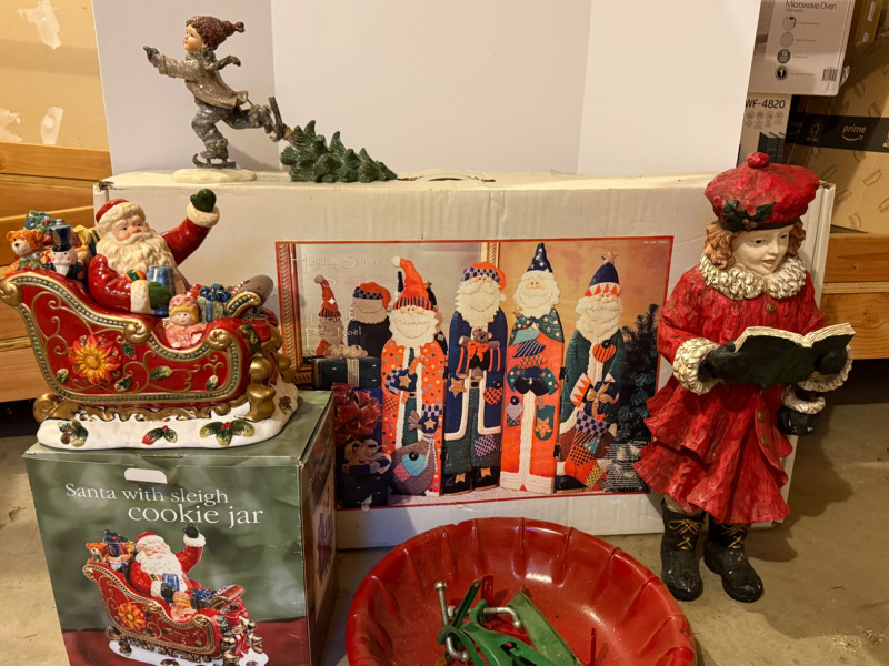 Christmas Screen - Caroler - Vintage Tree Stand 38” 4 Santa resin screen 24” Resin caroler Vintage Metal Tree Stand Santas Sleigh Cookie Jar