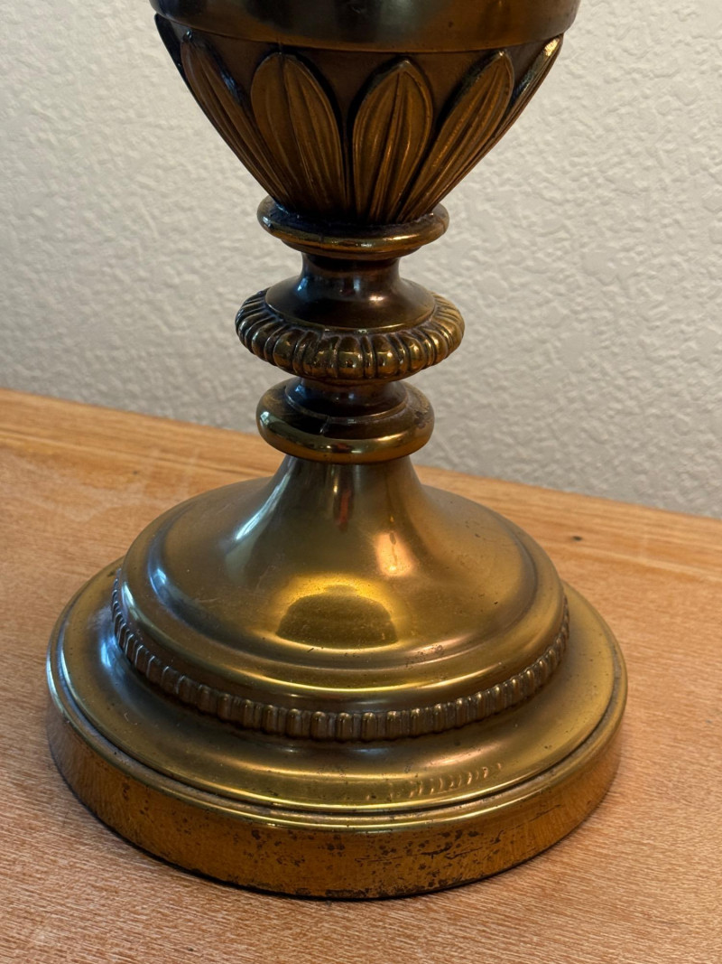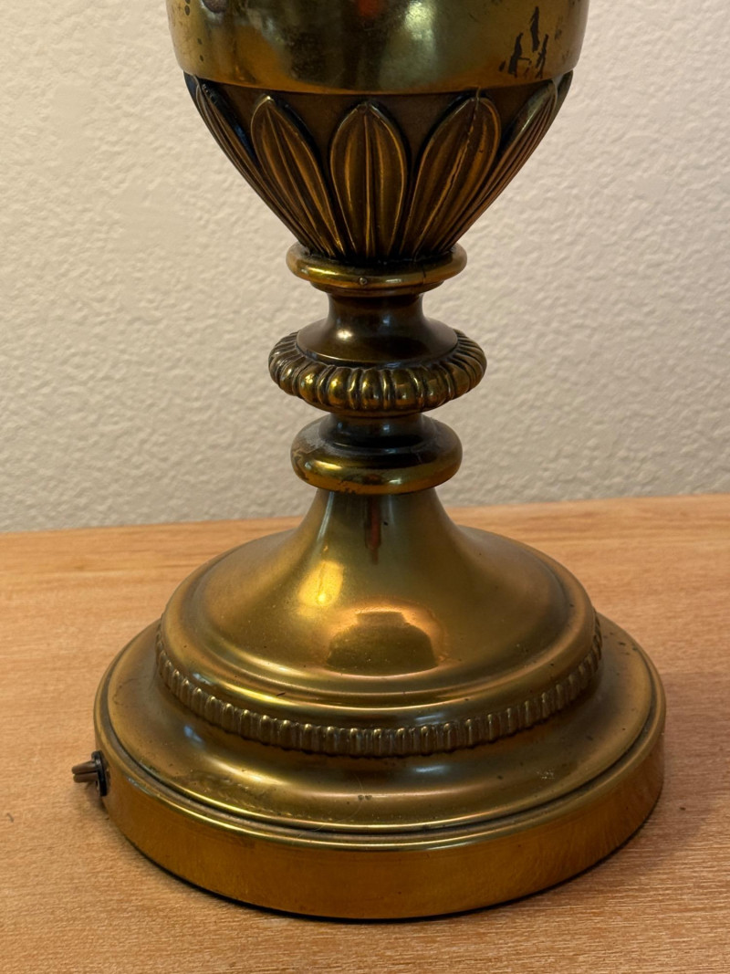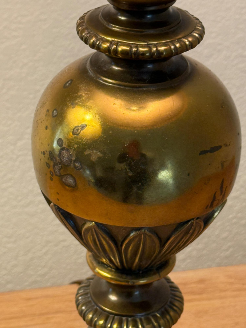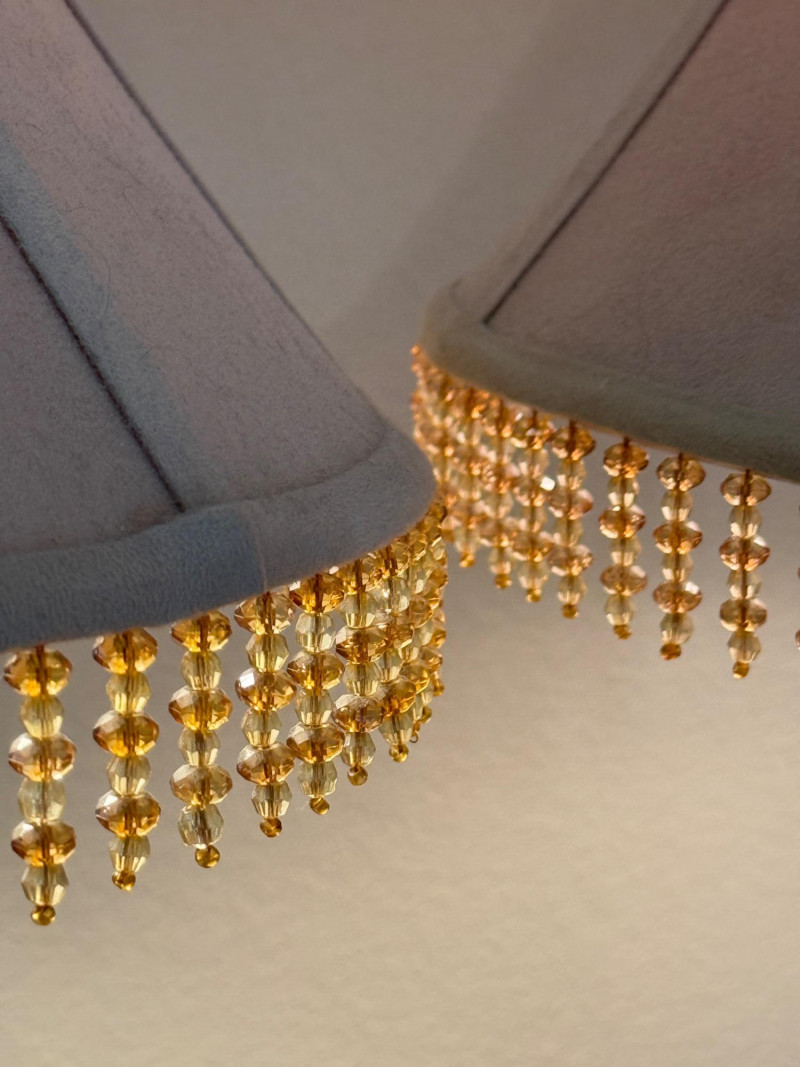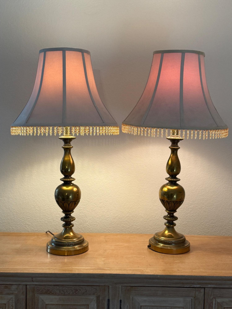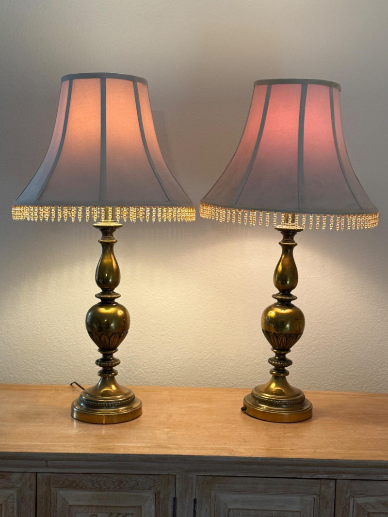 (2) Brass Table Touch Lamps with Beaded Fabric Shades 7” base, 32.5” tall with 17” shade.