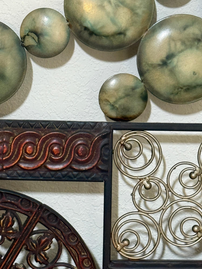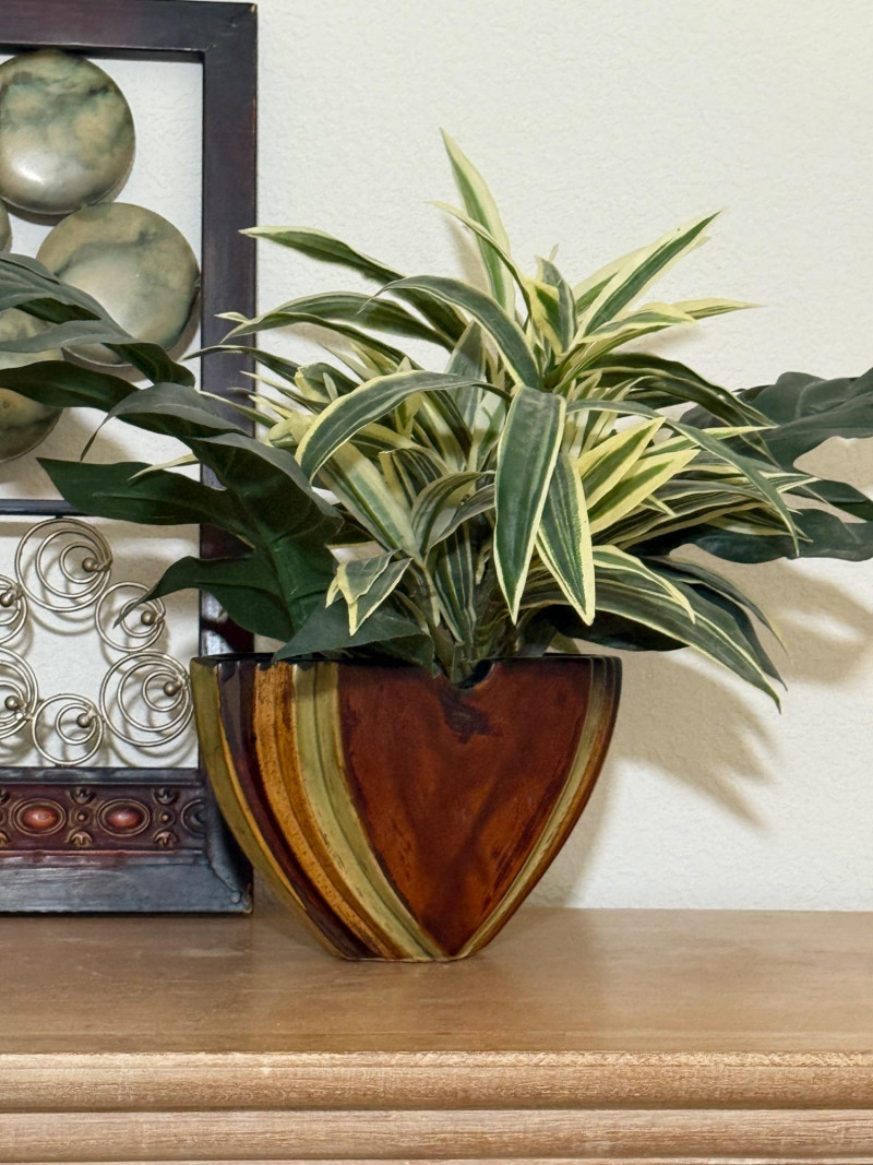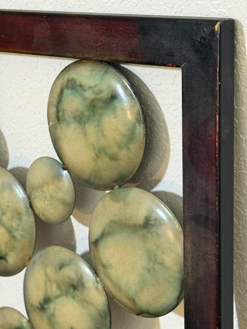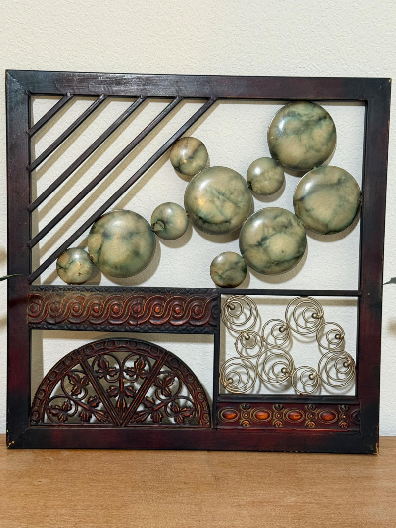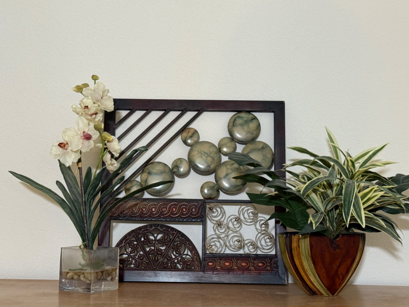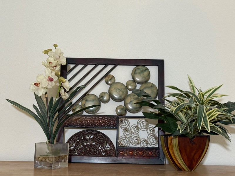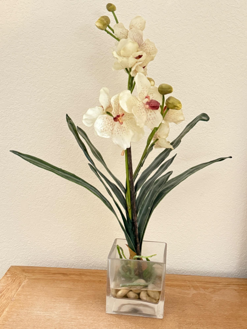Square Metal Wall Art & Faux Floral Arrangements 19.5x19.5” square art Faux orchids and greenery