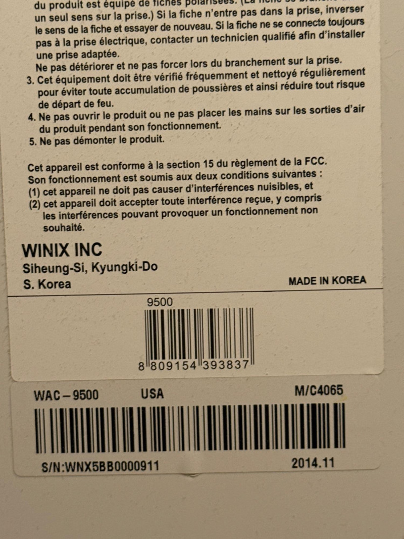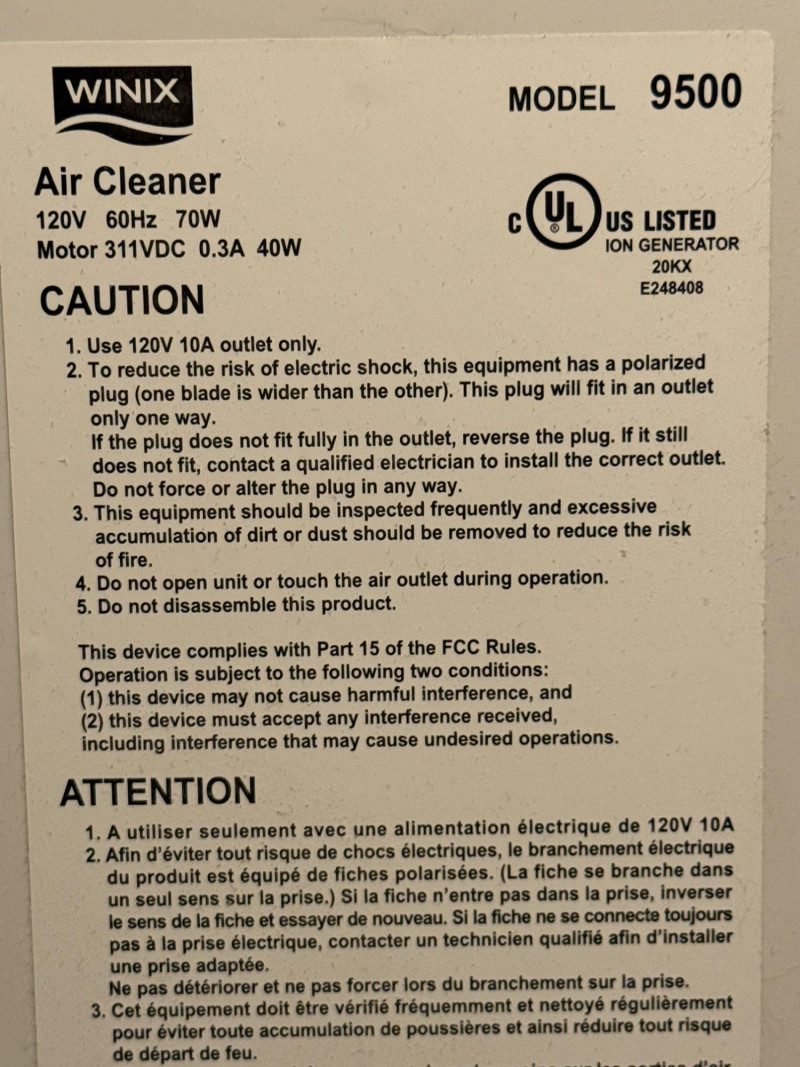 Winix HEPA Air Purifier & 3 Replacement Filters and remote. 16.5x9x21.5” Model 9500 40W Tested, works!