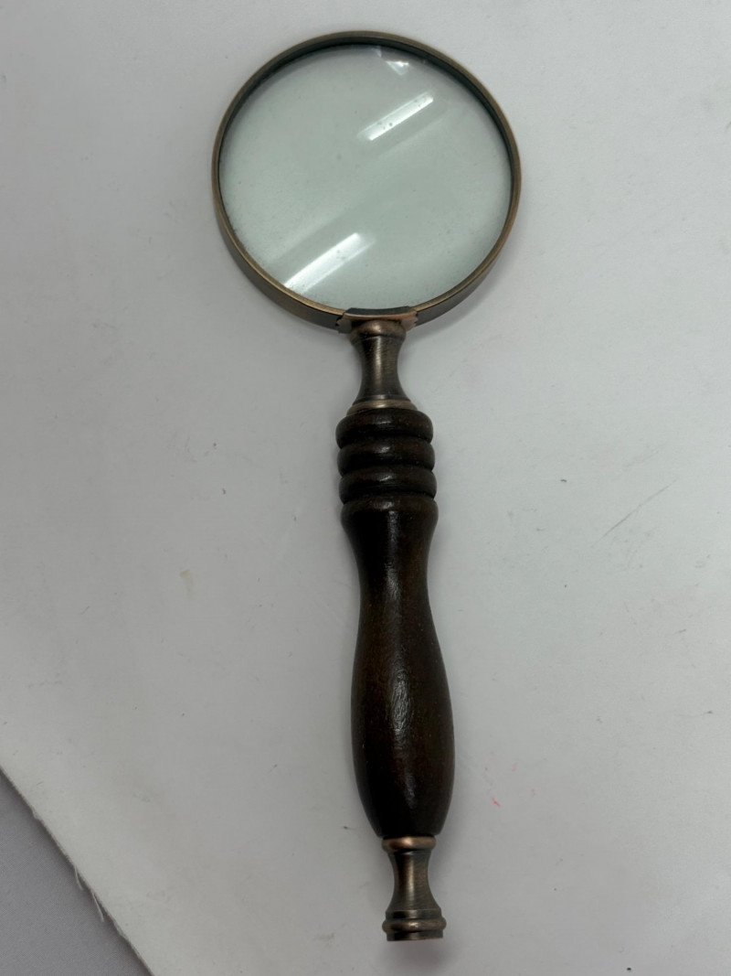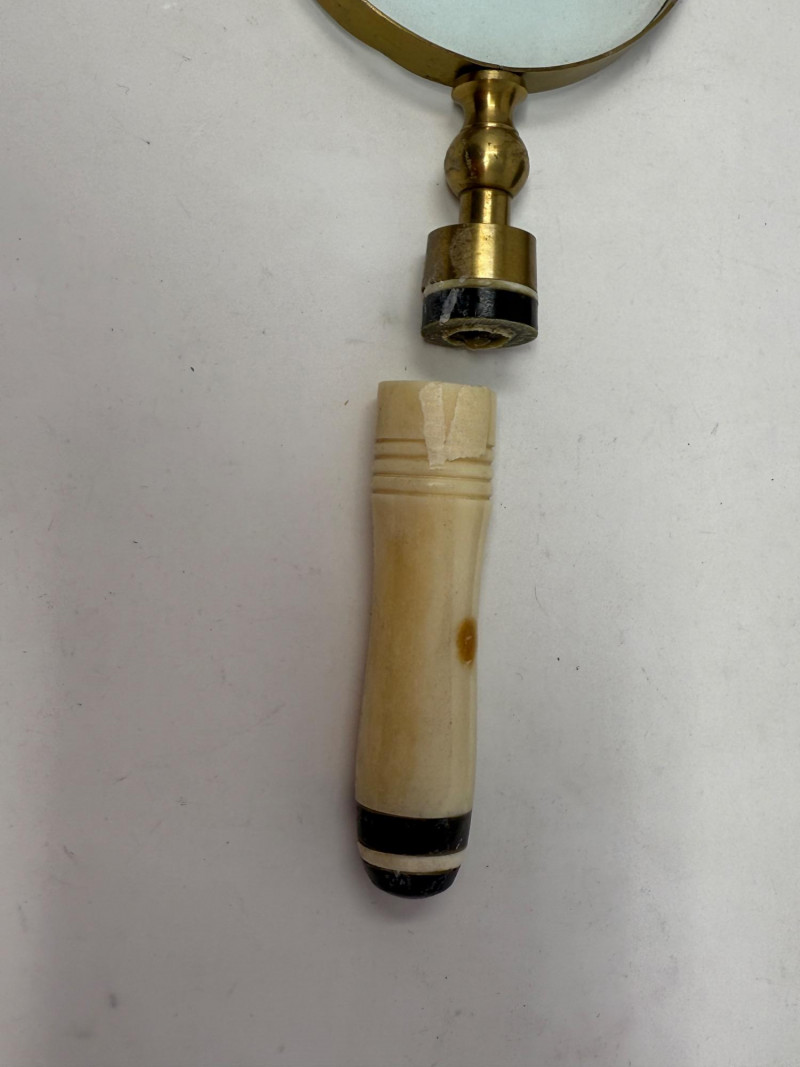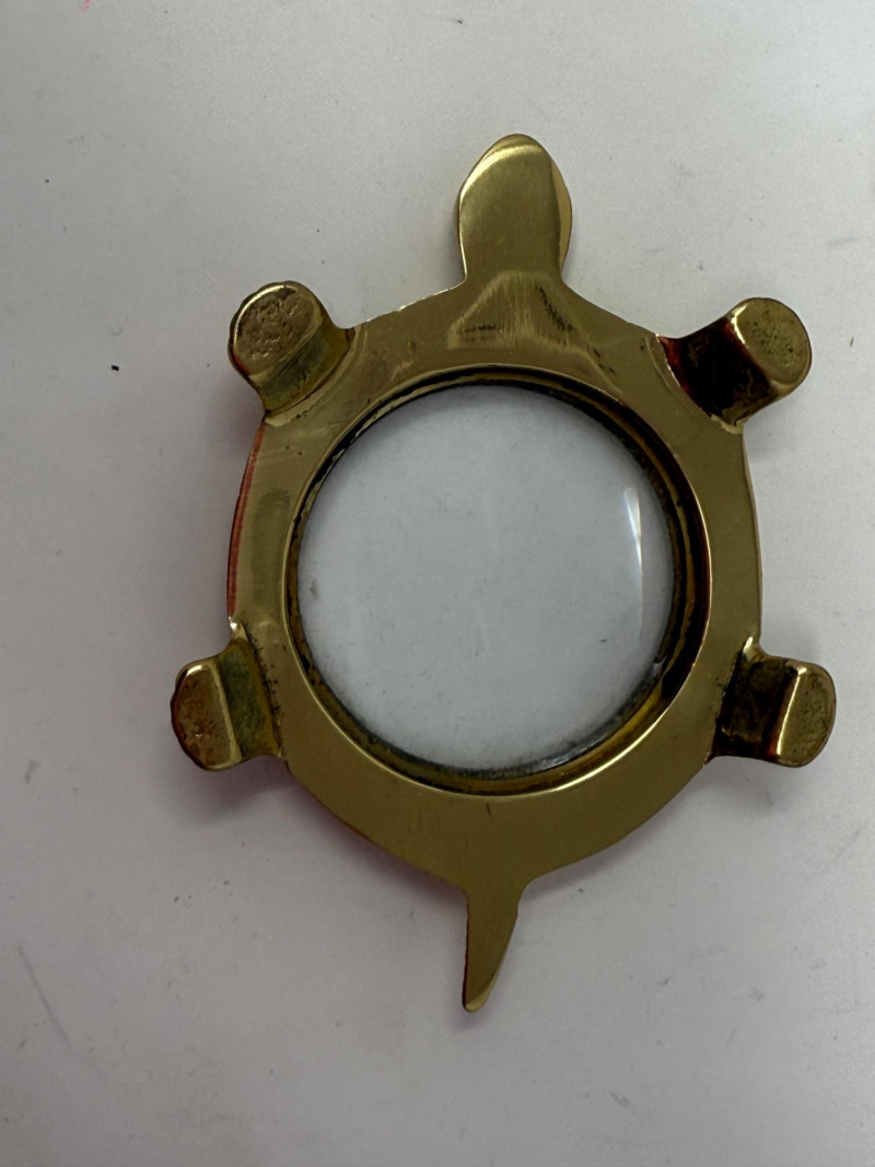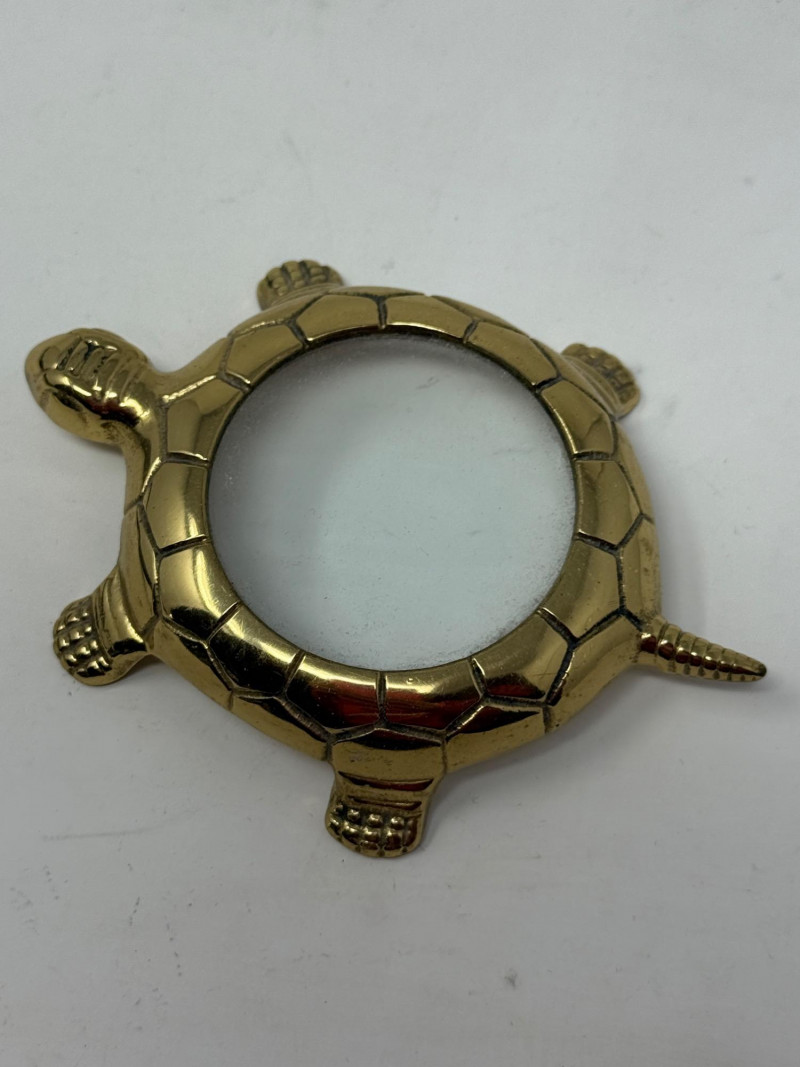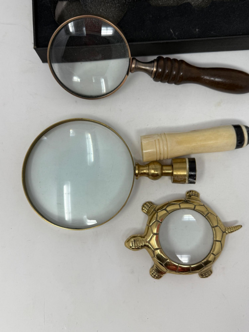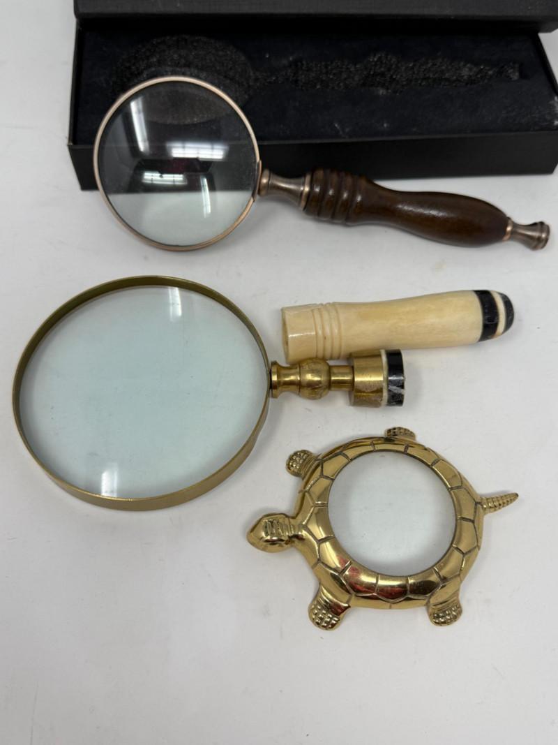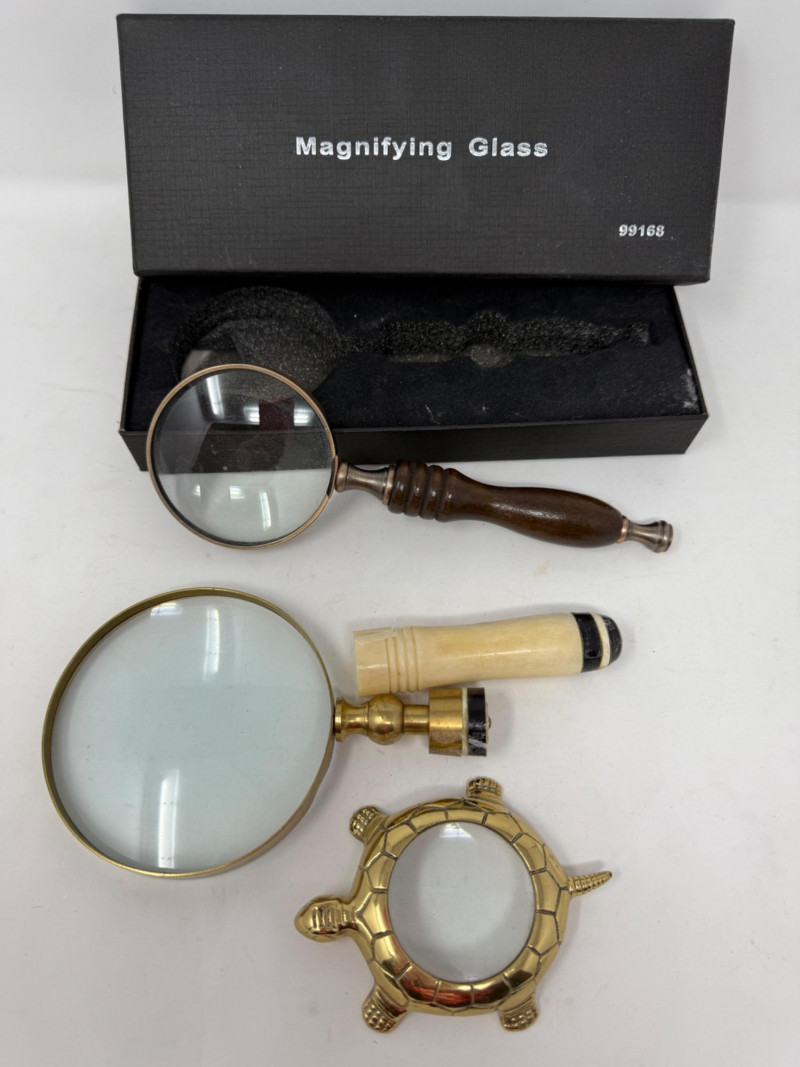 Trio of Magnifying Glasses Brass and bone 4x10” handle has come off and is sticky from tape residue. Brass turtle is 4x3”