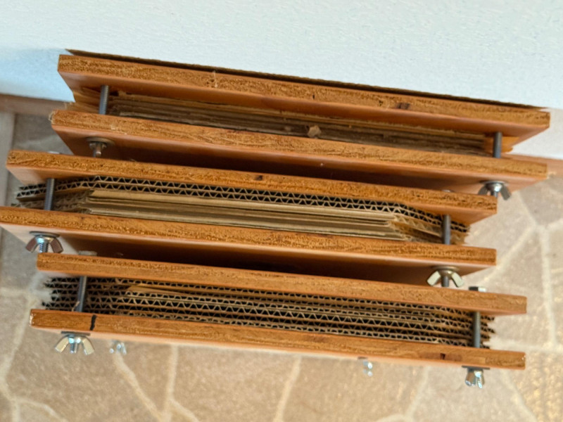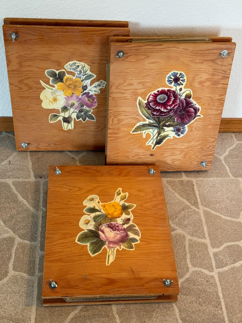(3) plywood flower presses full of cardboard and paper for pressing flowers for numerous art projects. 12.5x2x16”