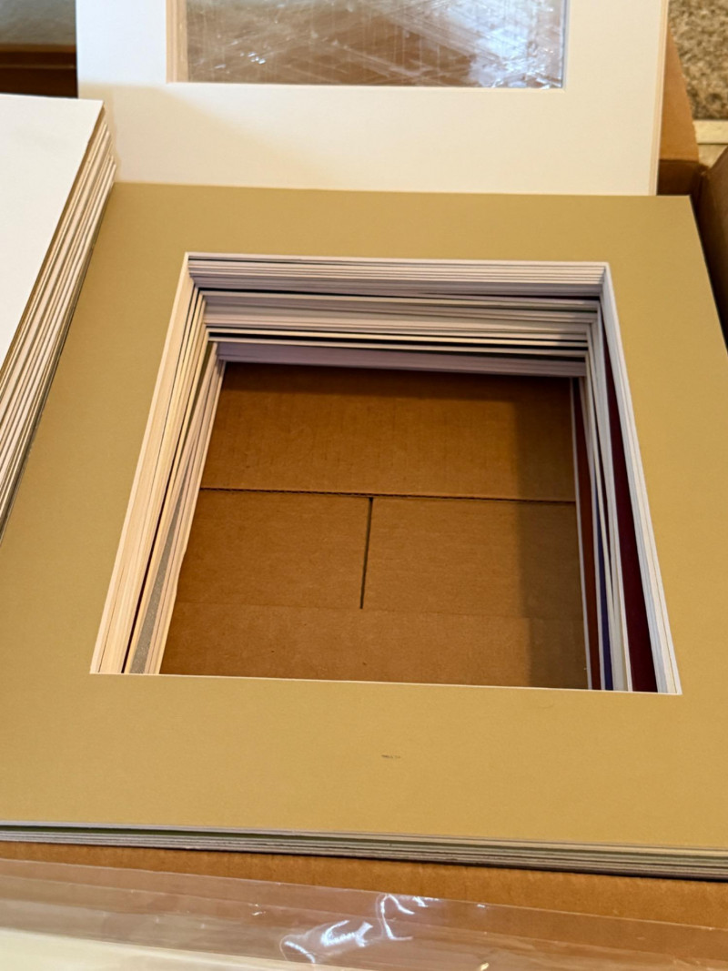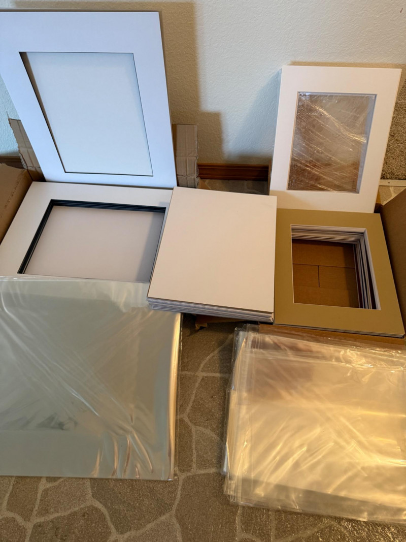 Picture Matting With Protective Sleeves 11x14” colored and white cut matting, uncut matting and protective sleeves.