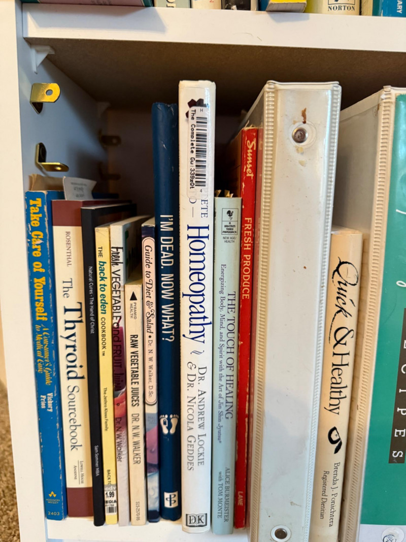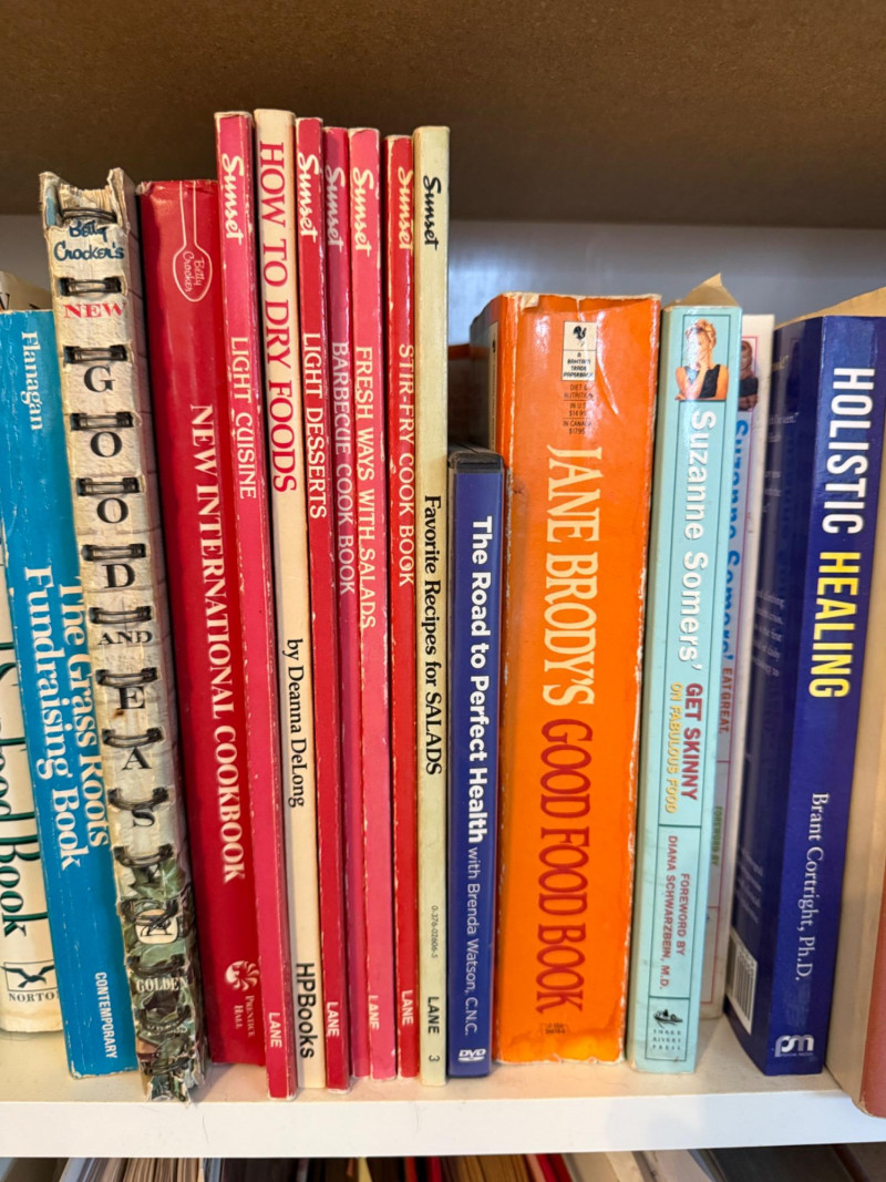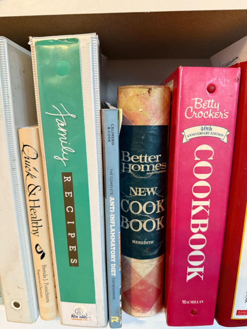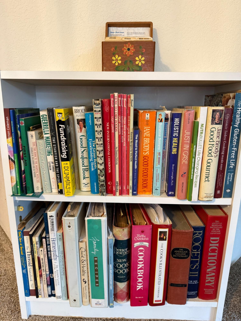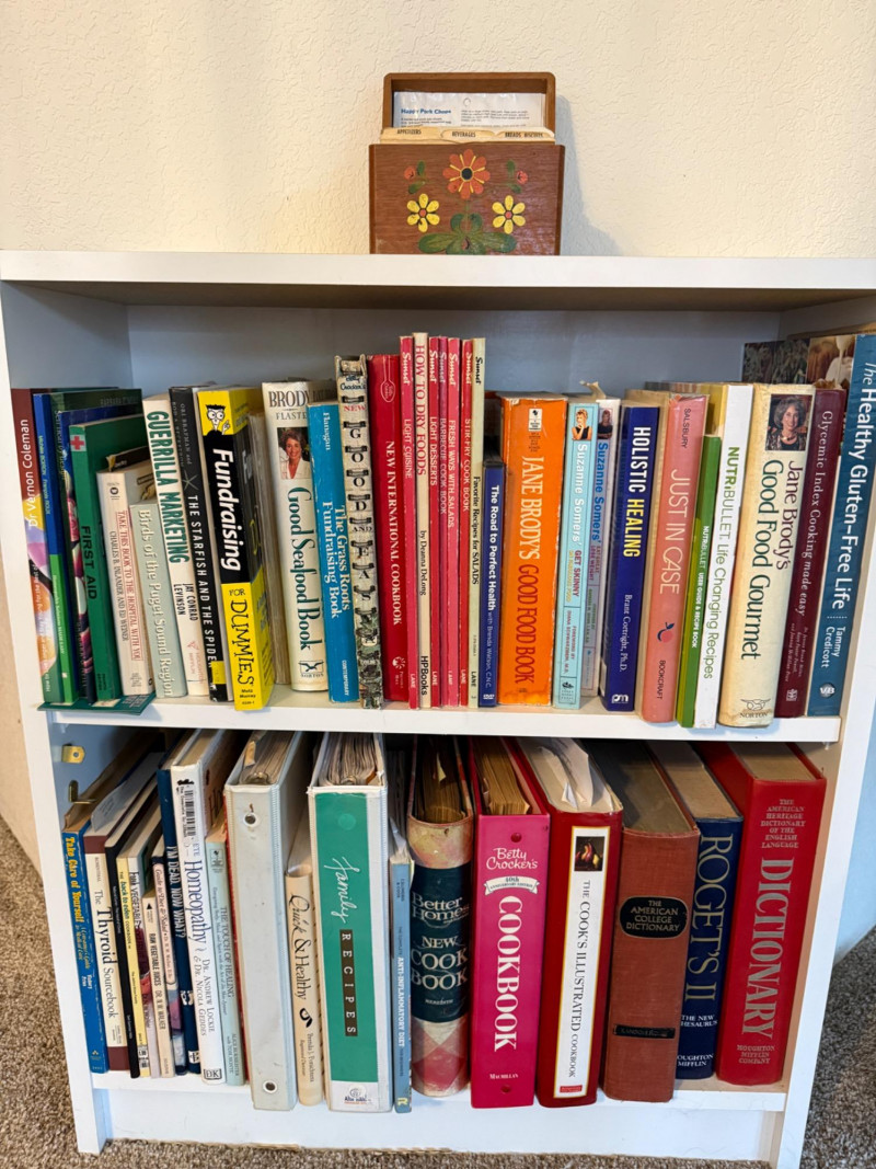 Small Bookcase of Variety Books White bookcase with one shelf chock full of books. Cookbooks, recipe cards in vintage wood box. 25x9x30”