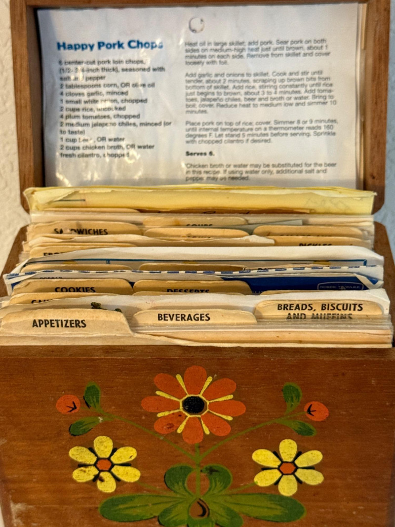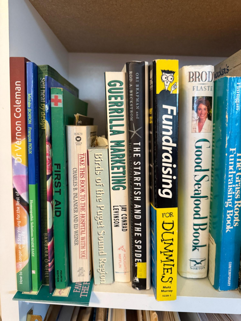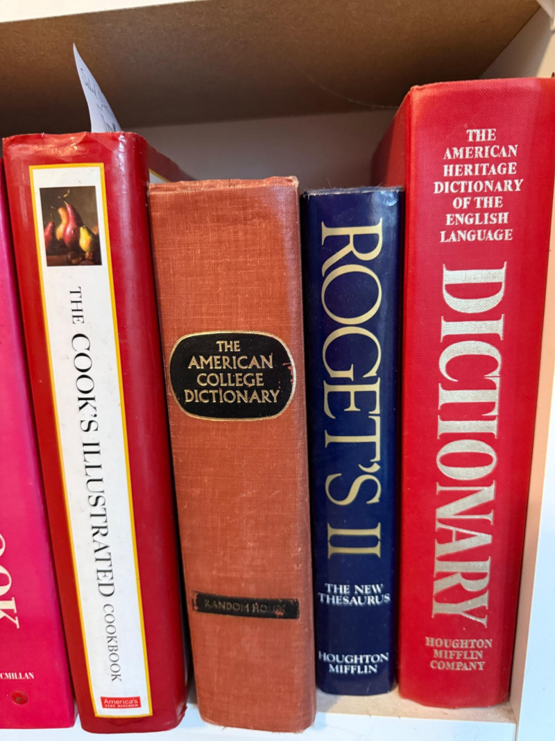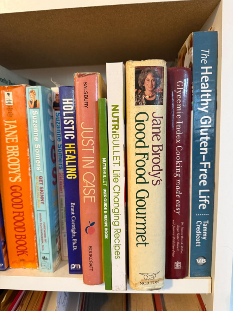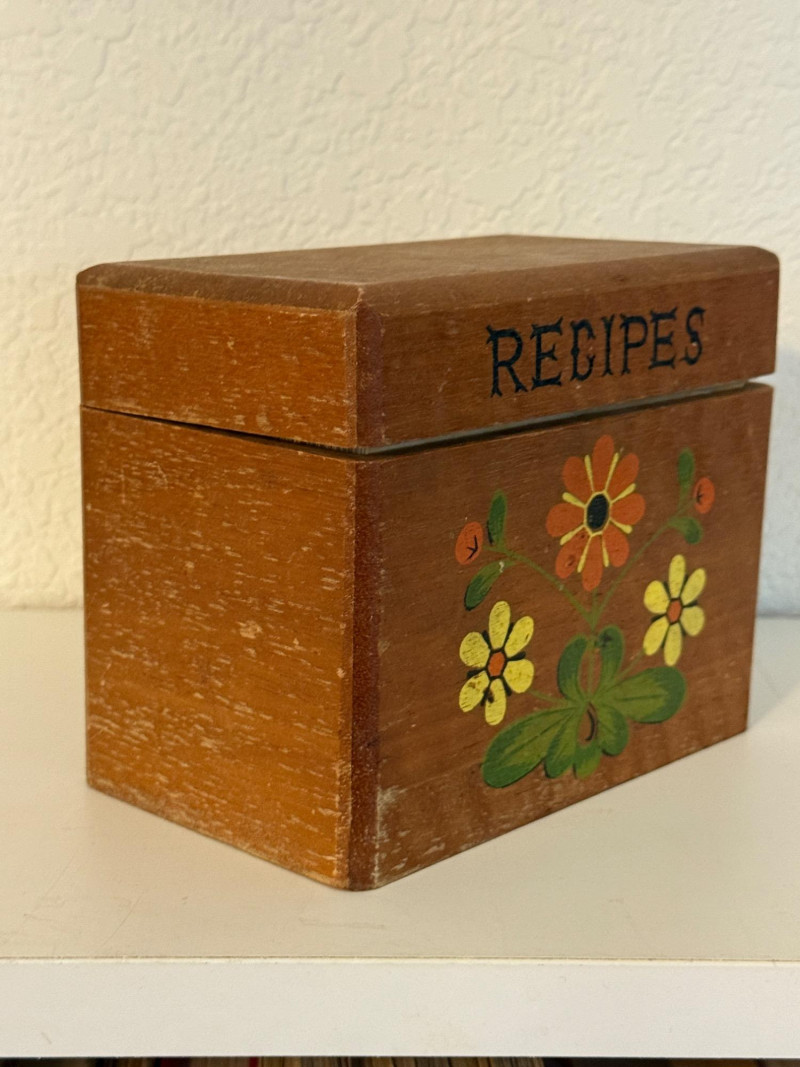 Small Bookcase of Variety Books White bookcase with one shelf chock full of books. Cookbooks, recipe cards in vintage wood box. 25x9x30”