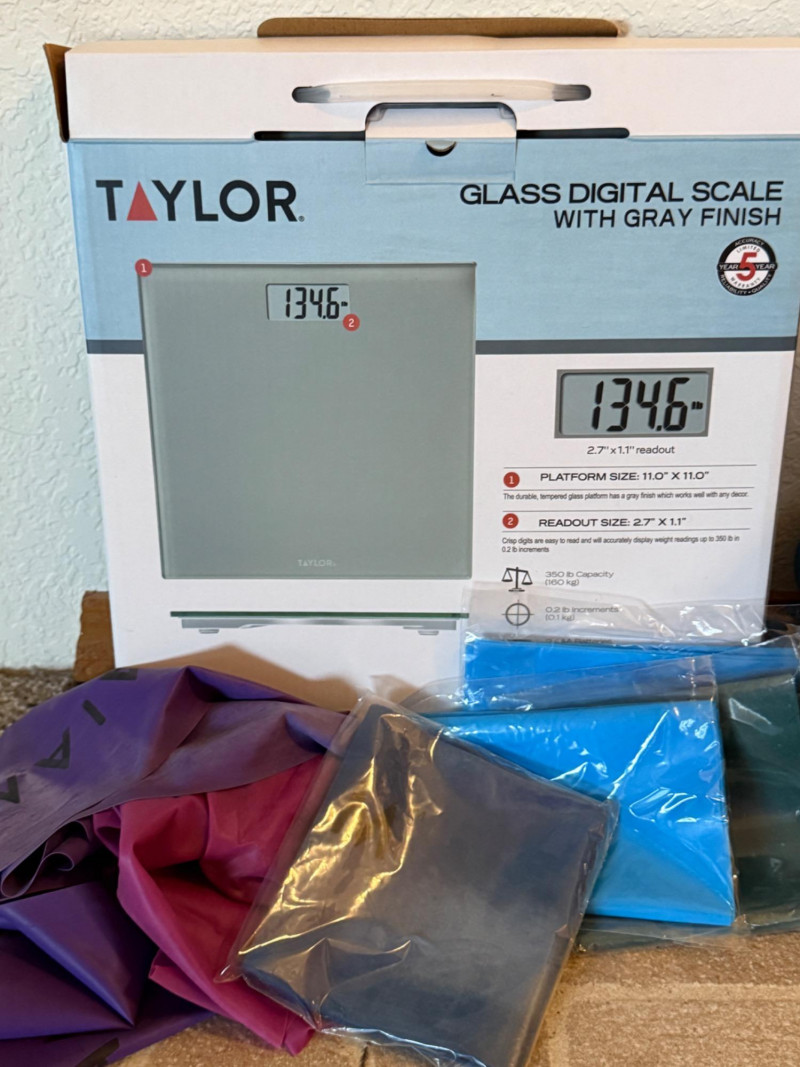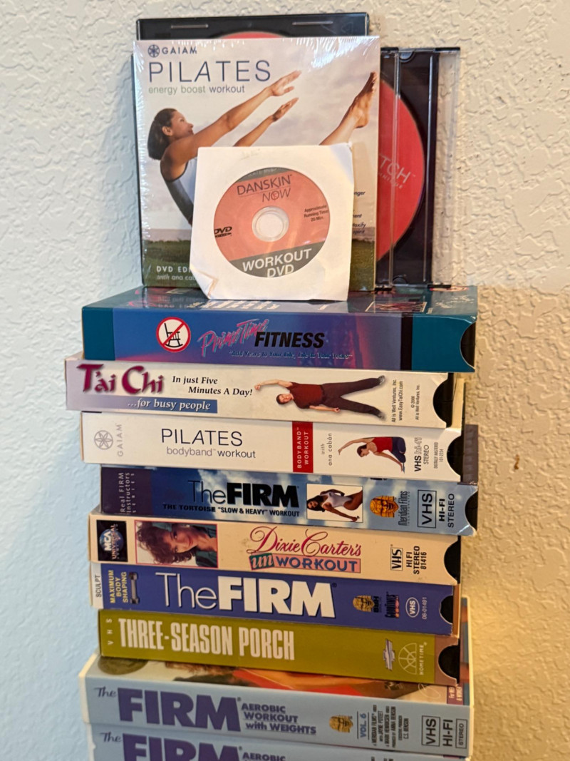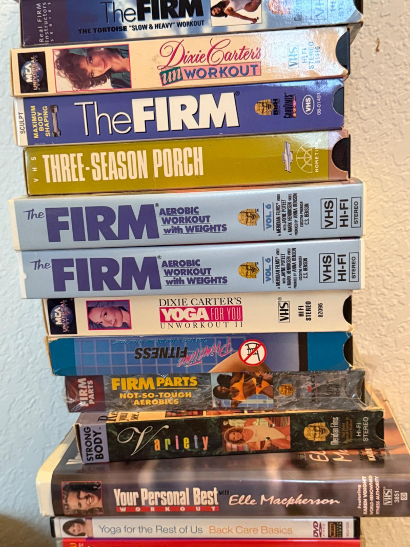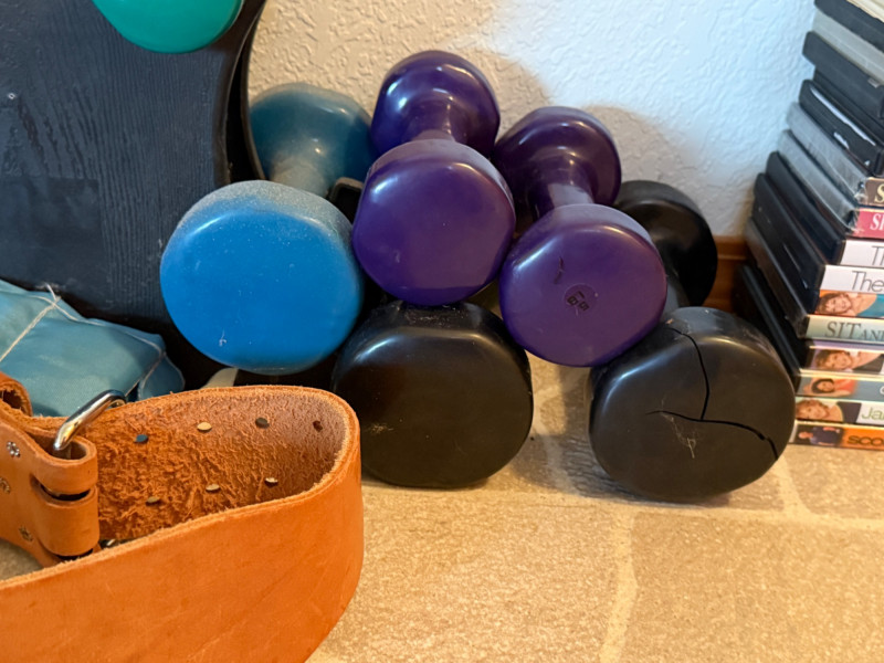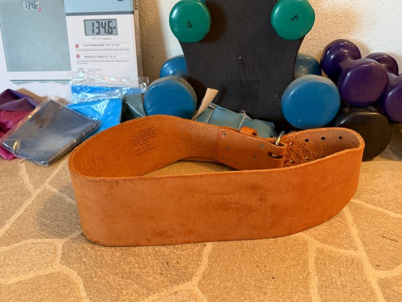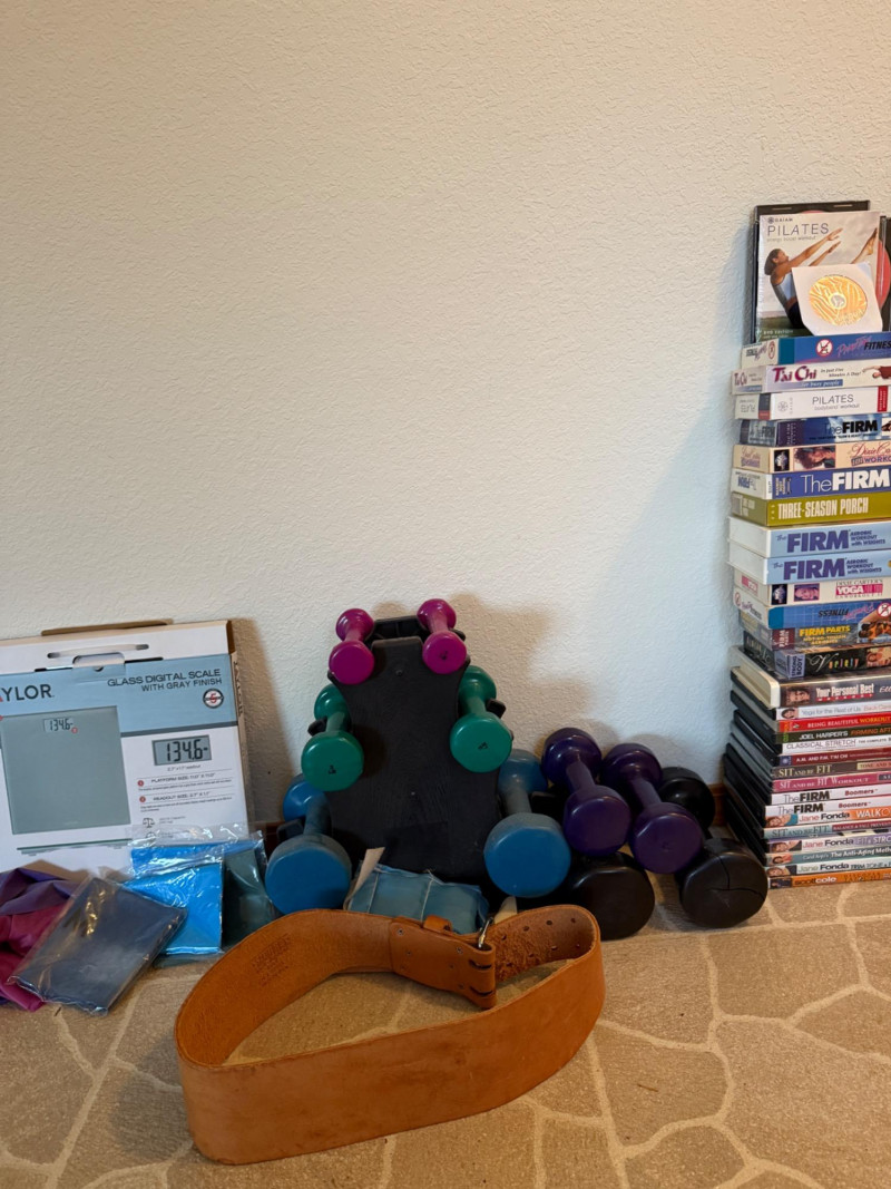 Leather Weight Belt - Hand Weight Set - Scale - DVD’s - VHS & More 1,3,5 lb hand weights in plastic stand Sierra leather back support belt Taylor scale Exercise VHS and DVD’s