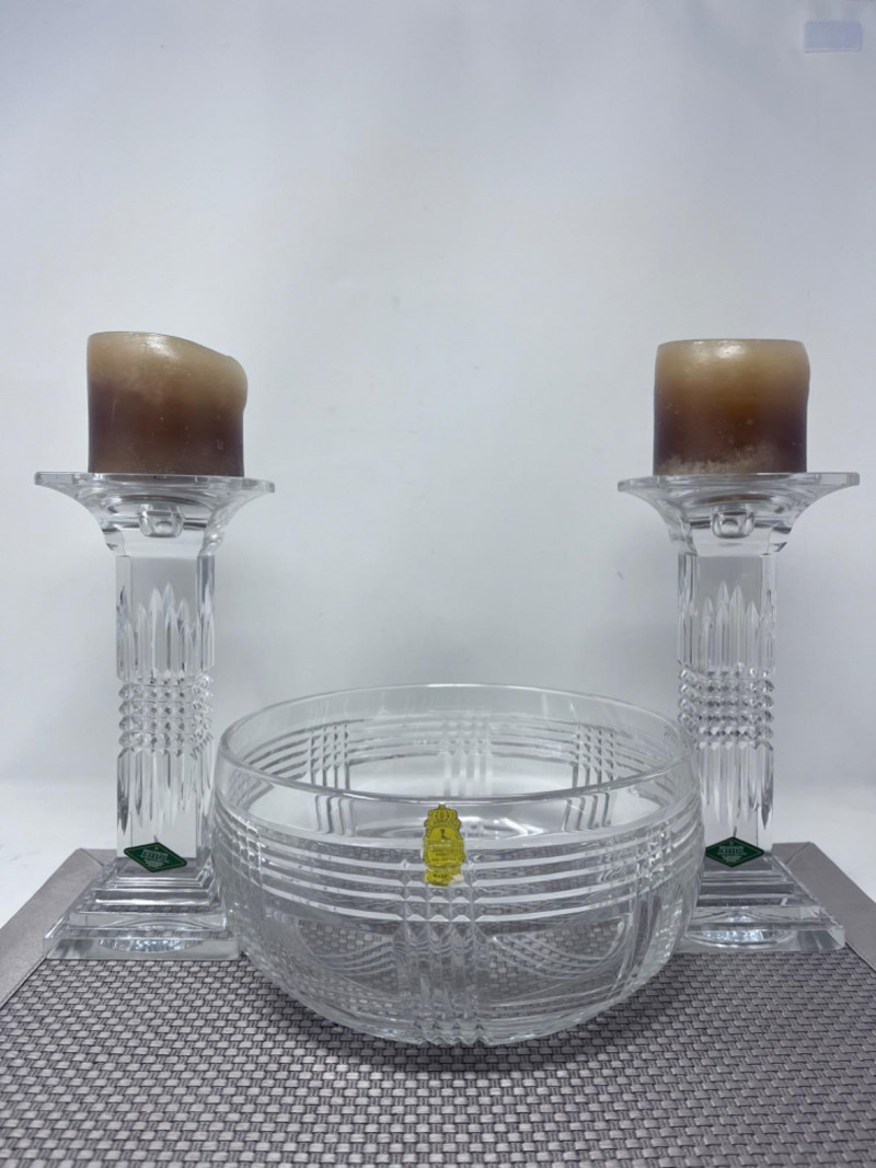 (2) Shannon Crystal Candle Pillars and an Imperlux Crystal Bowl Cut crystal candle pillars able to hold three different candle sizes. 3.5”x3.5”x9”. Hand cut crystal bowl is 8.5”x4.5”.