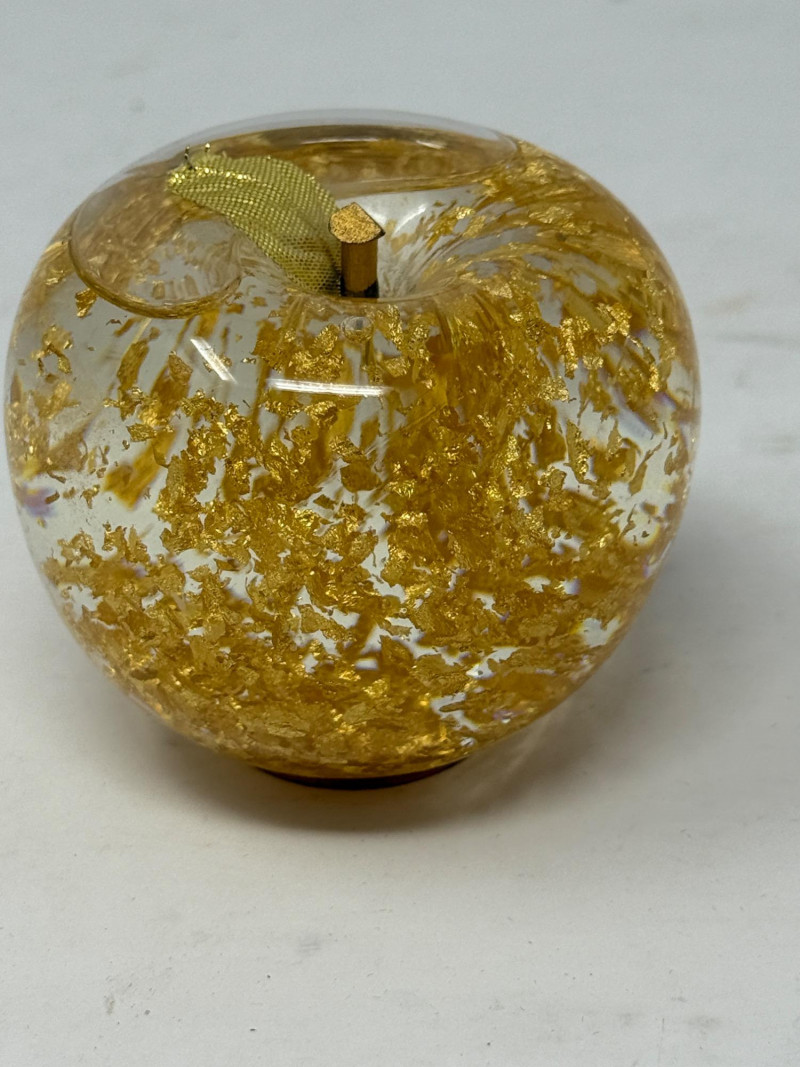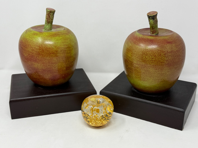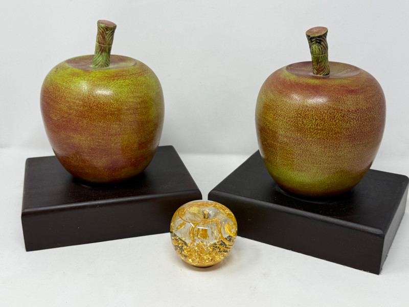 Large Ceramic Apples & Gold Flake Filled Apple Globe Large apples have felted bottoms 8x6x9.5” each and 3” gold flake glass apple