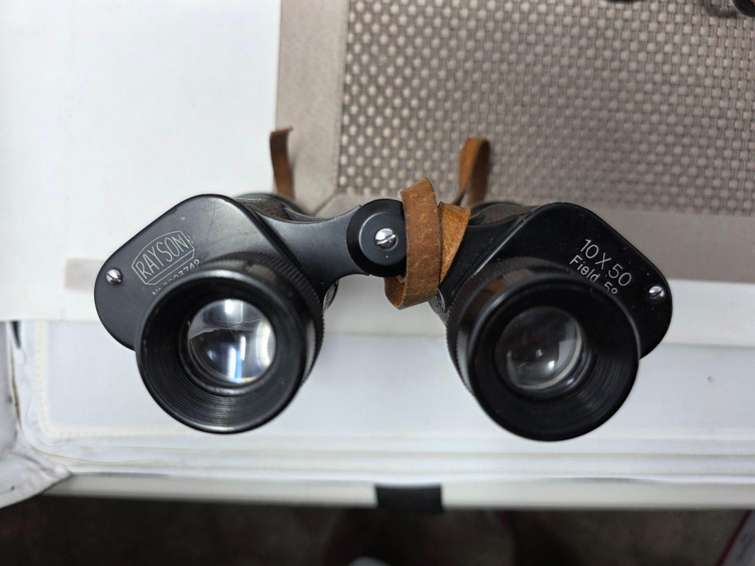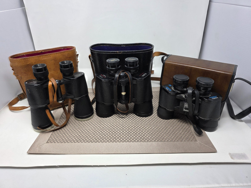 Bushnell, King & Rayson Binoculars (1) Bushnell Sportview 10x50 Extra Wide Angle (473ft at 1000 yards) (1) King Serial #20461 7x50 (372ft at 1000 yards) (1) Rayson Serial #3003742 10x50 All include carry cases 3 sets of binoculars in all!