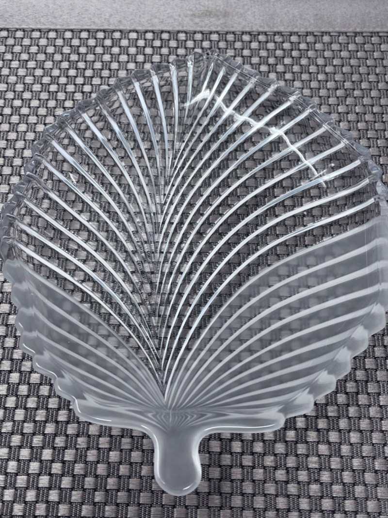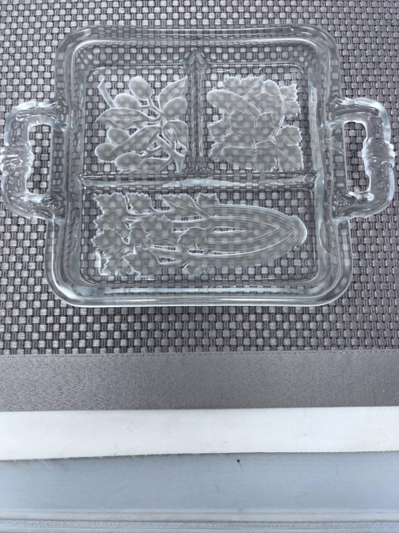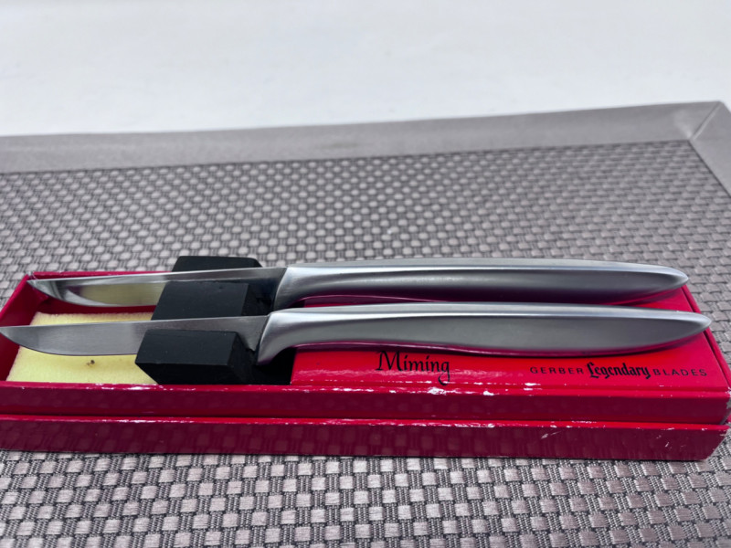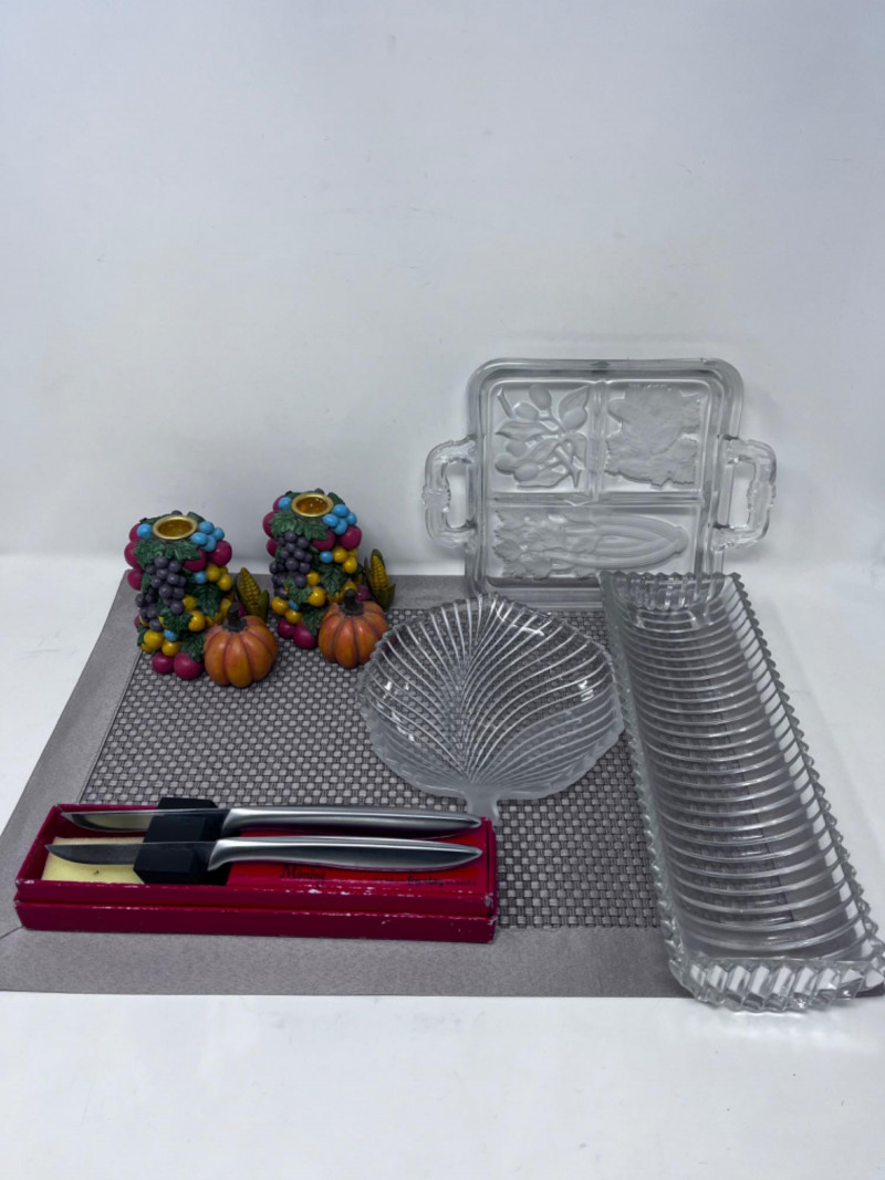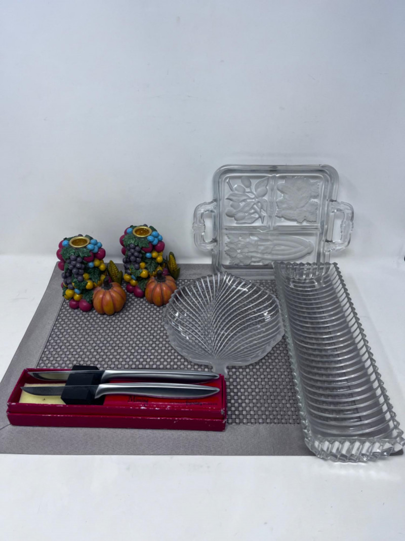 (2) Miming Gerber Knives, (3) Crystal Platters, and (2) Candle Sticks (2) Silver handled Miming Gerber Legendary Blades. (1) Partially frosted crystal leaf platter (1) Crystal platter with 3 dividers and handles (1) Ribbed glass platter 4”x12”x2”