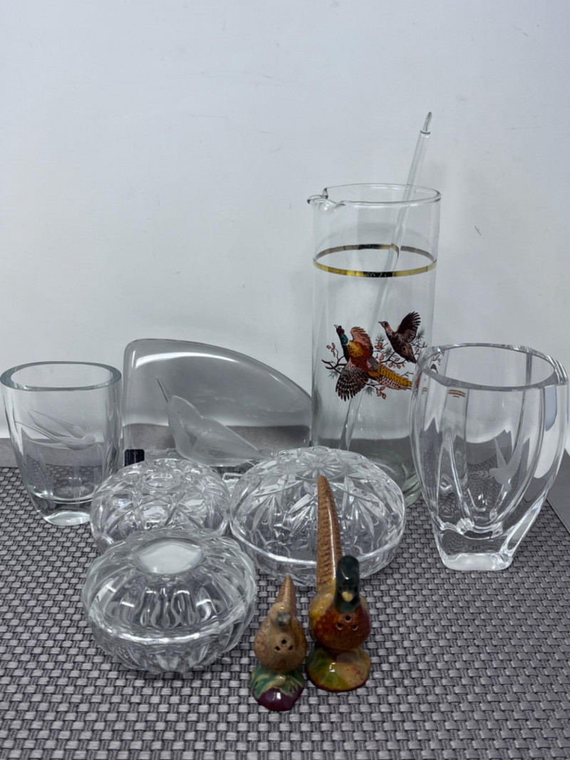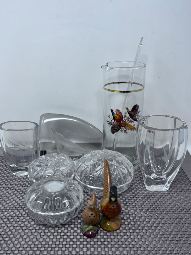 Crystal Collection and Pheasants Engraved crystal dove vase Engraved crystal swallow with cat tails vase (3) Crystal trinket dishes with lids Pheasant glass with stir stick Male and Female pheasant salt and pepper shaker