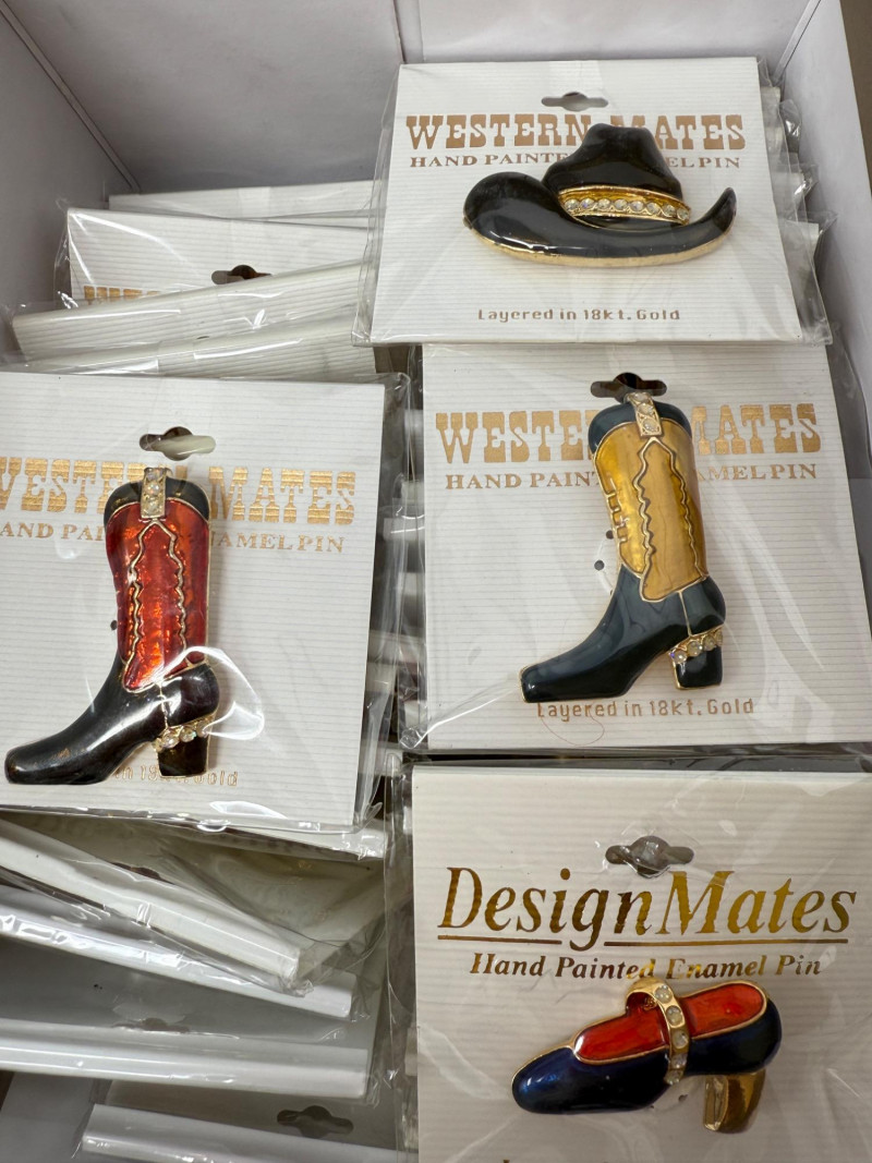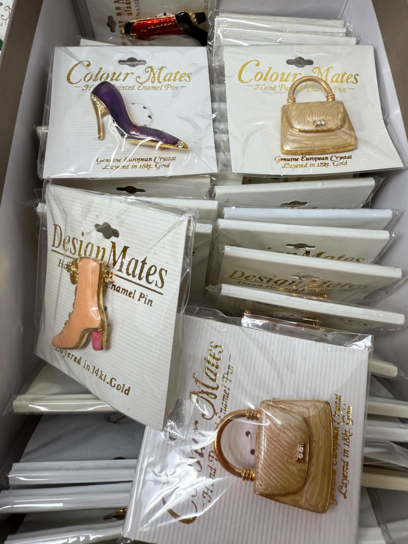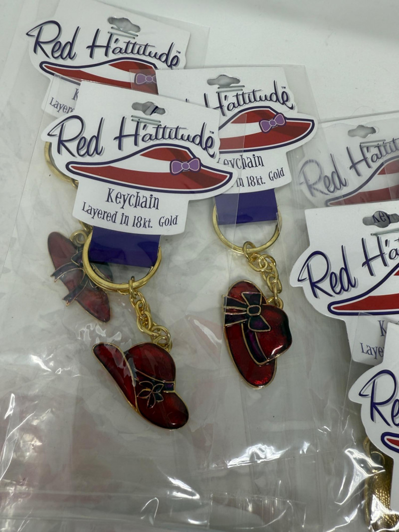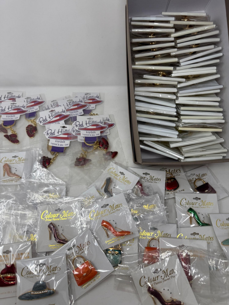 Hand Painted Enamel Pins & Red Hattitude Keychains All layered in 18K gold (73) Hats and shoes and boot and bags pins (11) Red Hattitude Keychains NIP and ready for retail