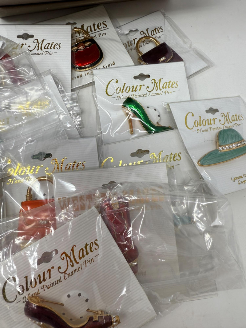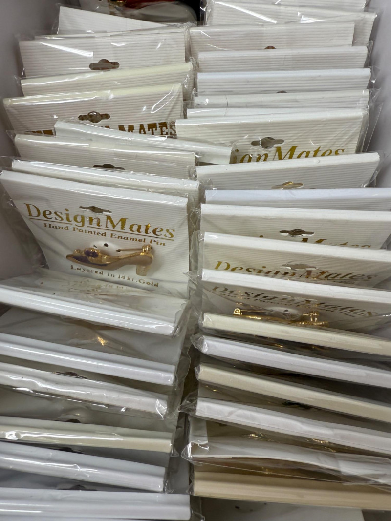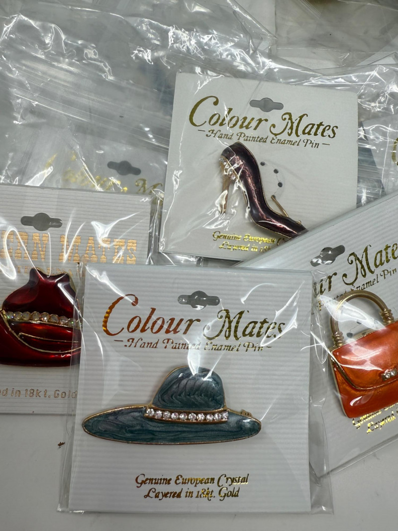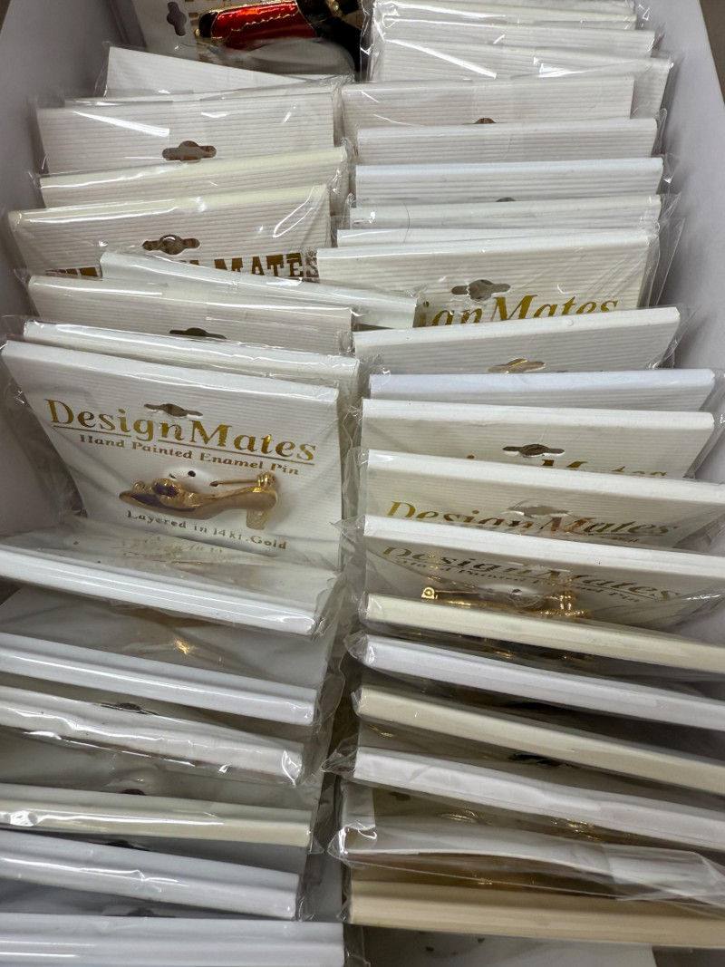 Hand Painted Enamel Pins & Red Hattitude Keychains All layered in 18K gold (73) Hats and shoes and boot and bags pins (11) Red Hattitude Keychains NIP and ready for retail