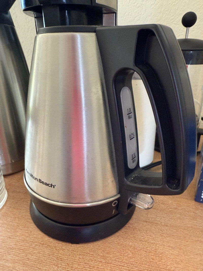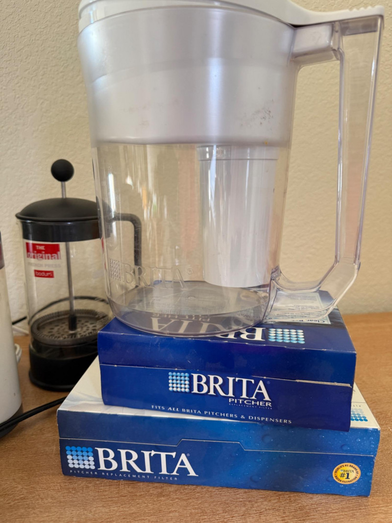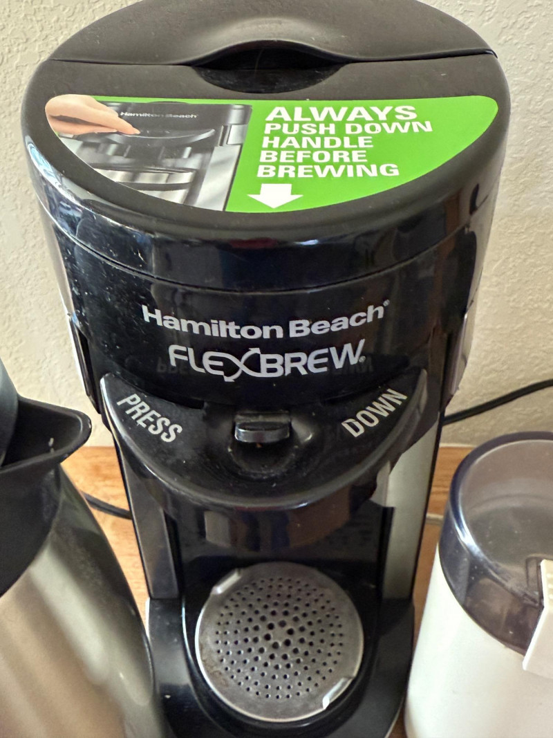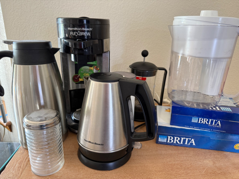 Single Brew Coffee Maker - Brita & 7 Filters - Elec Kettle - Grinder Hamilton Beach Flex Brew single cup coffee maker Brita water filter pitcher and 7 filters Hamilton Beach electric kettle Bodum French Press Thermal Carafe Sugar dispenser