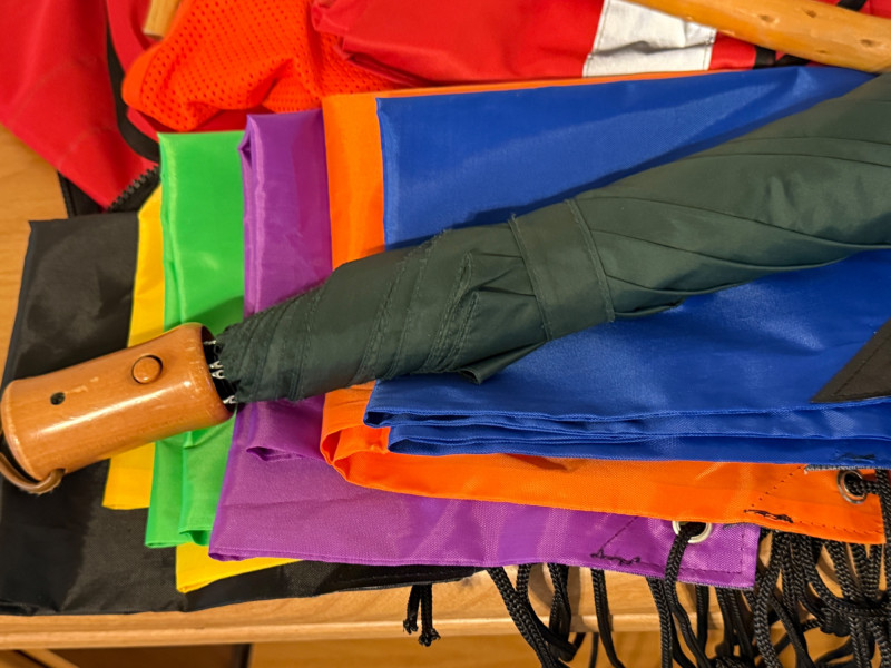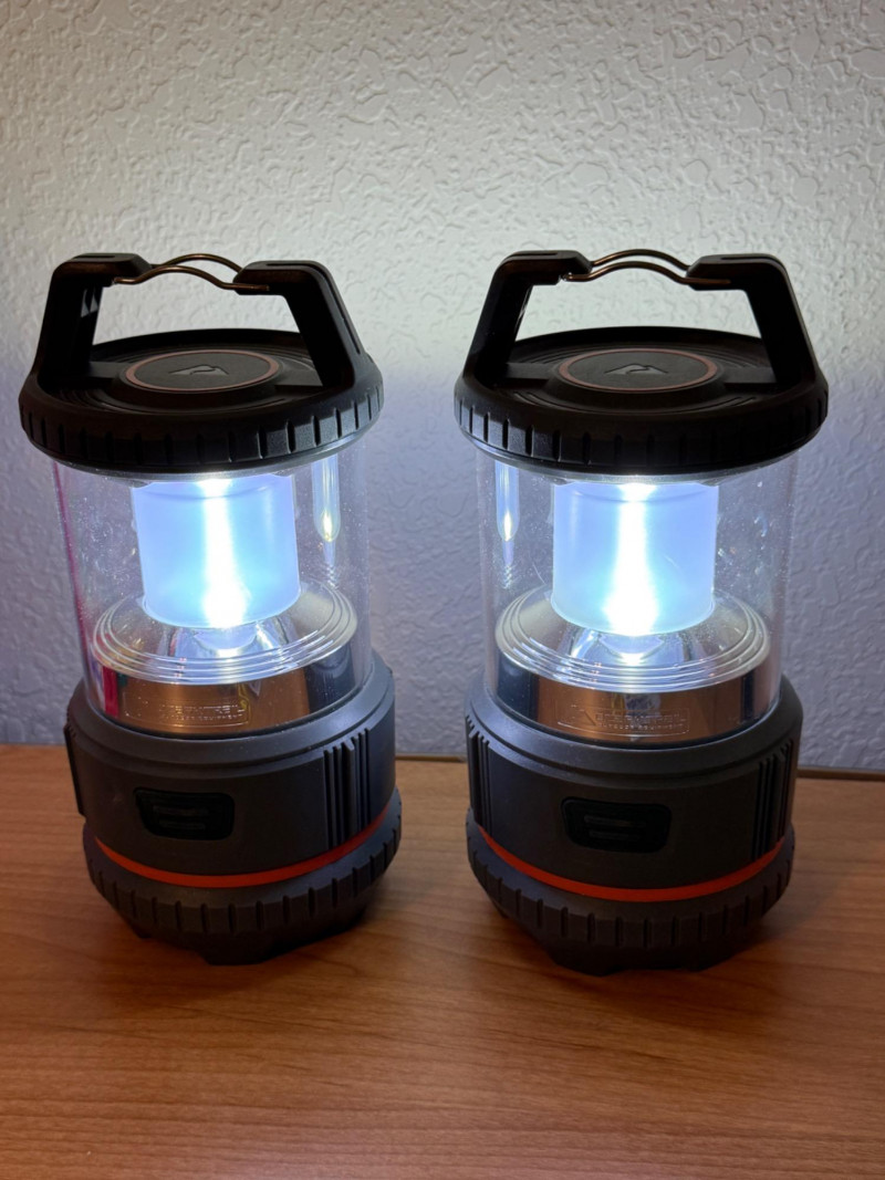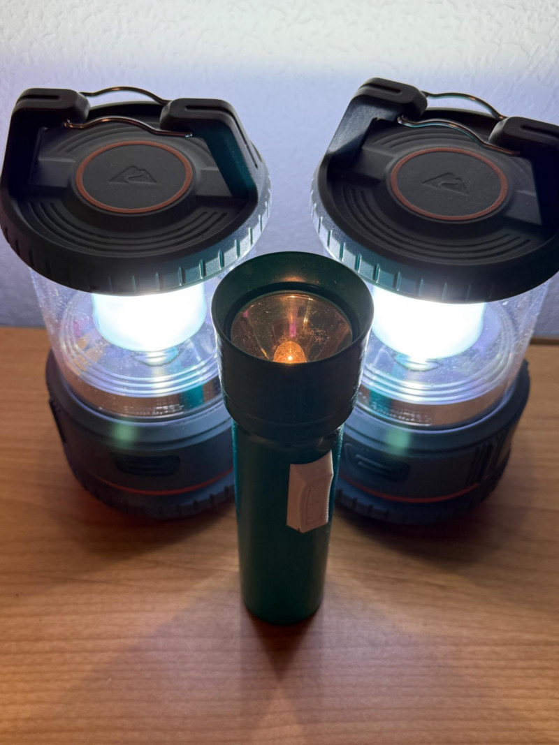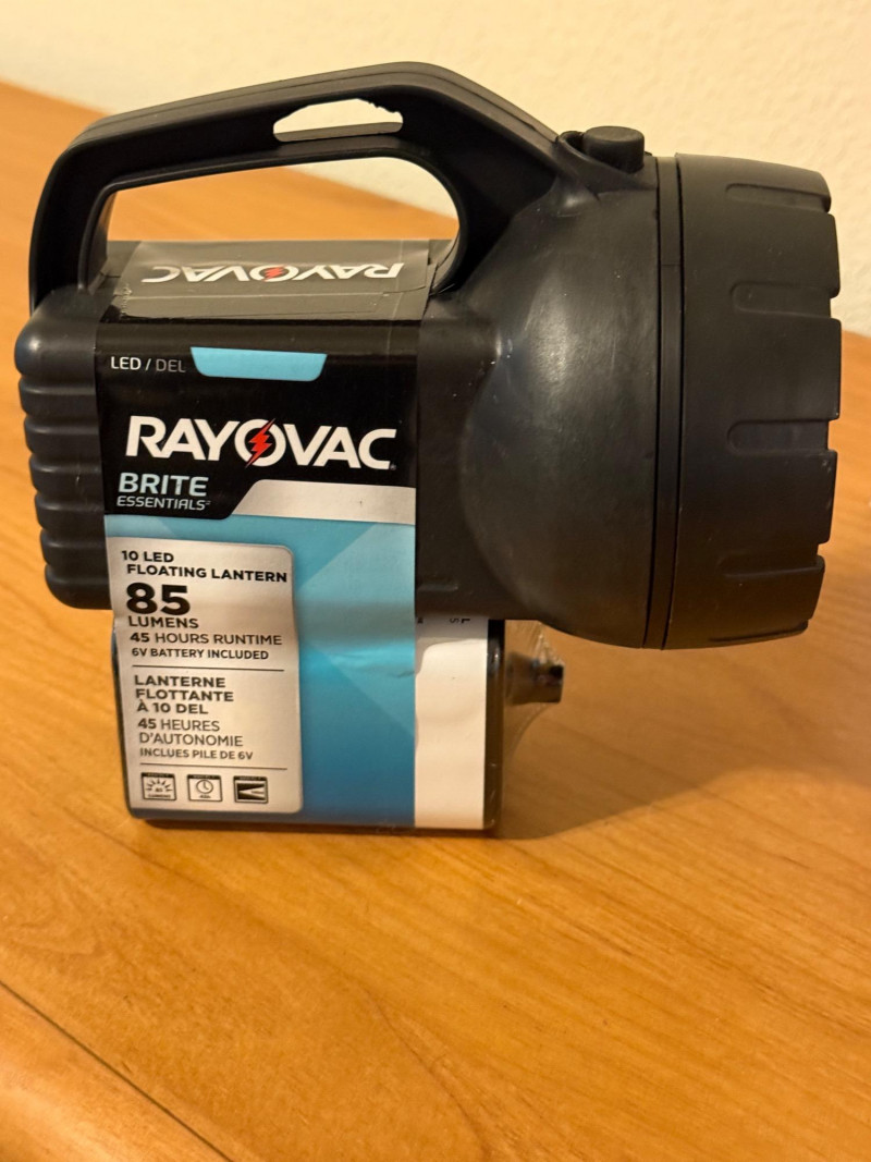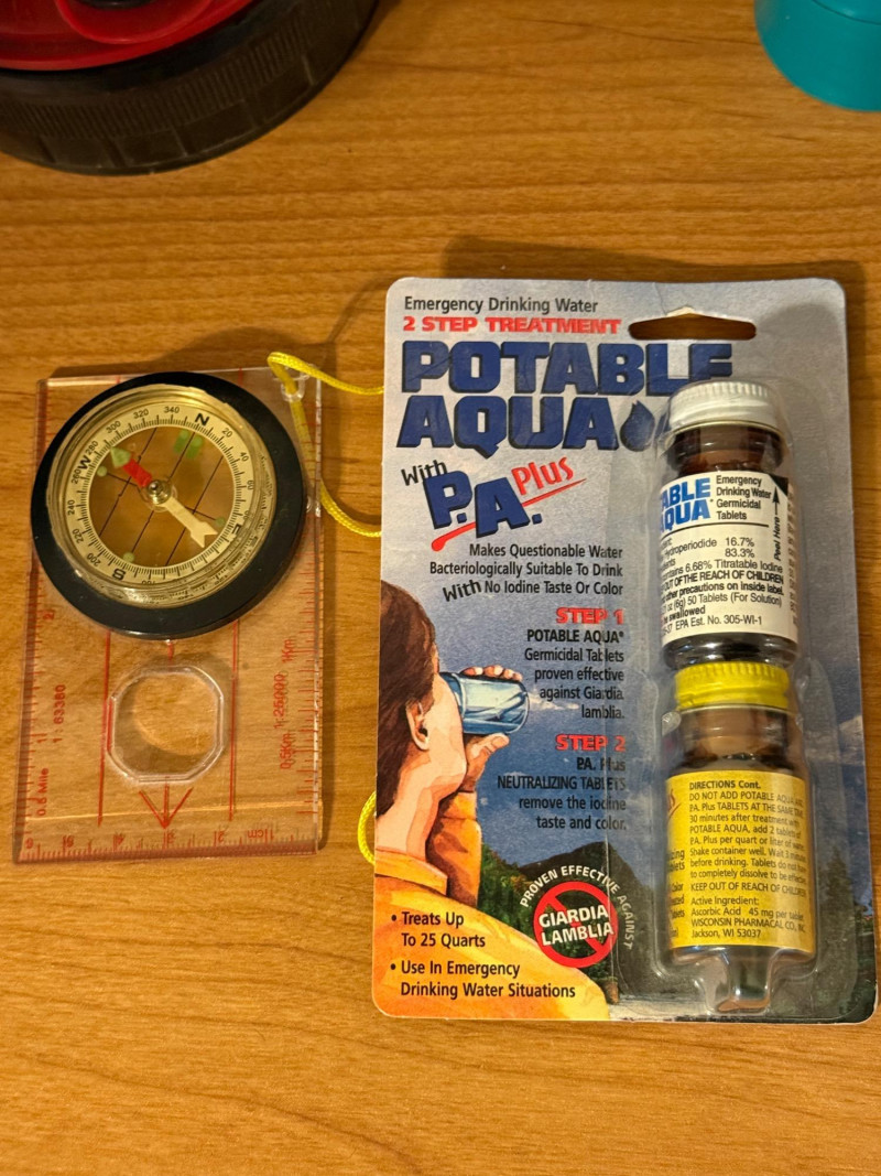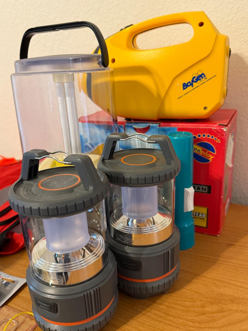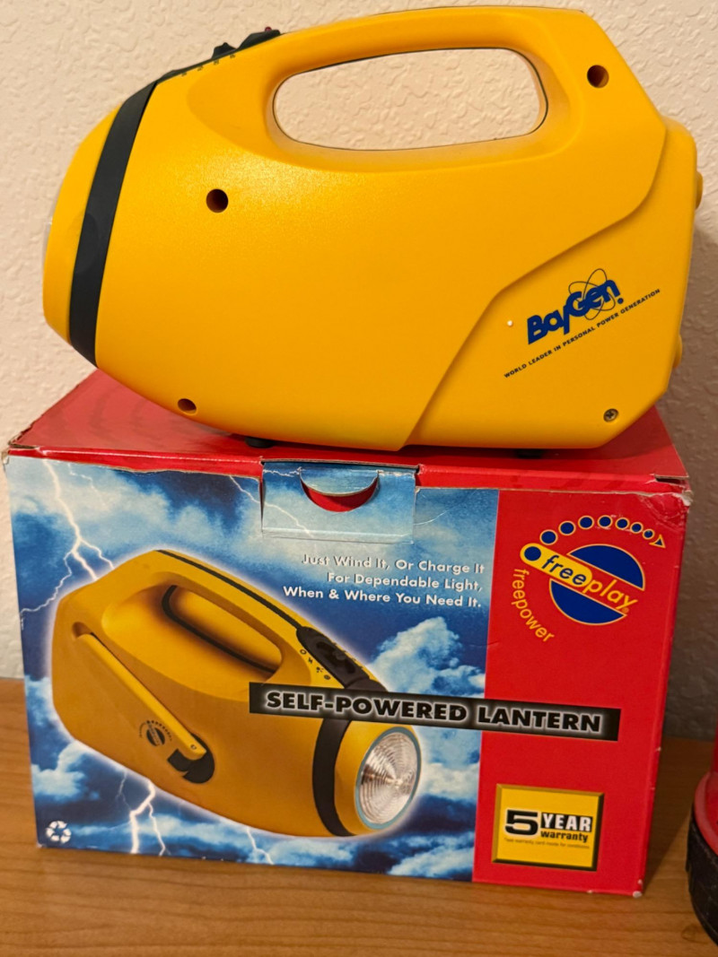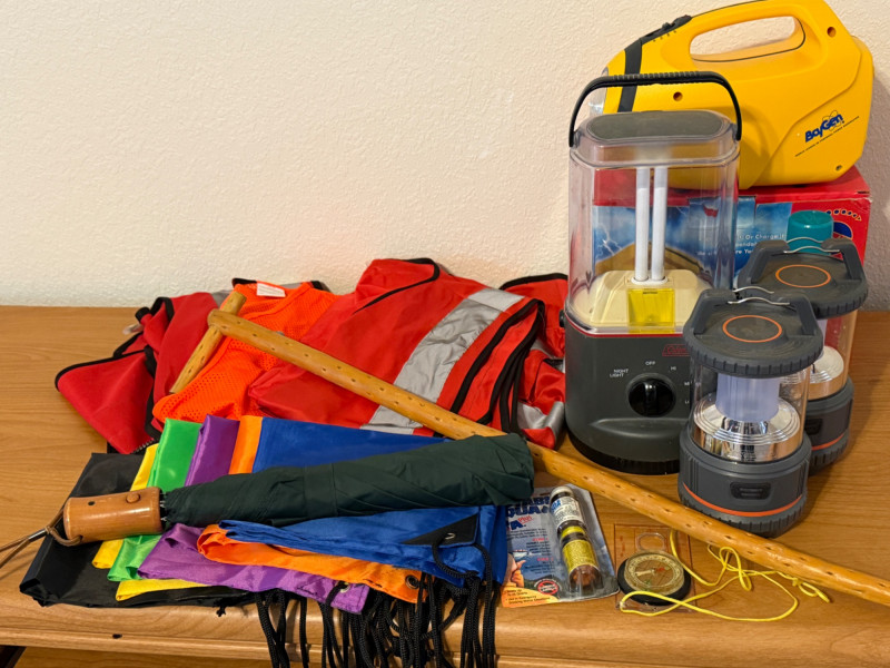 Safety Lighting - Water Purifying Tablets & Compass BayGen Self powered crank lantern in original box 2- Battery 2 light level LED lanterns with clip handles Coleman battery fluorescent lantern. Needs batteries NIP Water purification tablets Compass 3 Safety Vests 6 Polyester Drawstring Bags Umbrella Wood walking cane