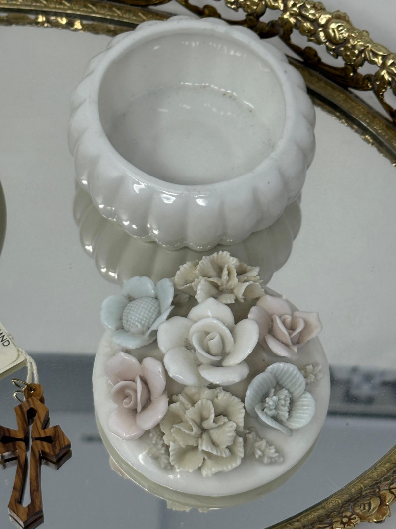 Ardalt Lenwile Verithin porcelain trinket box with 3D floral appliqués on the lid.