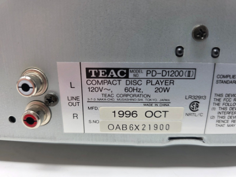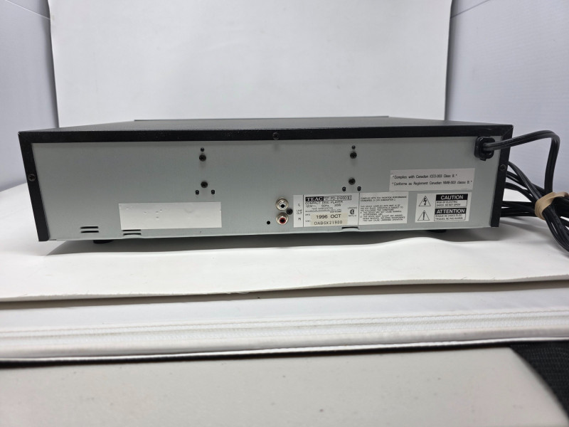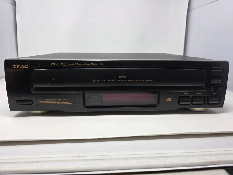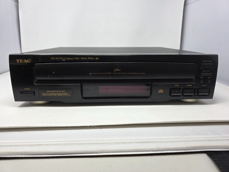 TEAC PD-D1200 Compact 5 Disc Multi Player Model #PD-D1200 Manufactured Oct 1996 The TEAC PD-D1200 is a vintage 5-disc carousel-style CD changer that was manufactured in the late 1990s. It is designed for home audio systems and features shuffle play and a headphone jack. Tray slides out slowly Tested - Powered On! 4.5"T x 17"W x 14.5"D