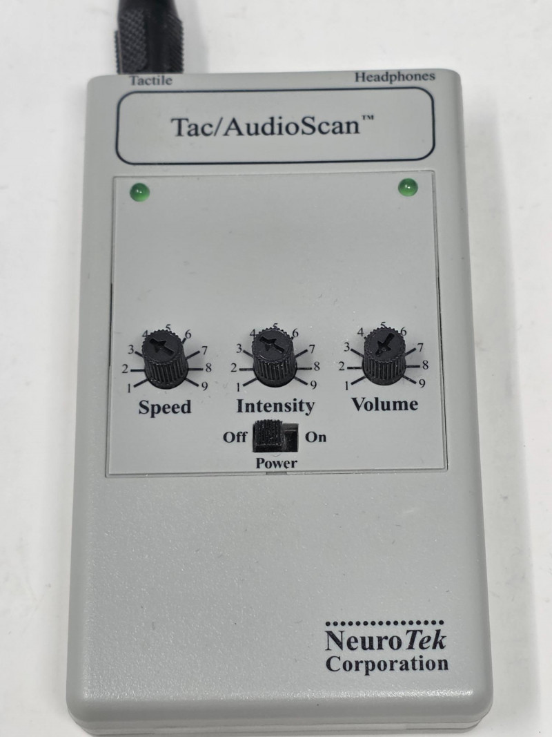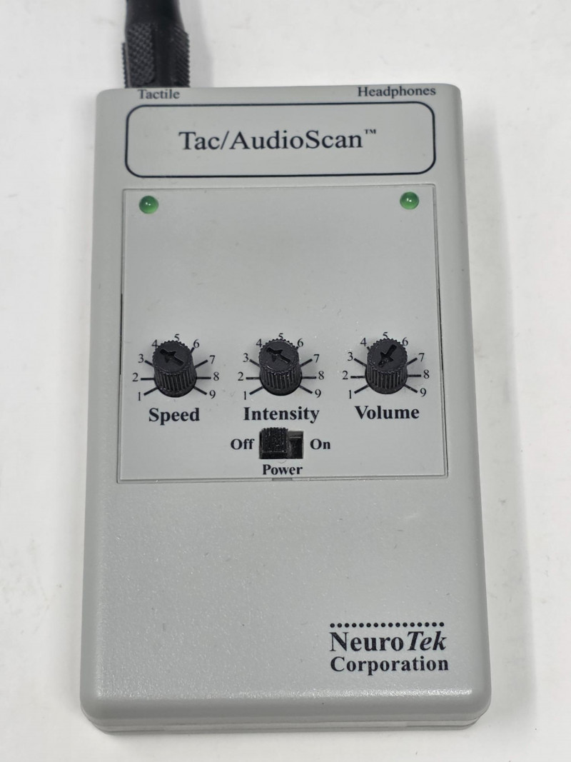 NeuroTek Tac/AudioScan Unit Specialized piece of equipment used in Eye Movement Desensitization and Reprocessing (EMDR) therapy. It is designed to provide bilateral stimulation (alternating left-right) through both tactile (vibrating pulsers) and auditory (headphones) means. The device has controls for adjusting the speed, intensity of the tactile pulsers, and volume of the audio stimulation. This type of equipment helps therapists facilitate the EMDR process, which is used to alleviate symptoms from traumatic memories. The unit can be powered by a 9-volt battery or an AC adapter for portability. AC adapter, tactile pads & manuals included Appears in near-new or barely used condition Tested - Works! 4"T x 2.4"W