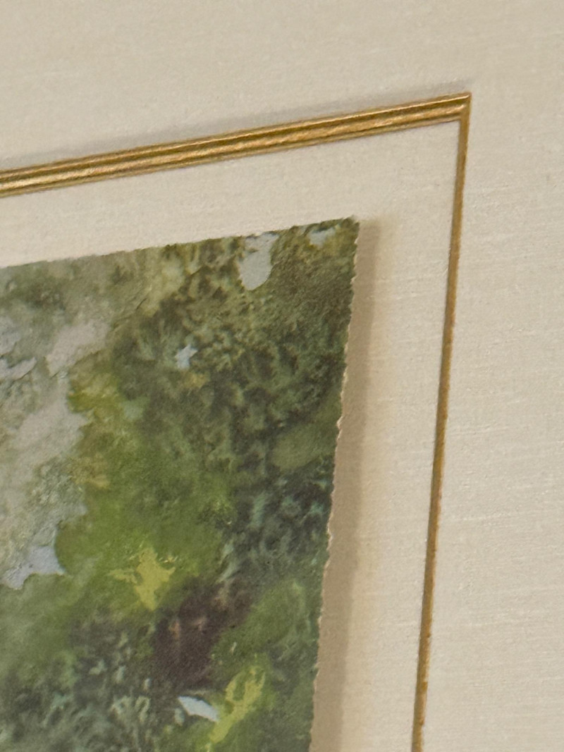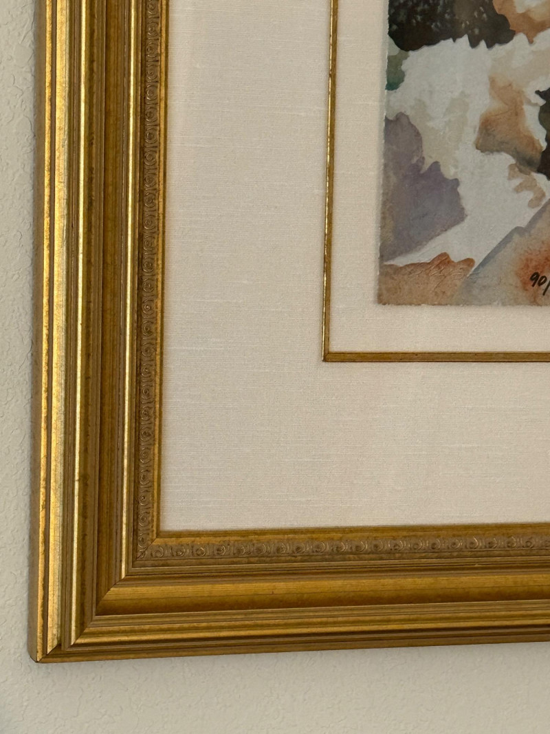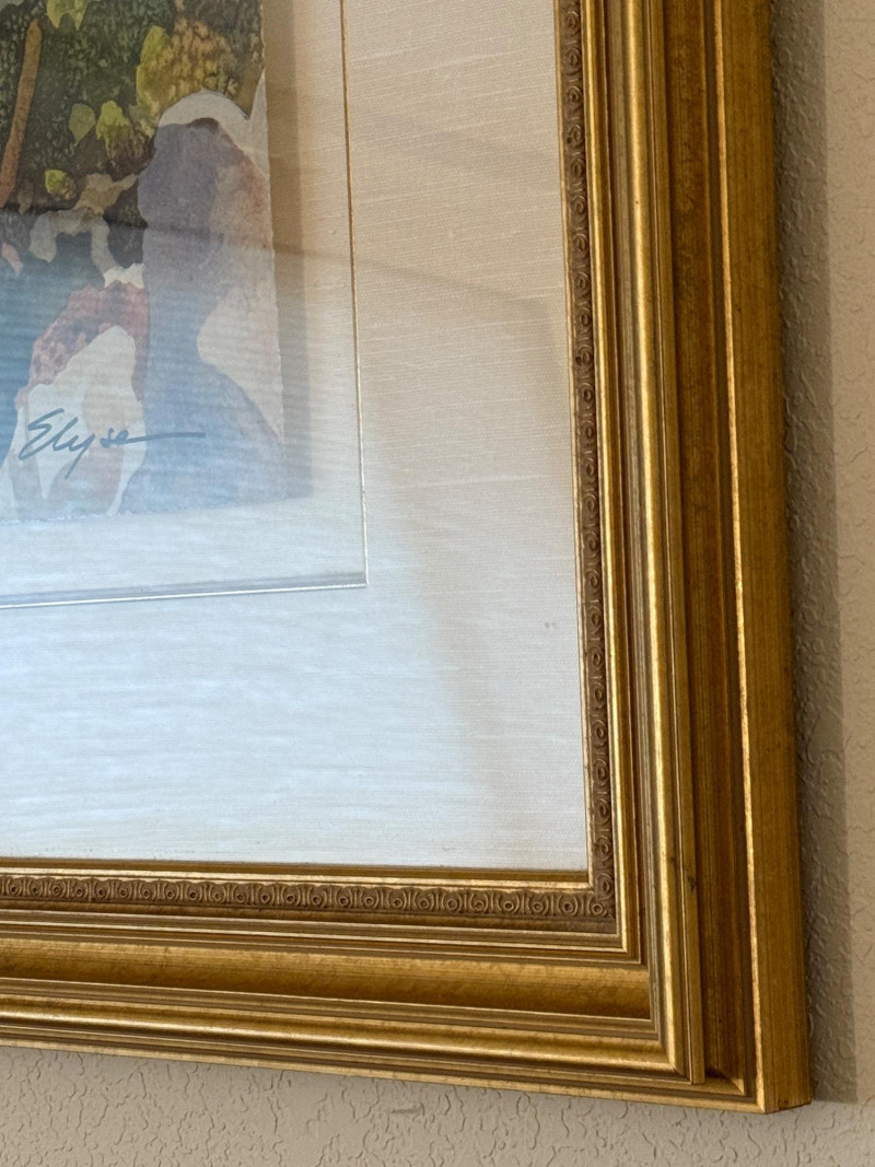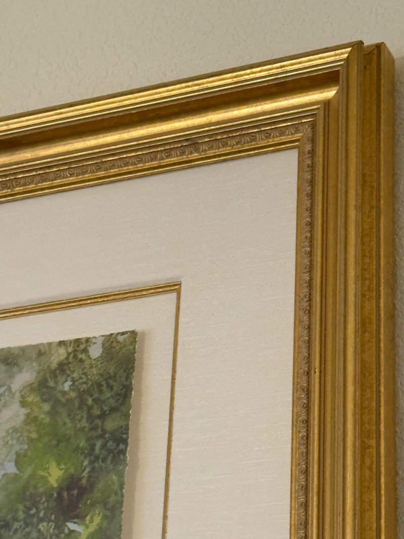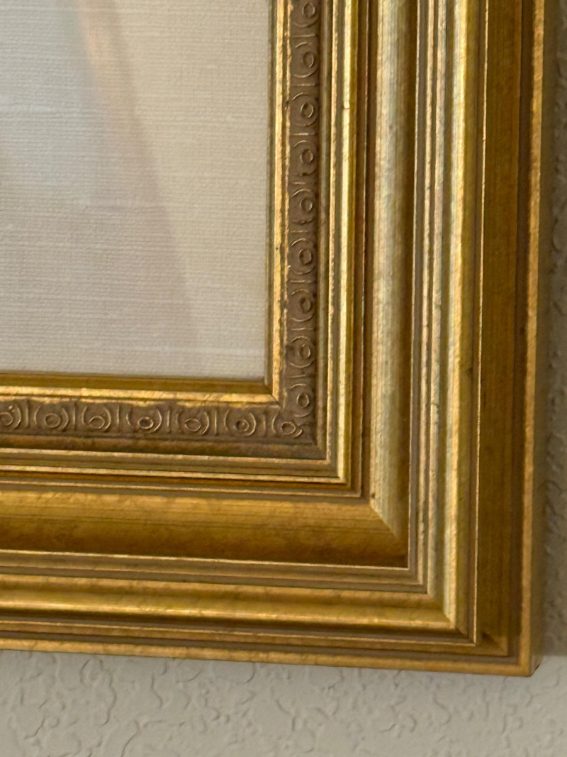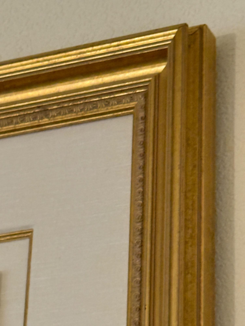This lithograph is matted and framed under glass with gold wood frame.
