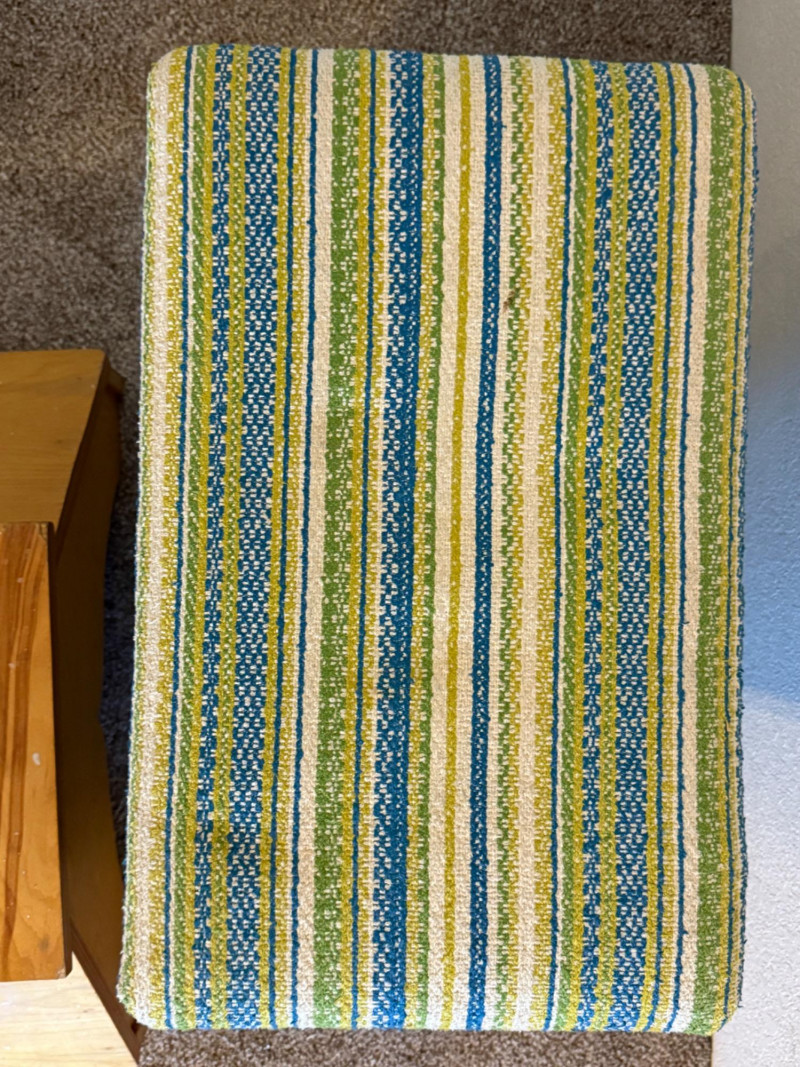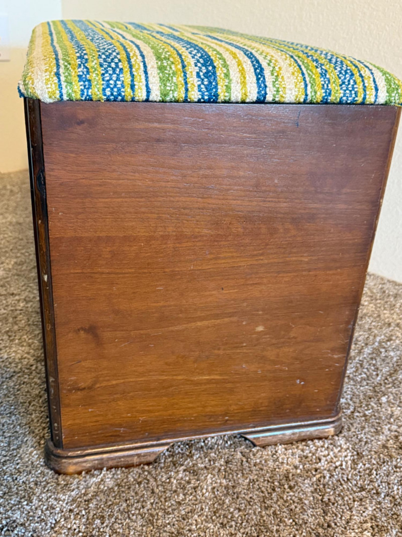 Antique bench is 22x14.5x18” seat height. Blue and green upholstery on an antique vanity bench.