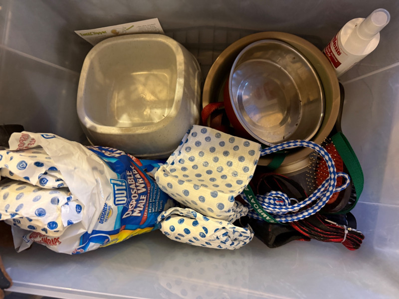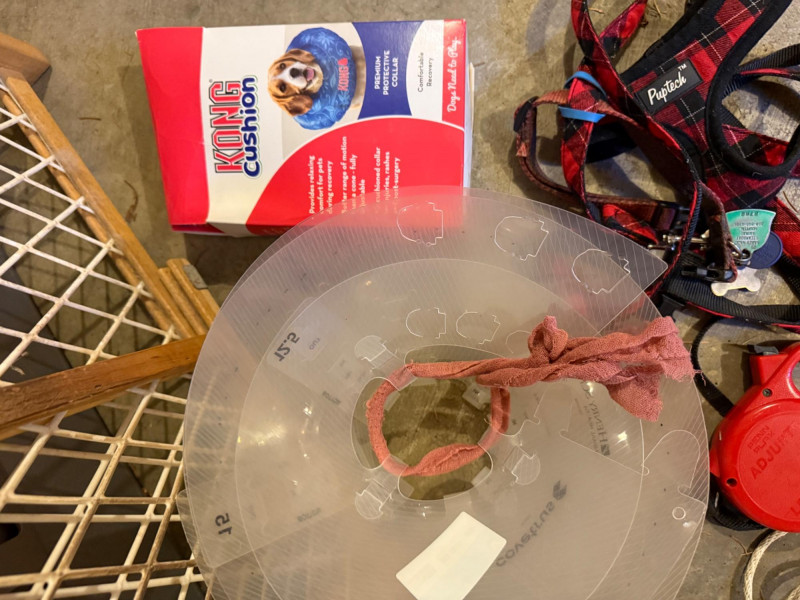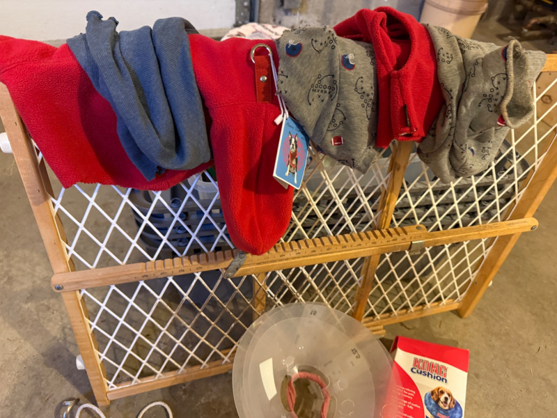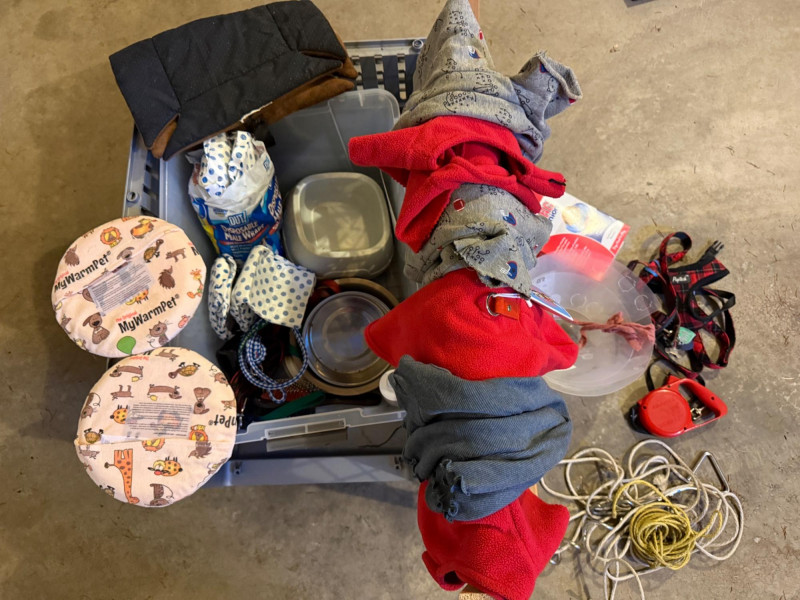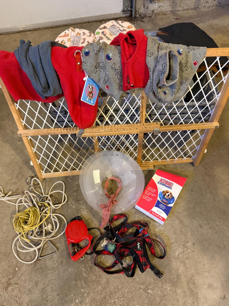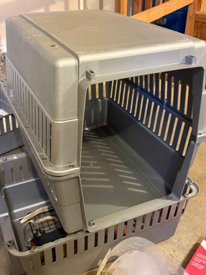 Pet Crates and Accessories - Huge Collection Two - 28x21x22” crates with doors and hardware. Tie out, retractable leash Harness and leash sets Dishes Pet gate Me disposable underwear 2 microwaveable warming discs E collars and Kong cushion collar Medium Crate mats Green heated water dish