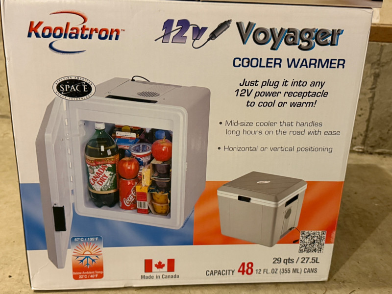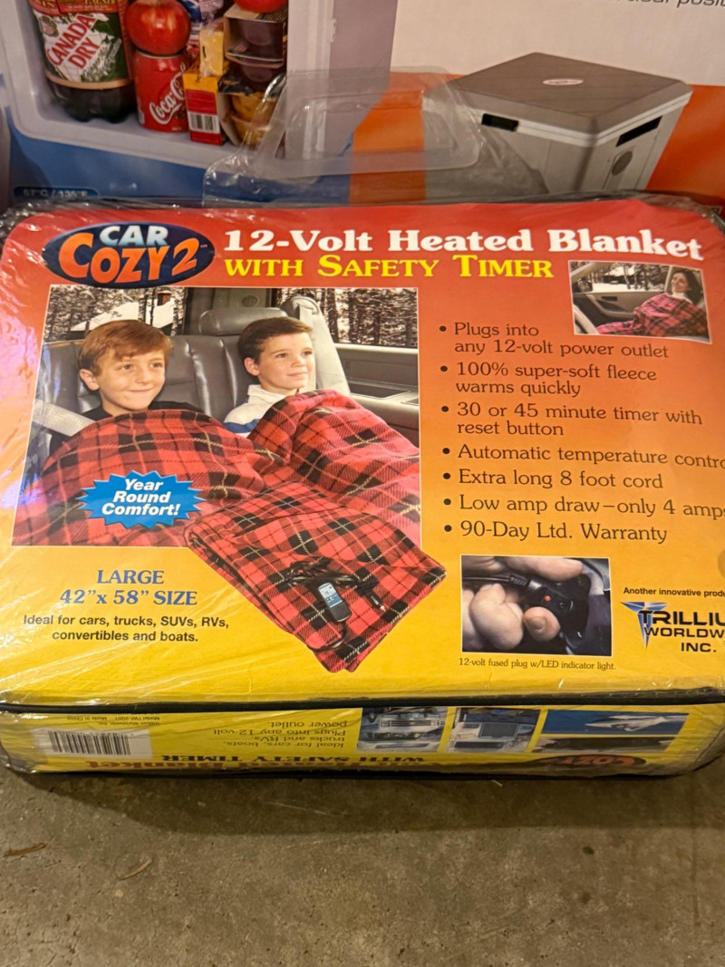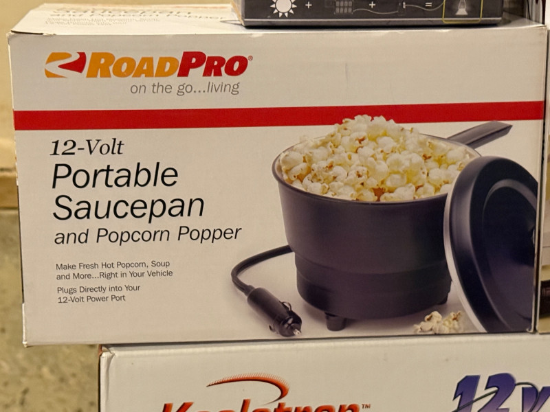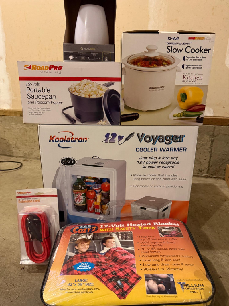 Portable 12V Travel Collection All appear new Koolatron Voyager Cooler/Warmer Car Cozy2 Heated Blanket 42x58” Slow Cooker Portable Saucepan/Popcorn Popper 12’ lighter socket extension cord Not tested Portable LED lamp