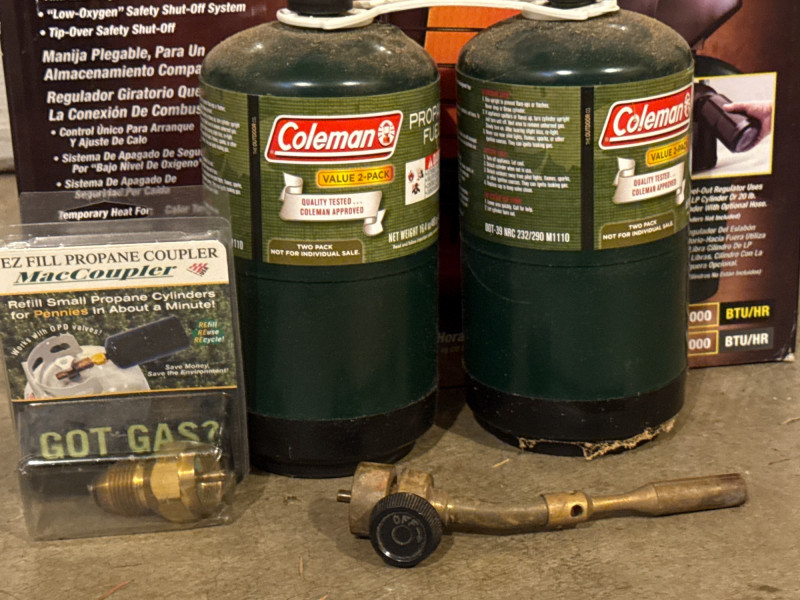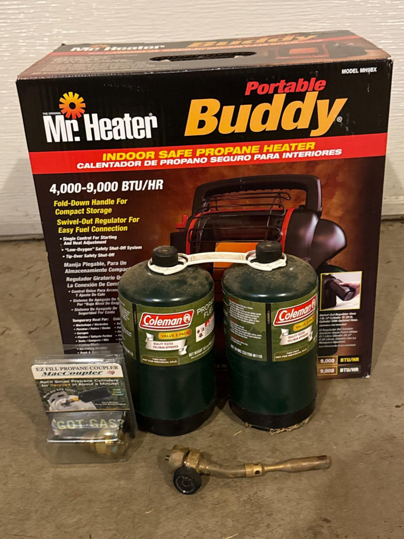 Mr Heater Portable Buddy Indoor Safe Propane Heater With 2- 16 ounce propane fuel bottles, easy fill coupler and torch attachment.