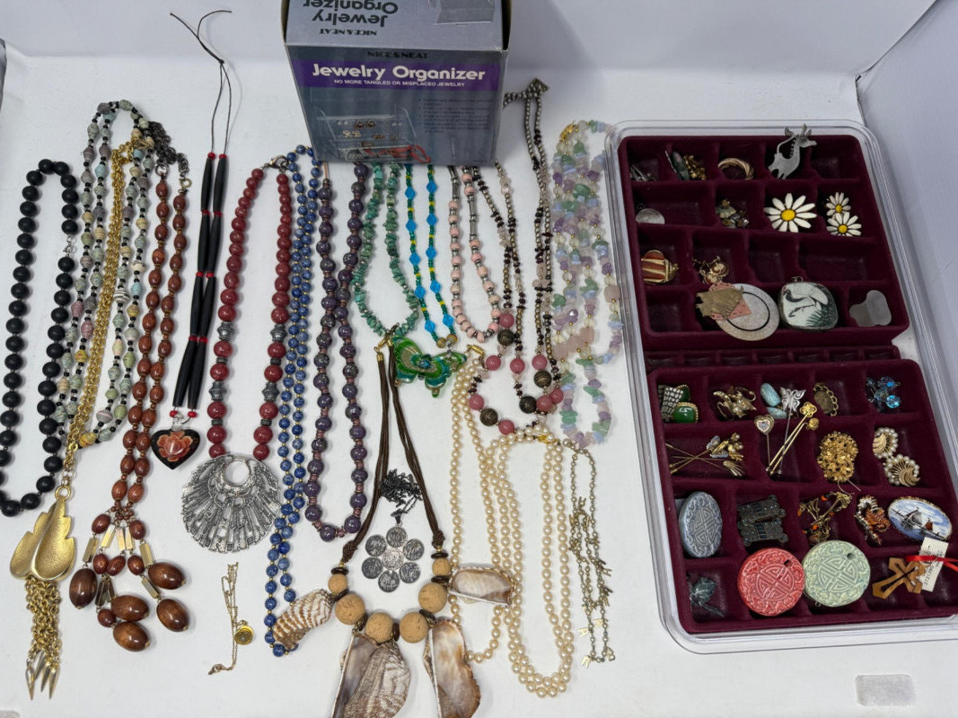 Costume Jewelry & Beaded Necklaces 19 necklaces Pins Earrings Pendants and some groovy Daisy earring and pin set.