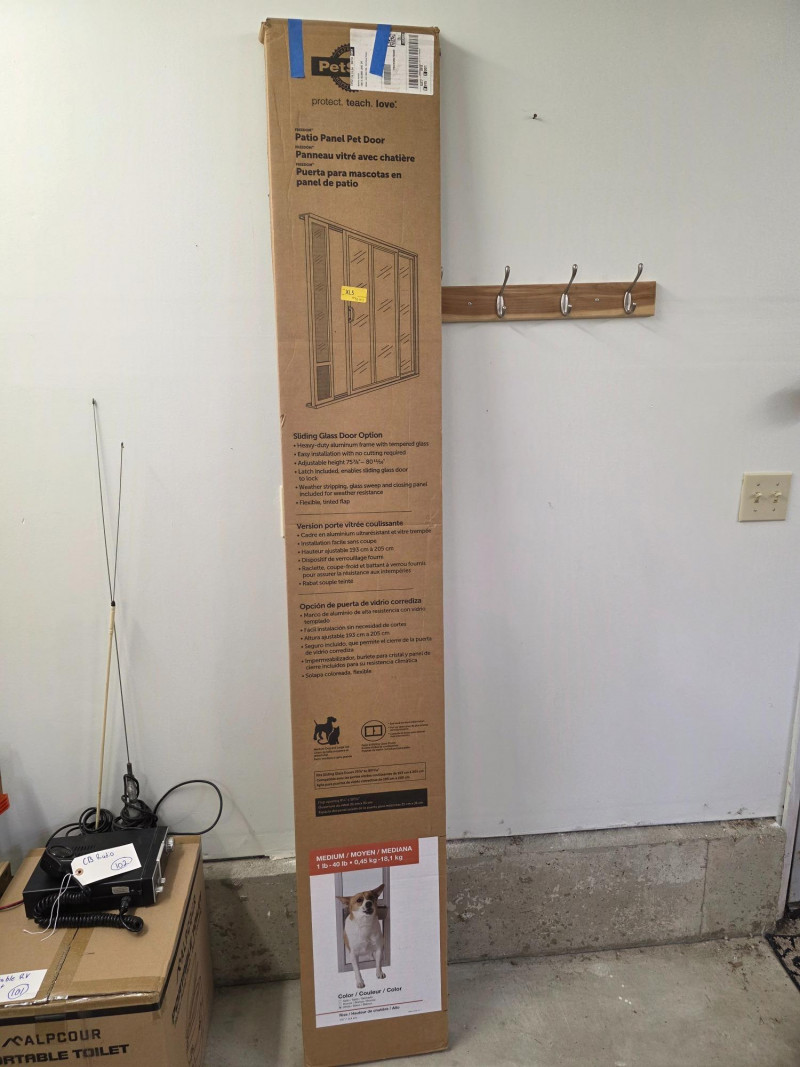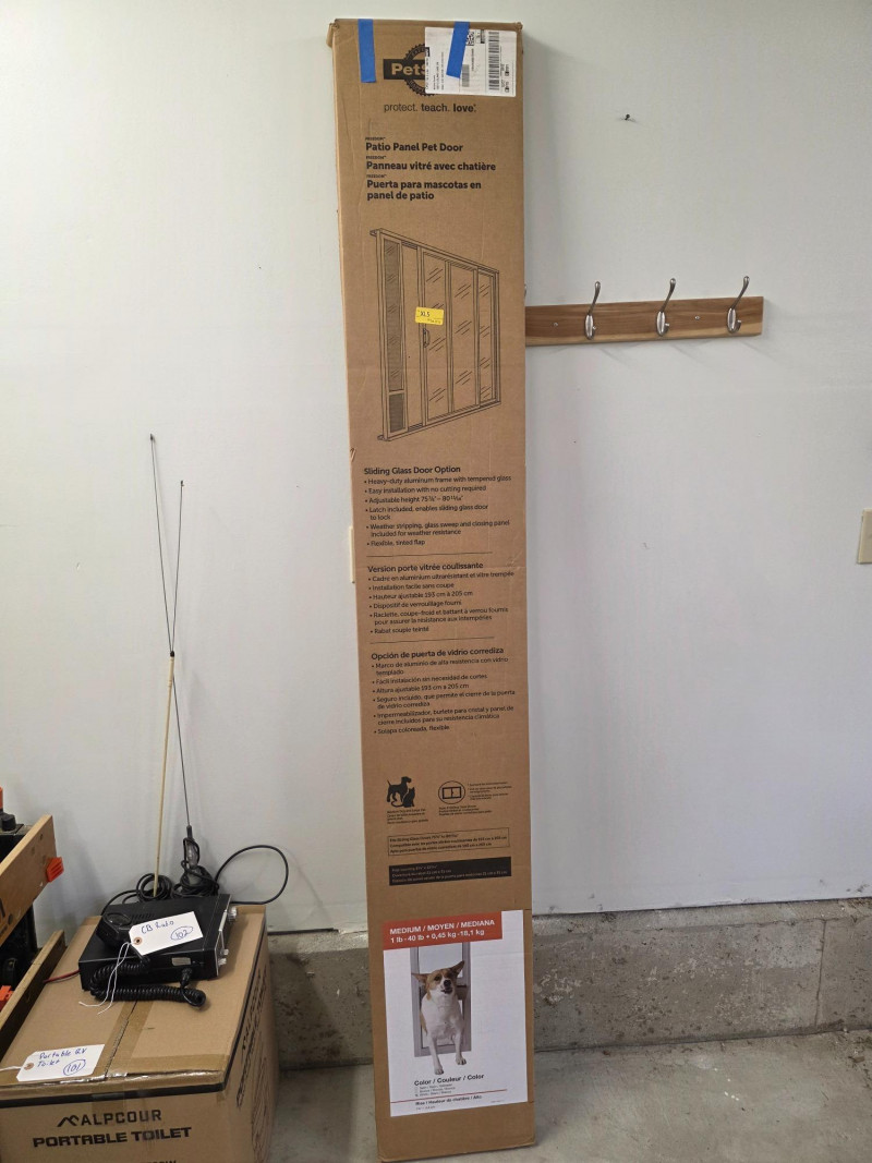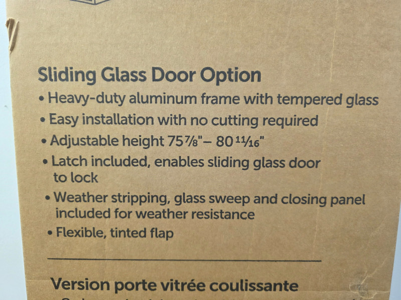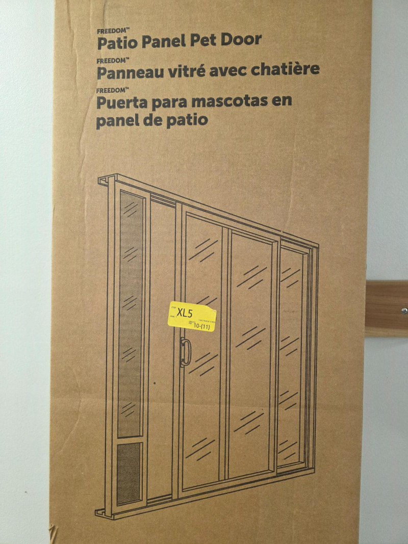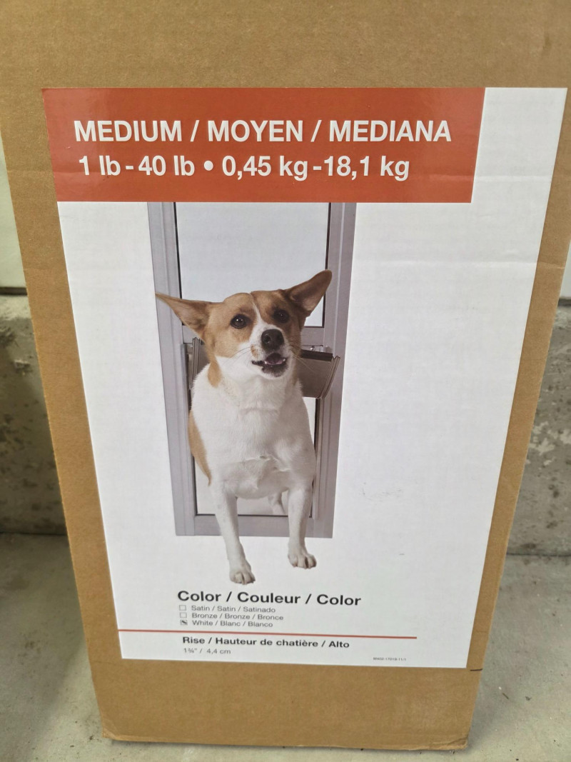 PetSafe Freedom Patio Panel Pet Door New in box PetSafe Patio Panel Door in white Heavy-Duty aluminum frame with tempered glass Adjustable Height 75 7/8" - 80 11/16" Medium door for up to 40lb dog Box dimensions: 82"T x 12.5"W New In box