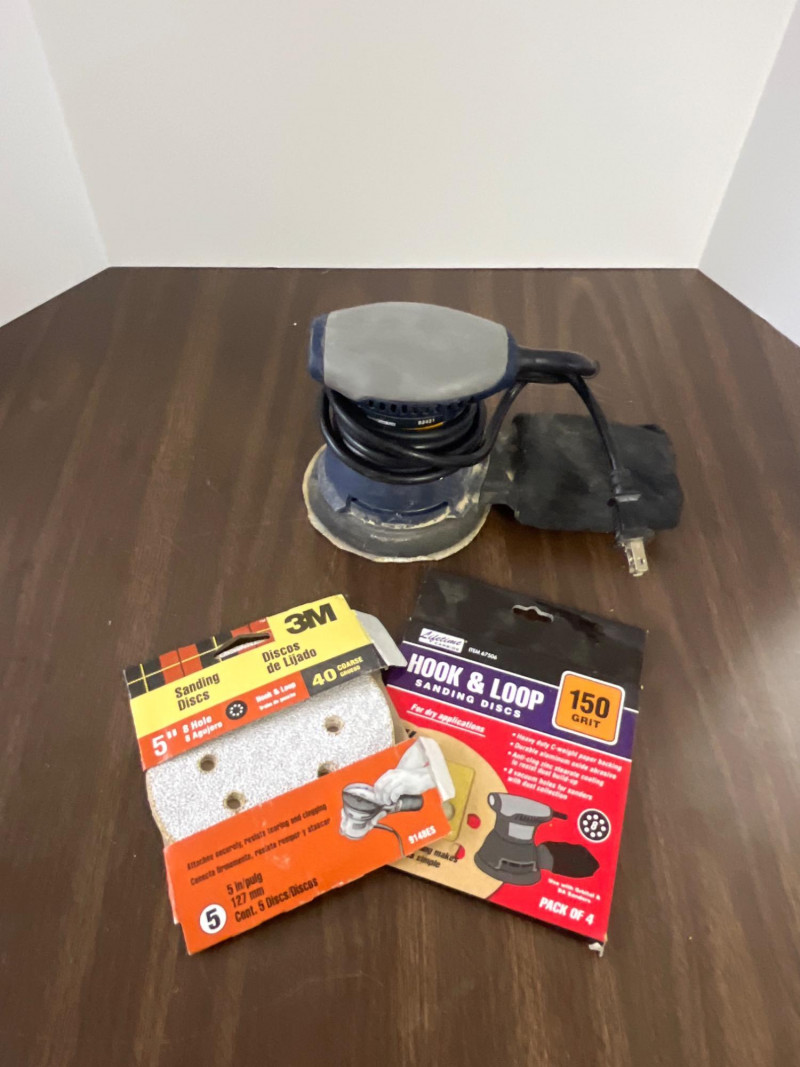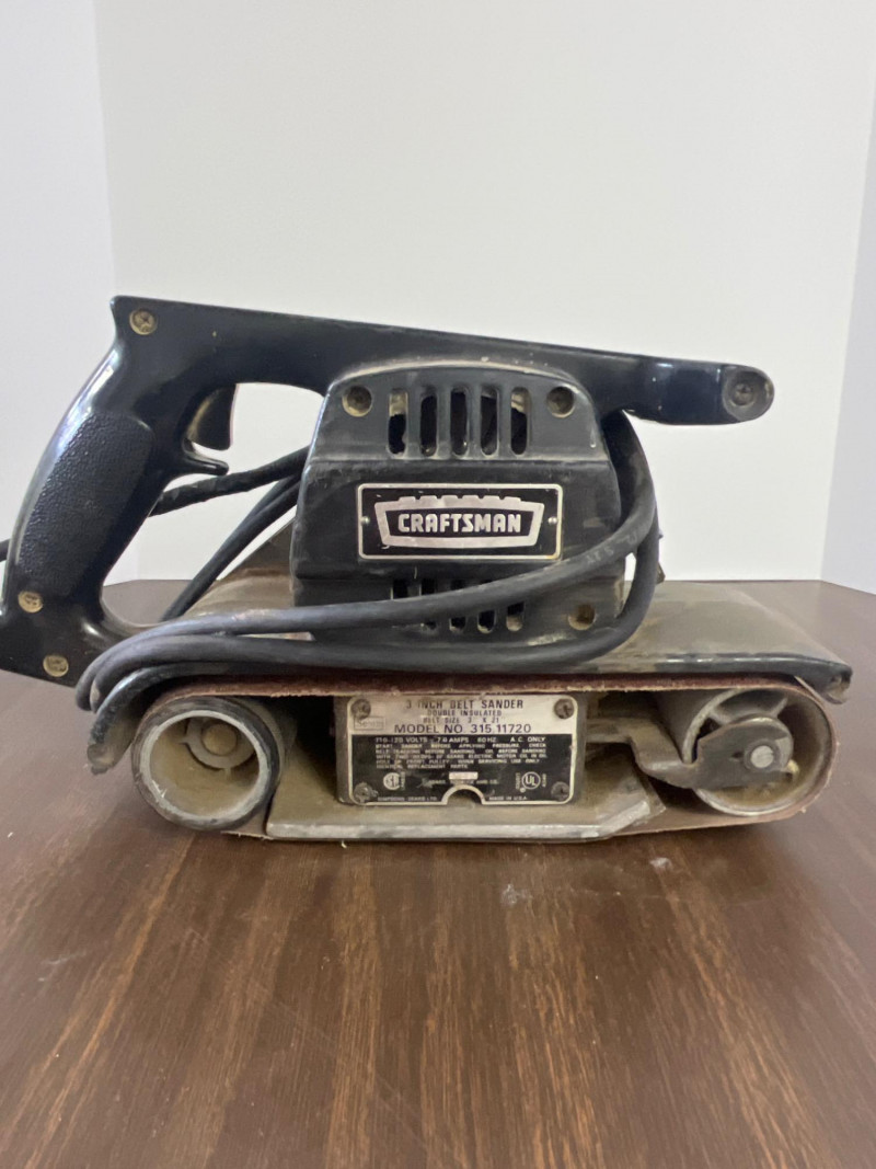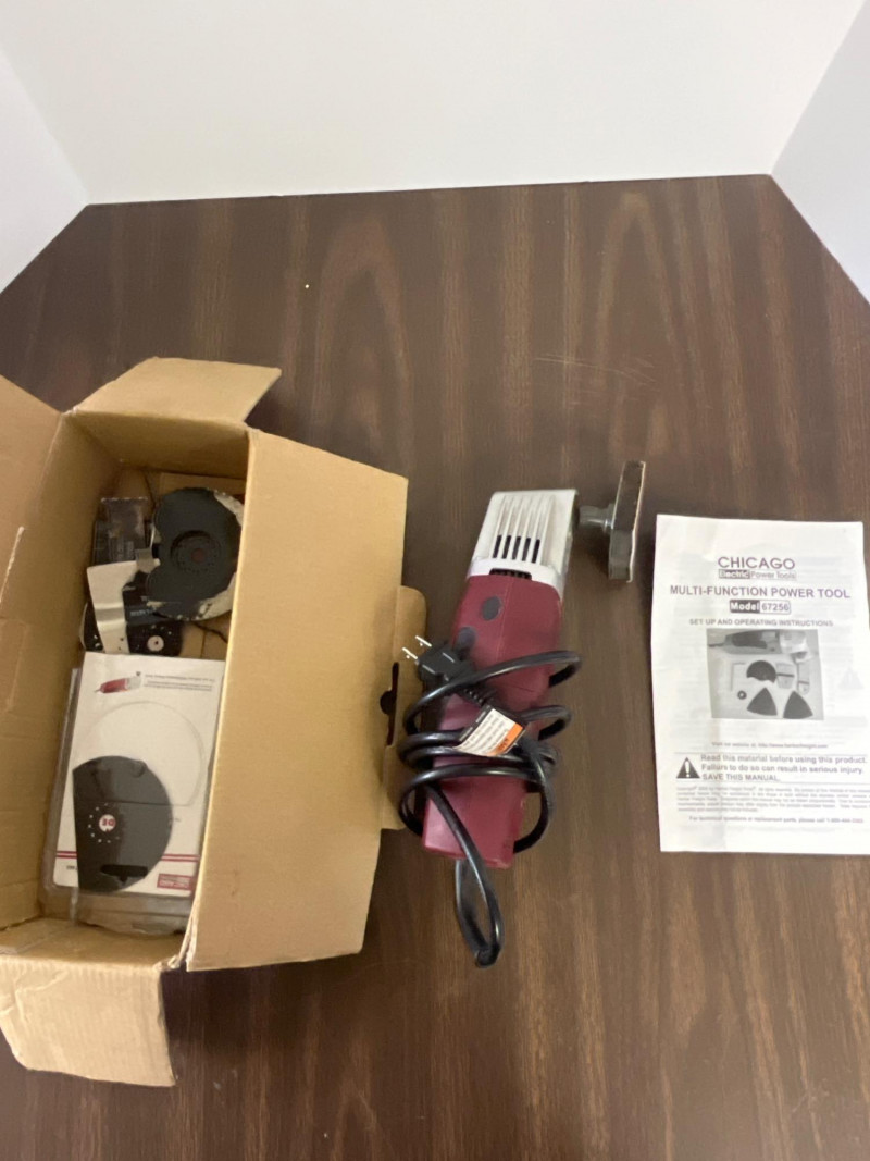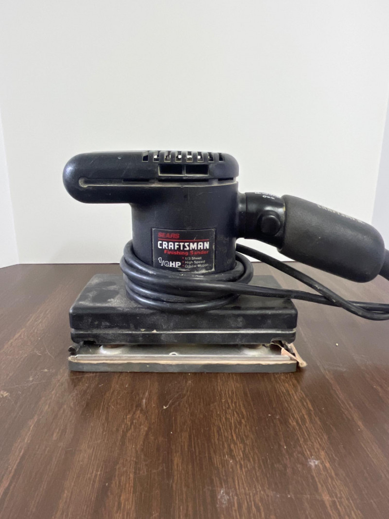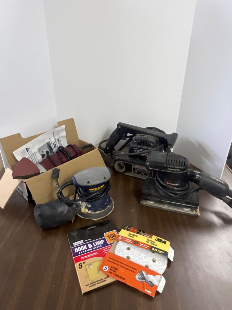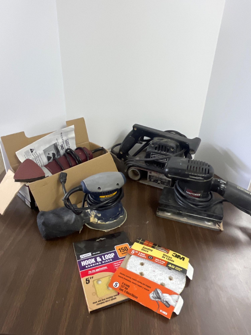 (4) Corded sanding tools Chicago Electric multifunction power tool with accessories Chicago electric orbital sander with extra sanding discs Craftsman 3” belt sander Craftsman finishing sander All tested and in working condition
