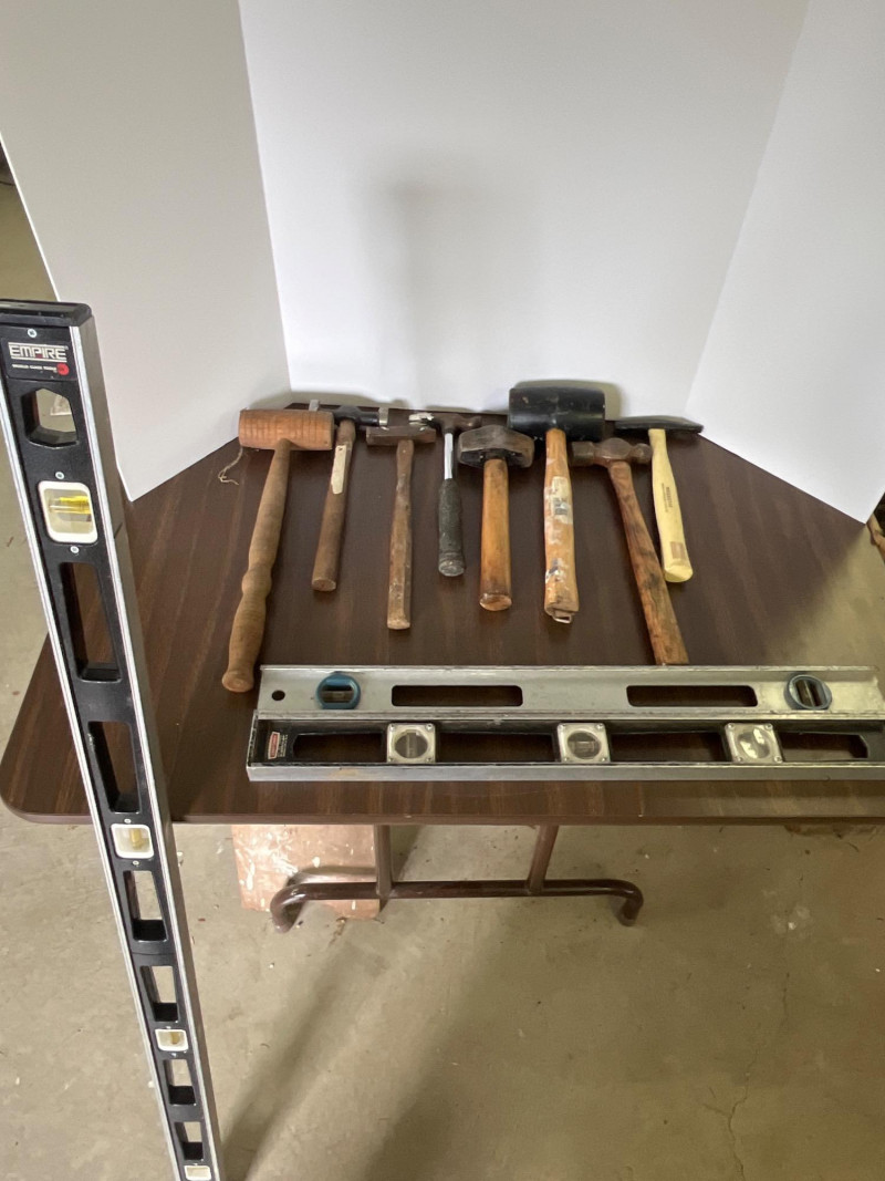Assorted hand tools Empire 48” level Stanley 24” level Craftsman 24” level (8) various hammers