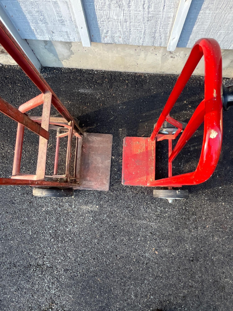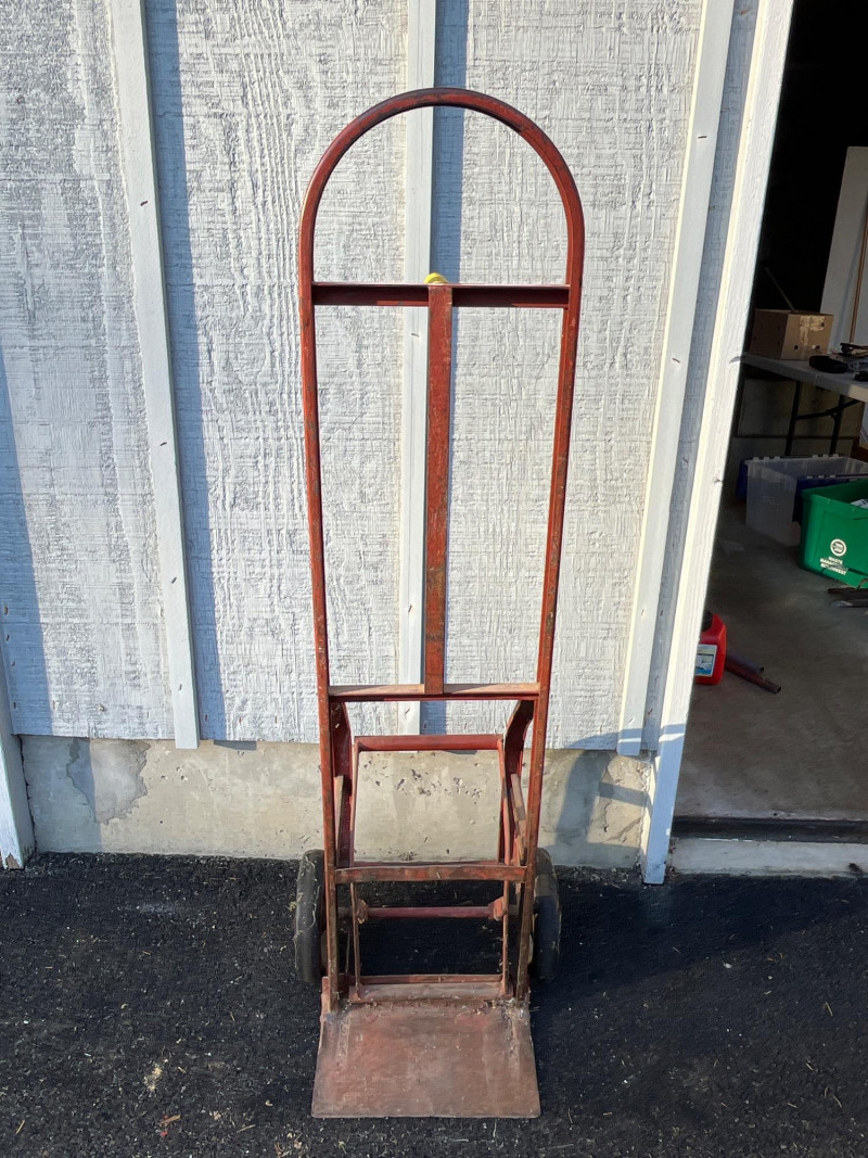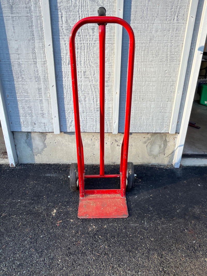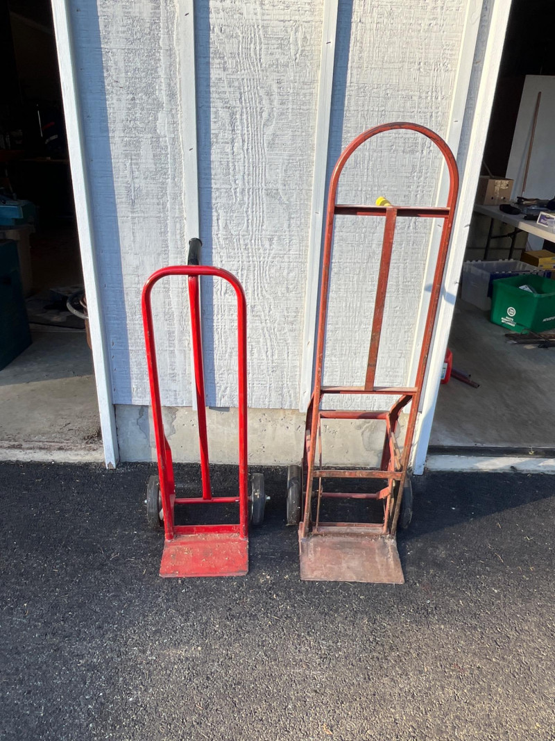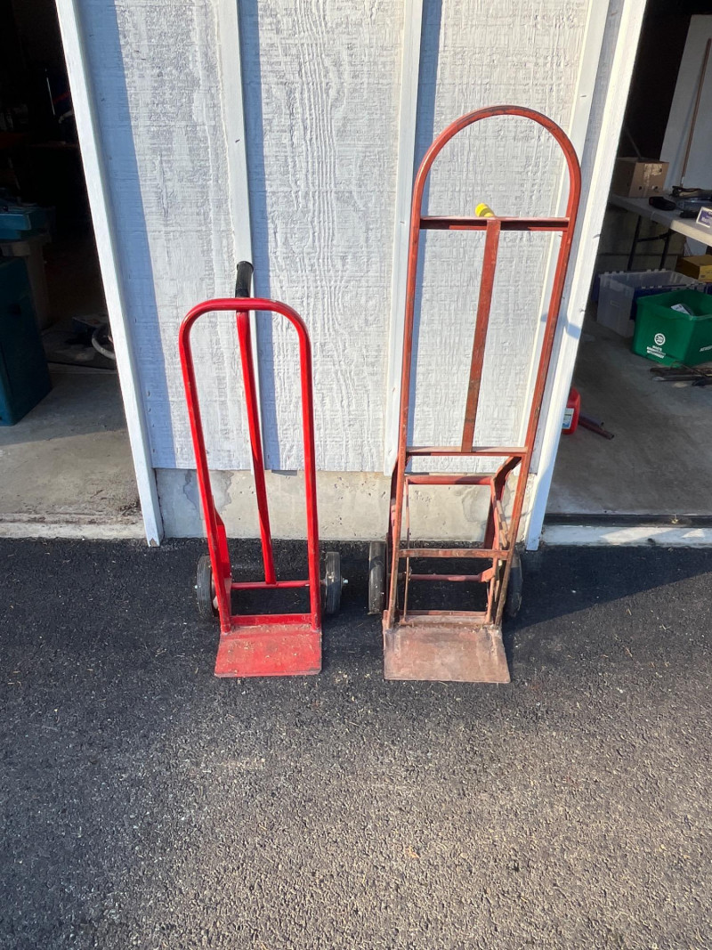 (2) Handtrucks Red handtruck size: 40.5”T x 15”W x 15”D Burgundy handtruck size: 51.5”T x 16.5”W x 15”D Good-Working condition